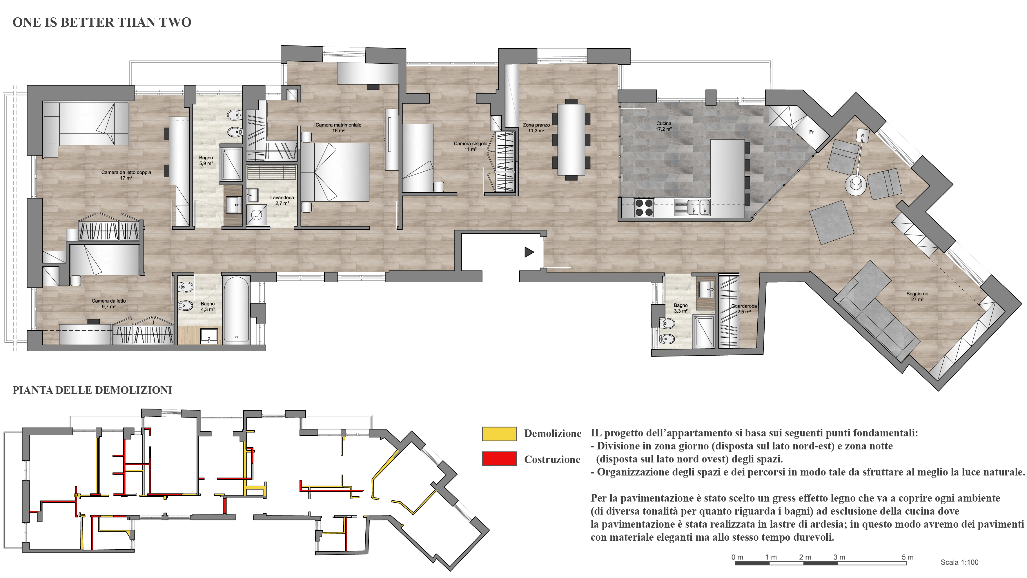 Note that the long side of the flat is a North, while the long terrace is a West. The small windows look at an internal space “chiostra” with limited light. So lighting will be a key element