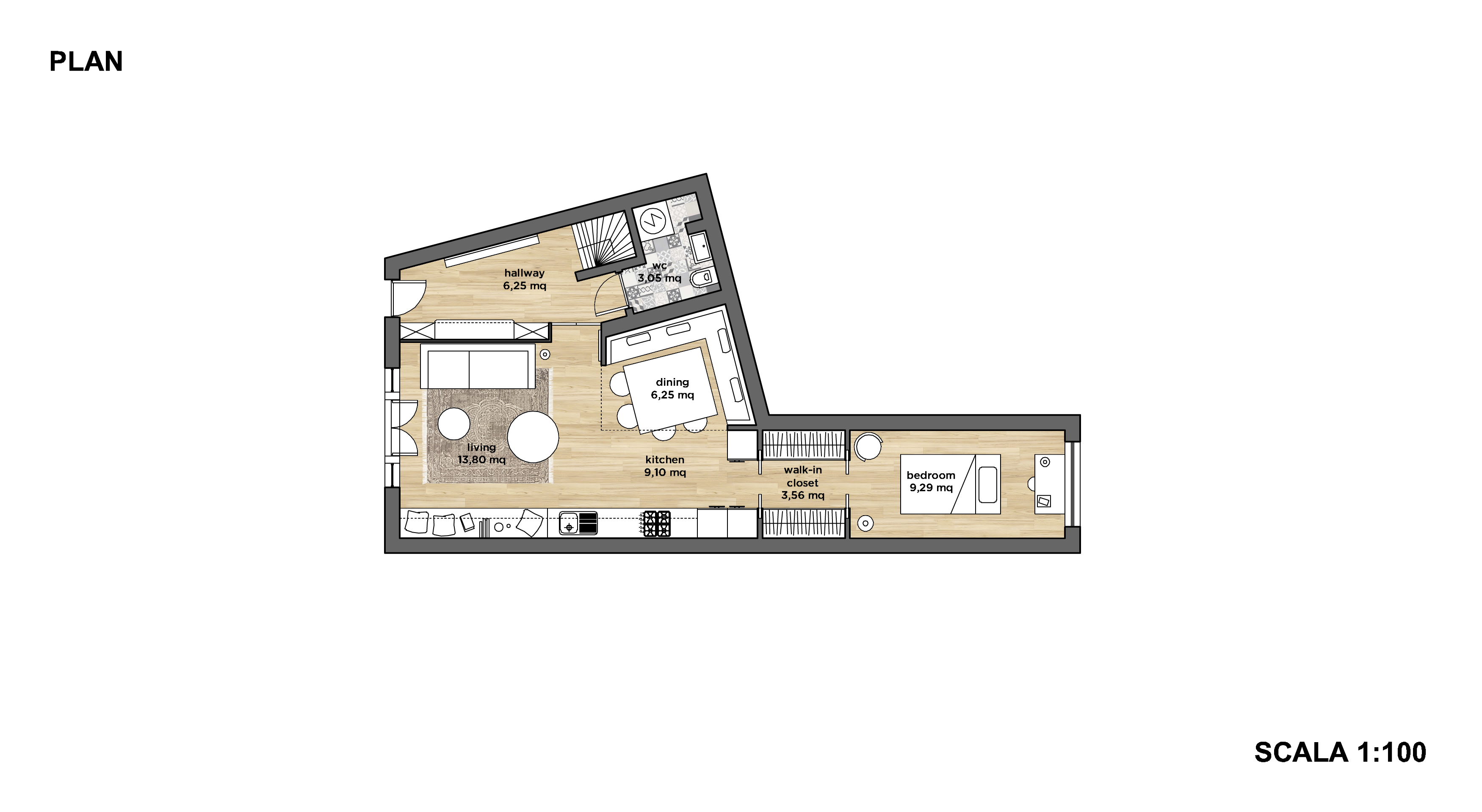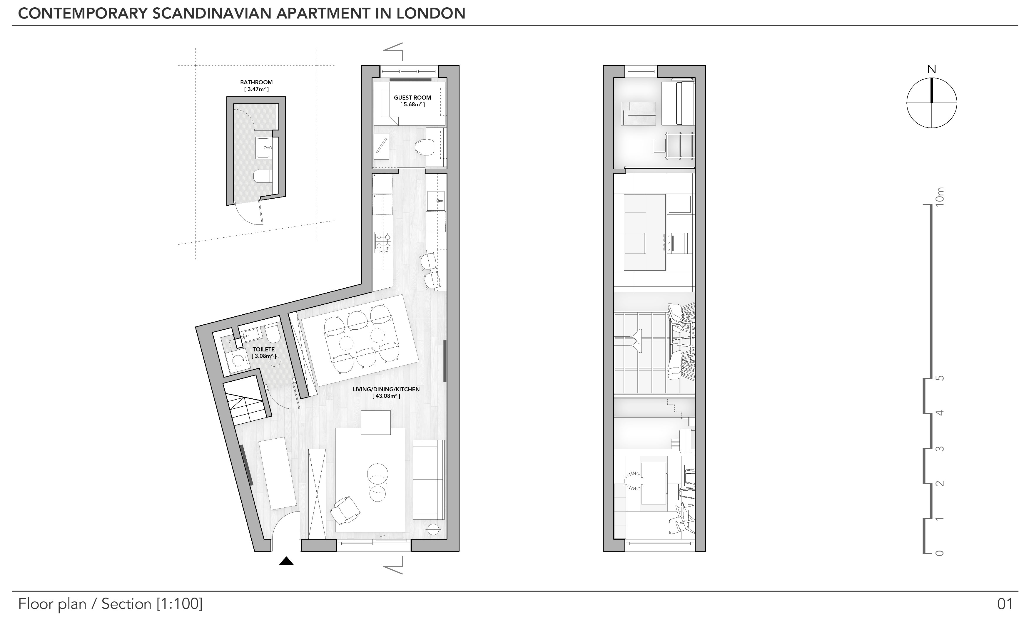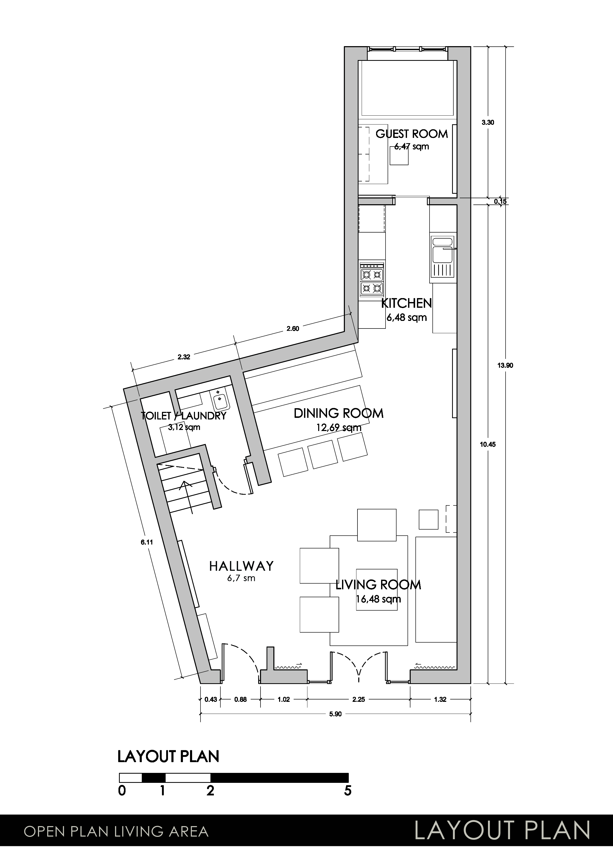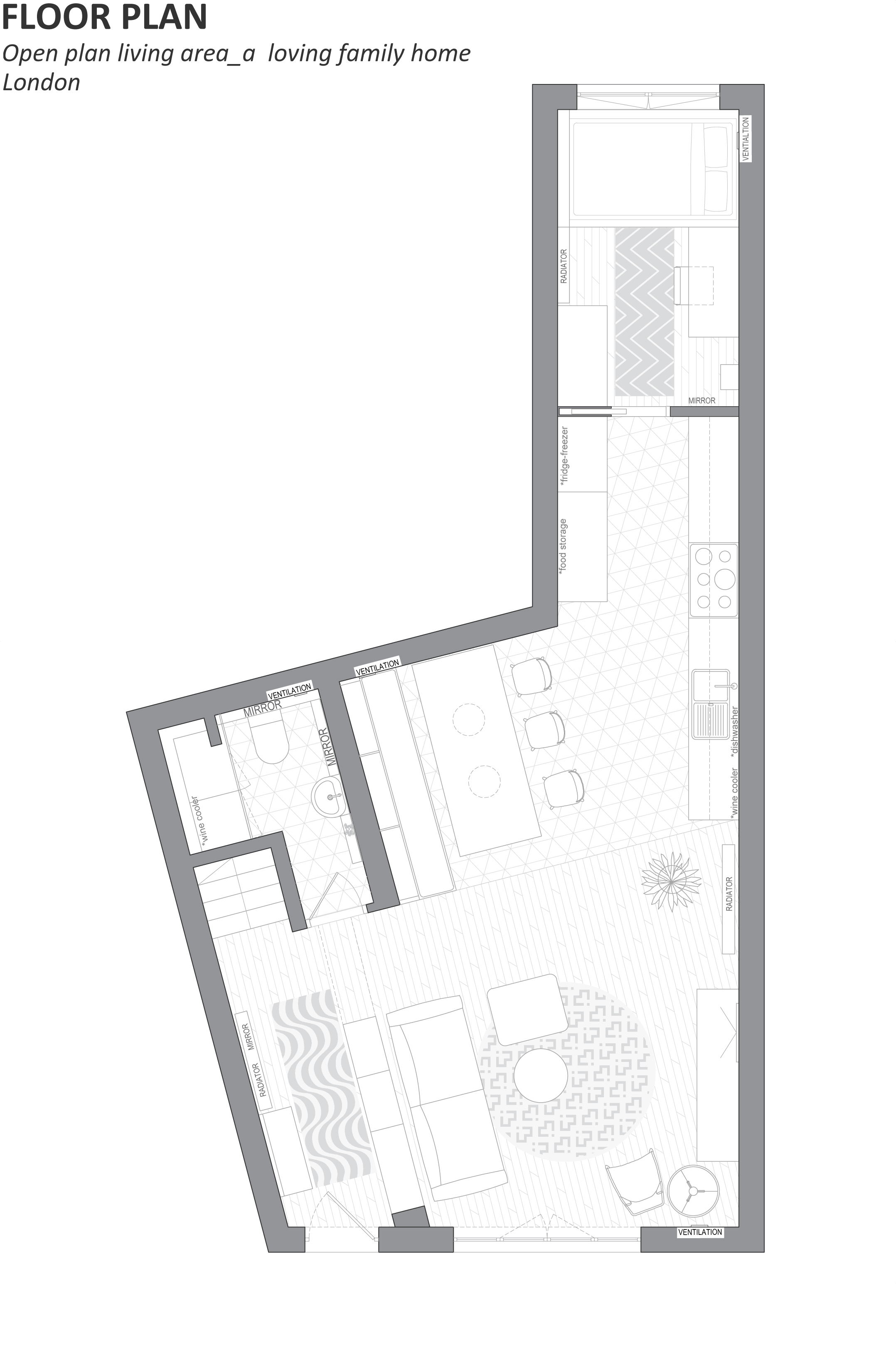 Hi, me and my partner are planning to refurbish our place and we want the entire ground floor remodeled. Our plan is to have a new bedroom at the end of the alcove (end of the kitchen) with room for a 120x200 cm mattress. The dining area should remain on the same place. We don't have a proper hallway today and want something that separate it from the living area. From the patio door we have the sun shining in between 9 AM and 5 PM, unfortunately because the balcony is above the patio the sun don't reach far into the living area. We both love to entertain and cook for family and friends, also we love wine and look forward to install a wine cooler and we are planning to start a family next year. All furniture can be replaced except for the dark blue sofa against the wall. The small toilet need an uplift and we want to keep the washing machine. Our style is mainly Scandinavian as we both are from Sweden, so we love Danish and Swedish design. Thank you for reading this, we hope you will help us to make this place a loving family home.