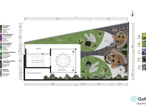 There must be a walkable green part and a part covered by the floor (stoneware or teak).