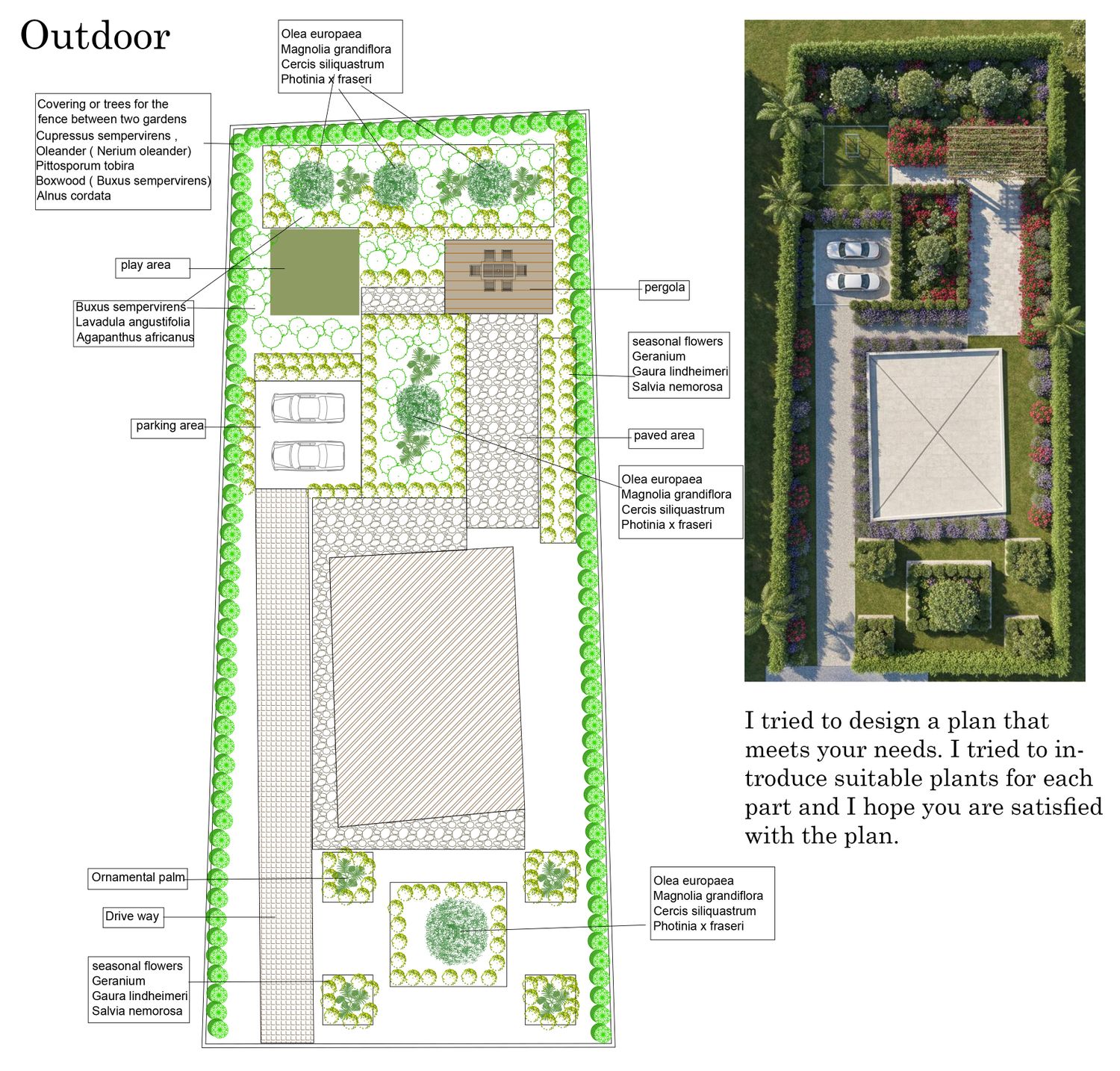 I tried to design a plan that meets your needs. I tried to introduce suitable plants for each part and I hope you are satisfied with the plan.