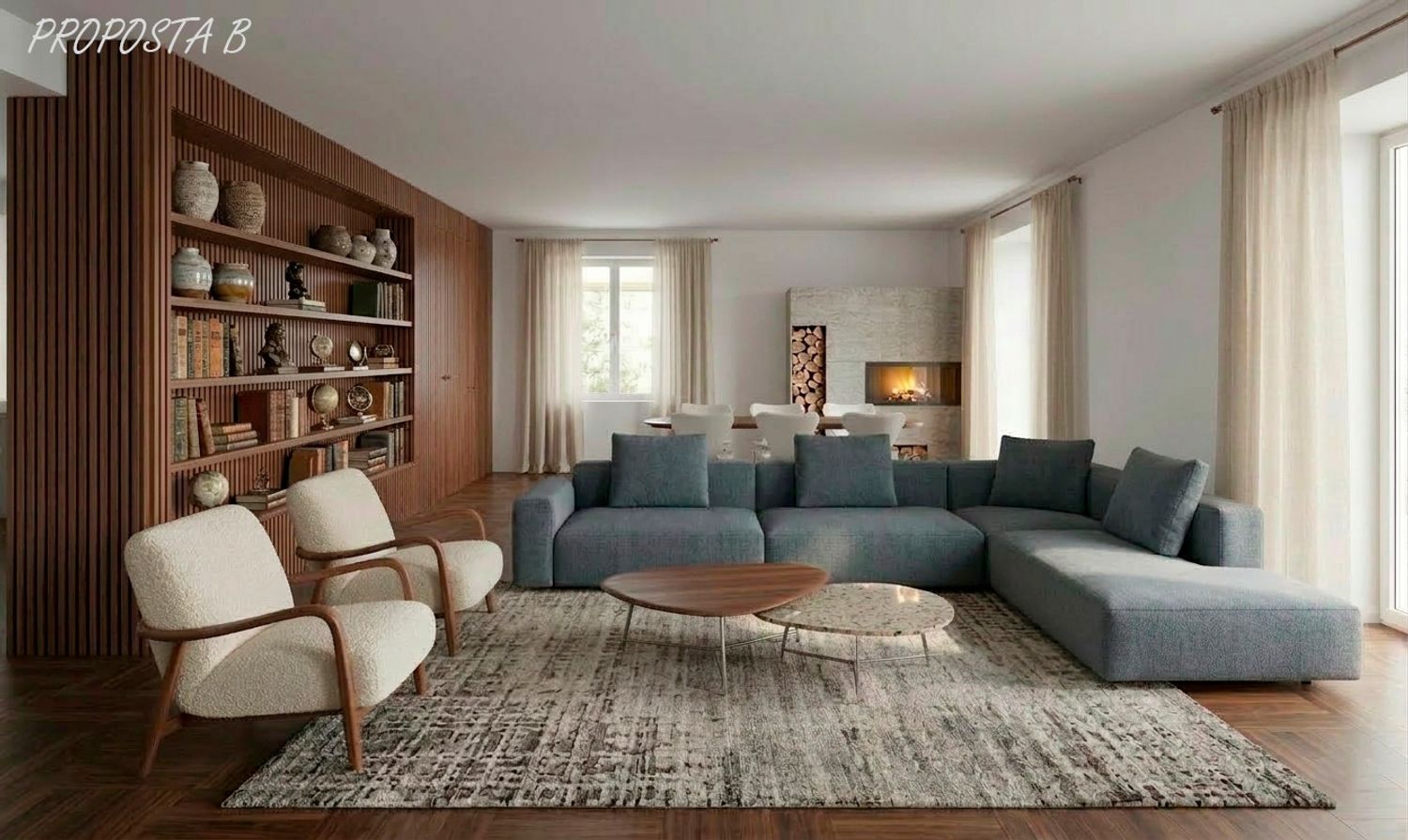 L'obiettivo dell'intervento è la metamorfosi di un ambiente classico in un open space contemporaneo, monumentale e luminoso. Il fulcro del progetto è il mantenimento del prestigioso parquet esistente, inteso non come un limite, ma come l'elemento di calore che dialoga con linee architettoniche pulite e materiali materici (marmo, legno, metallo brunito).