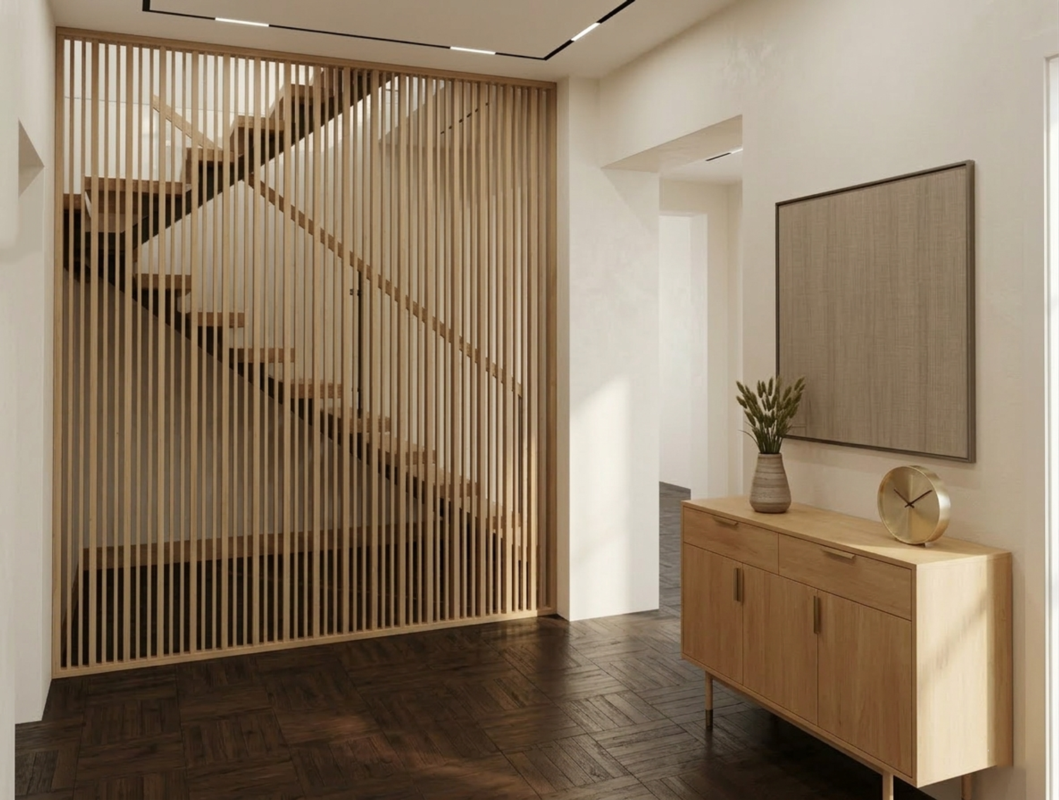 Elementi Scultorei: Il vano scale centrale viene valorizzato da una schermatura a listelli di legno verticale che funge da filtro visivo, garantendo privacy senza occludere il passaggio della luce naturale proveniente dalle grandi vetrate.