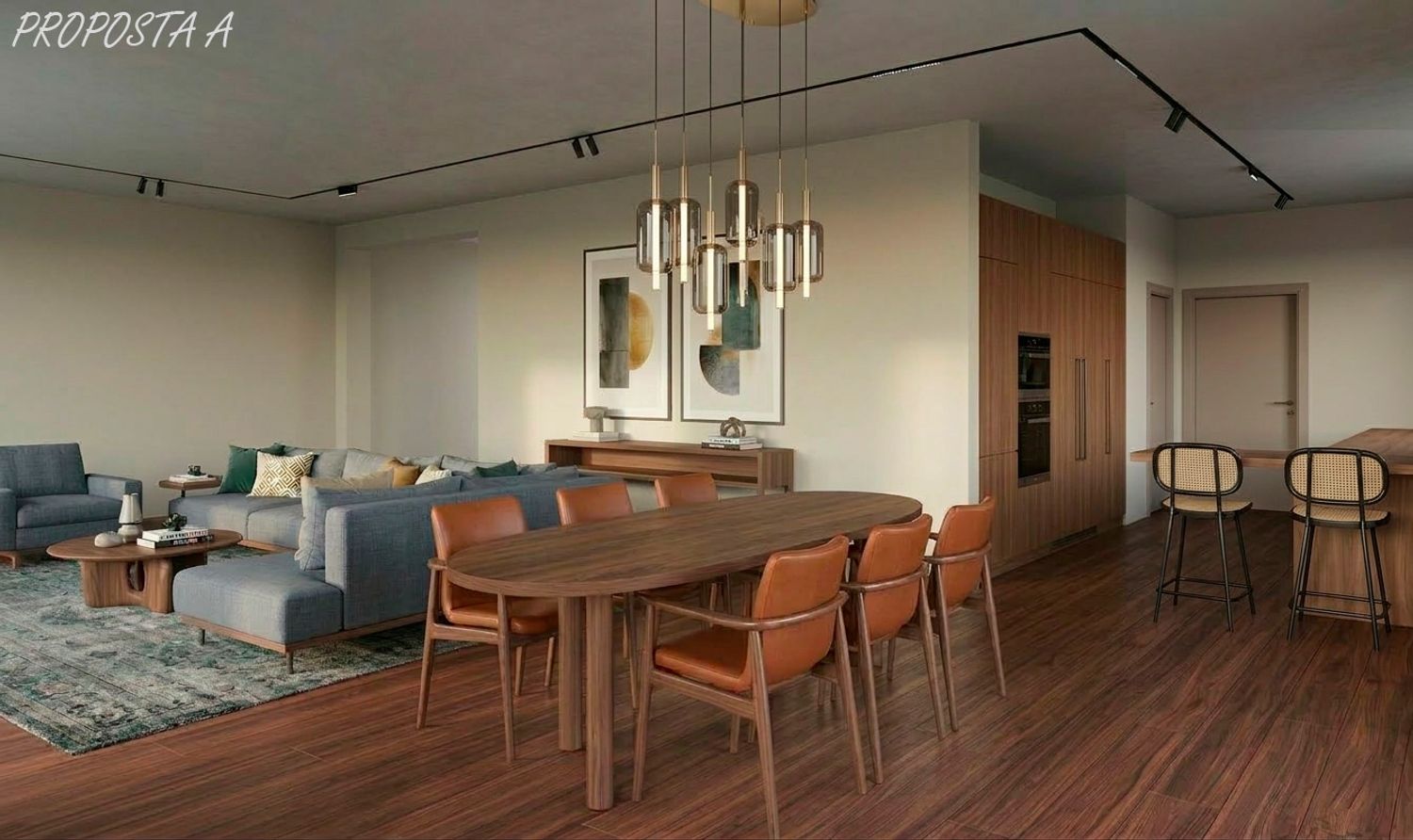 Illuminazione: Binari magnetici incassati a soffitto per una luce tecnica puntuale, alternati a sospensioni decorative sui tavoli da pranzo.