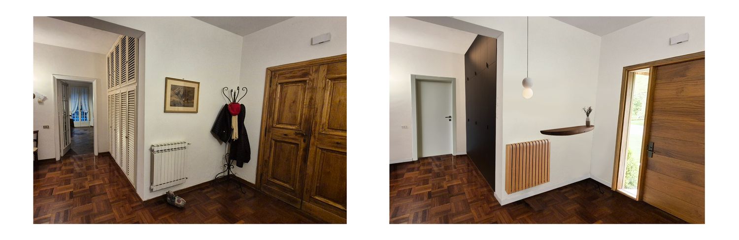 Salve. Il mio progetto parte dal presupposto di dare aria e vibilità al camino e rendere gli spazi comodi sia per passaggio che per ospitalità. Io l' ho inclinato il primo proprio come se guardasse a tutto il living, ma anche semplice angolare e bifacciale, importante, starà benone. La possibiltà di un tavolo rotondo per 6 persone allungabile fino al doppio con lo spazio fisico per farlo.. Le cucine aperte non le amo molto, quindi ho inserito una vetrata scorrevole, ma a vs gusto. Per tale spazio ho lasciato un accesso vicino all' ingresso in modo tale fosse più comodo lasciare la spesa e anche nell' eventualità che dalla zona notte si potesse accedere direttamente alla cucina senza passare per il living, ad esempio nel caso di ospiti. Il sottoscala così usato per il bagno permette di avere un soffitto piano, nulla vieta di lasciare l'inclinazione delle scale se si vuole maggiore altezza, quella minima è comunque garantita in entrambi i casi. Una parte più bassa della scala l' ho sfruttata per un ripostiglio, quell' altezza permette di inserire sia strumenti di pulizie che ad esempio valige o altro. Per il mio collage invece, non avendo fornito indicazioni di gusto, ho deciso per una scelta di finiture pulite che riprendessero le varie tonalità del parquet. I battiscopa però diventano bianchi. Saluti