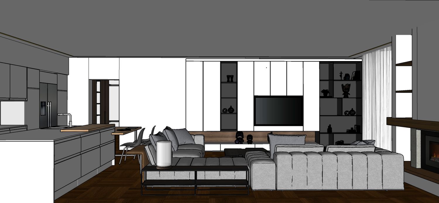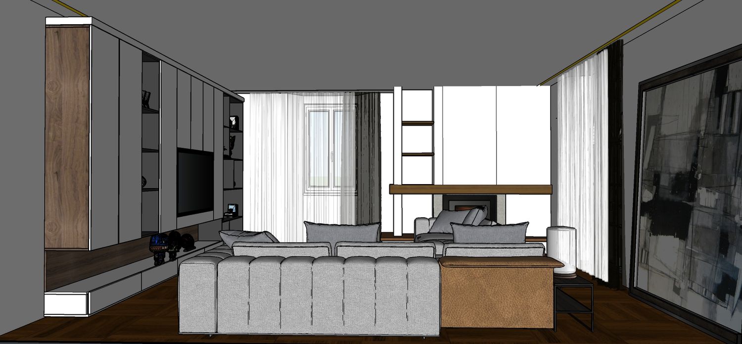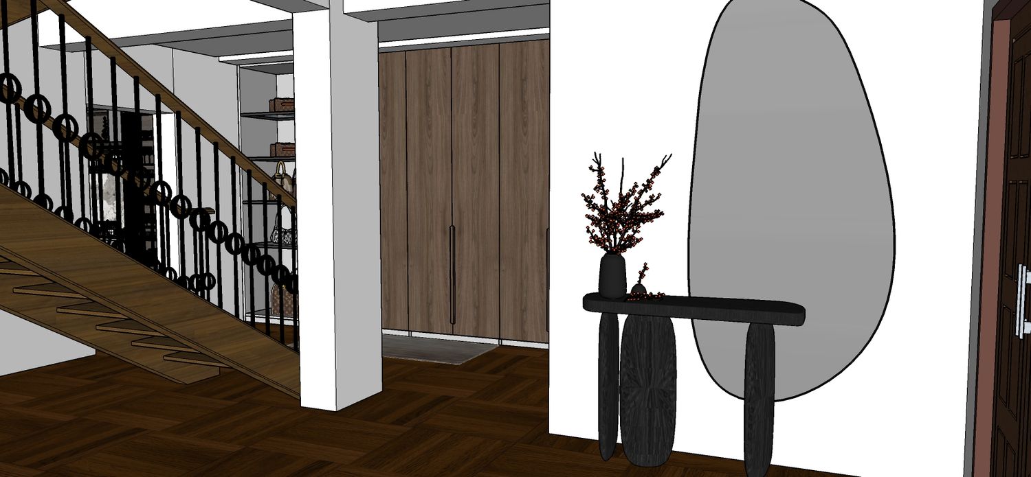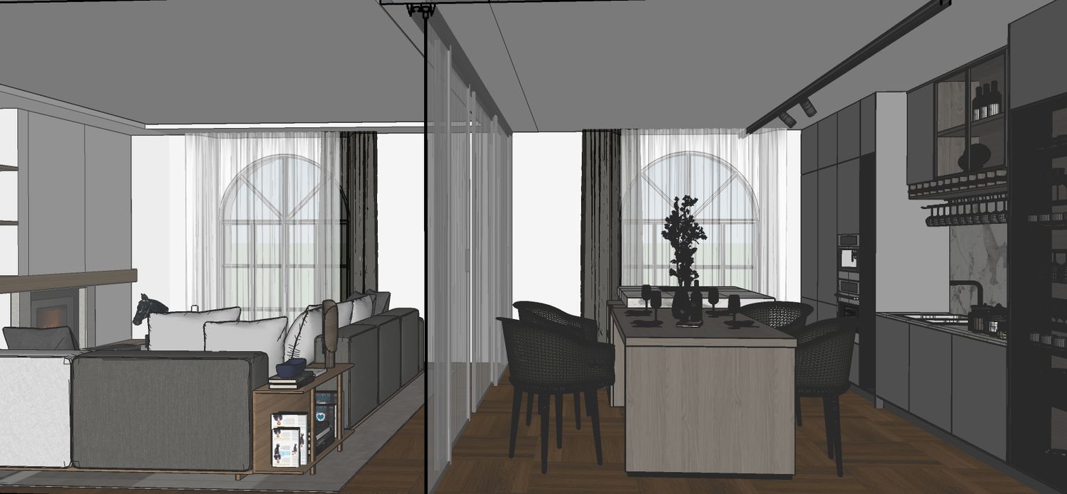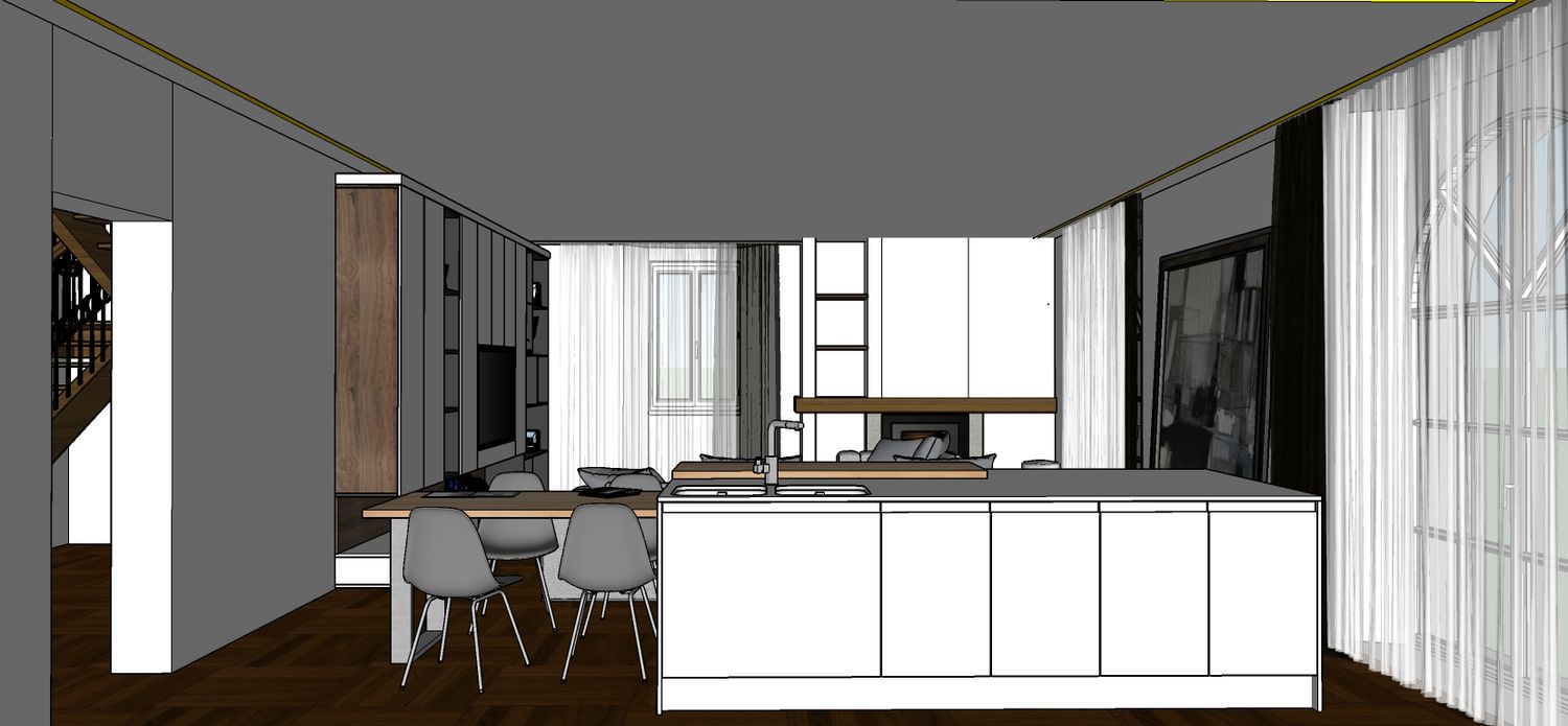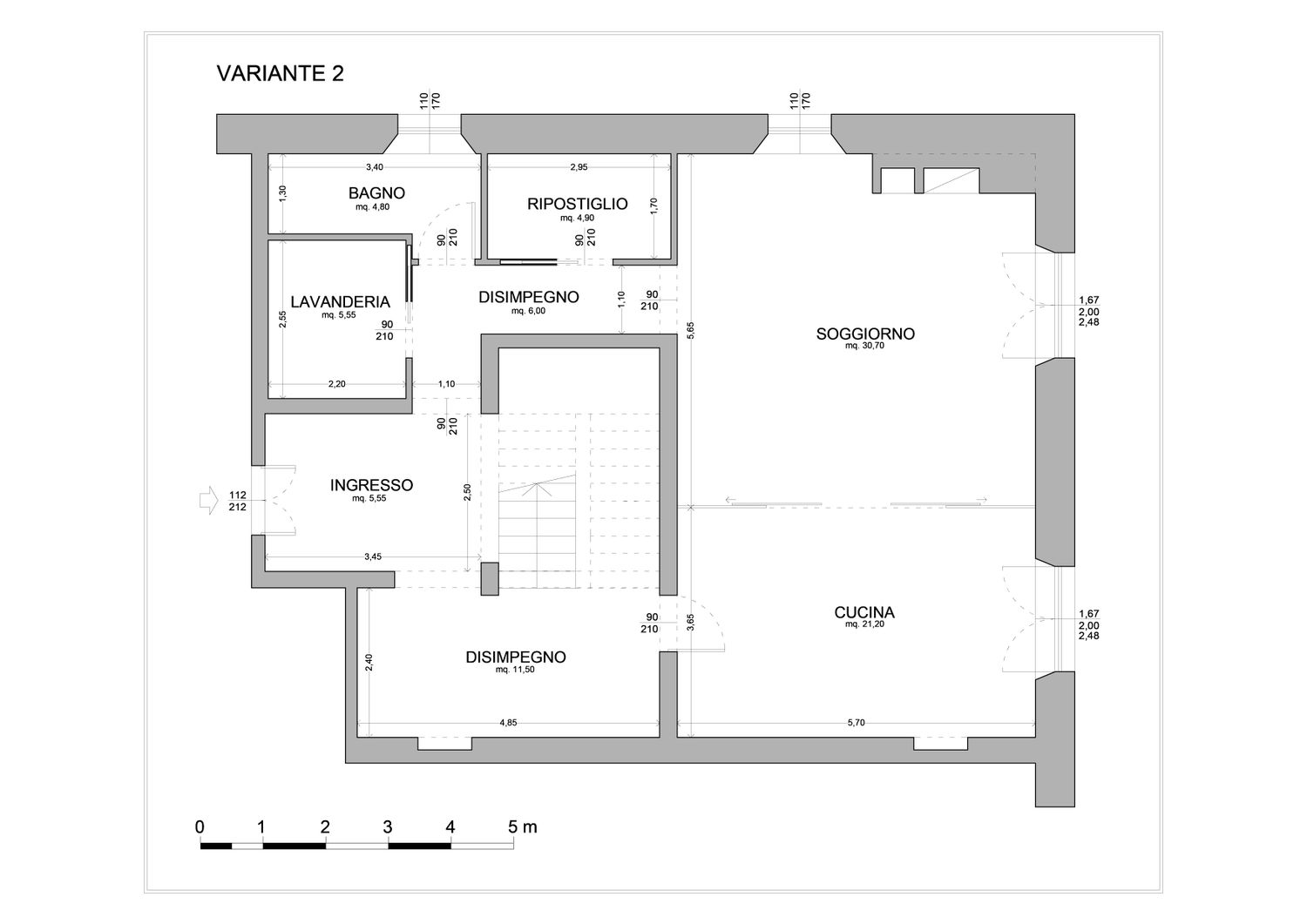 1. Creazione di un'area separata/dedicata con bagno finestrato, lavanderia e ripostiglio, occupando il locale a sinistra dell'ingresso; mantenimento dell'area ingresso/scala, con l'inserimento di una cappottiera con panca e di un elemento specchiera con eventuale mensola o tavolino console svuota tasche; creazione di un'area guardaroba/ripostiglio aggiuntivo nello spazio a destra dell'ingresso, mantenendolo aperto verso la scala. All'interno del salotto viene creato l'ambiente principale, con cucina a vista, dotata di isola e tavolo pranzo integrato, parete attrezzata per tv e libreria, divani, camino.