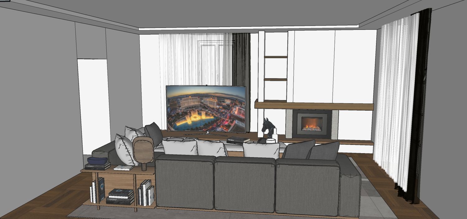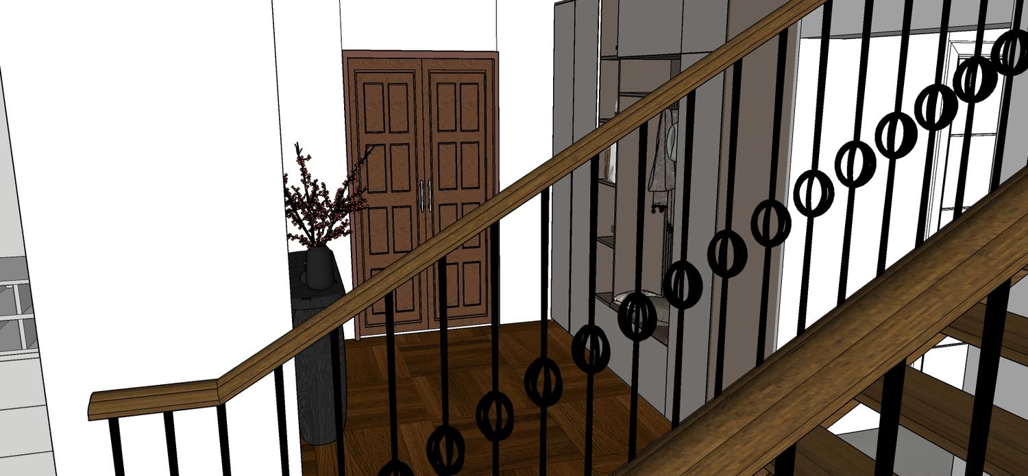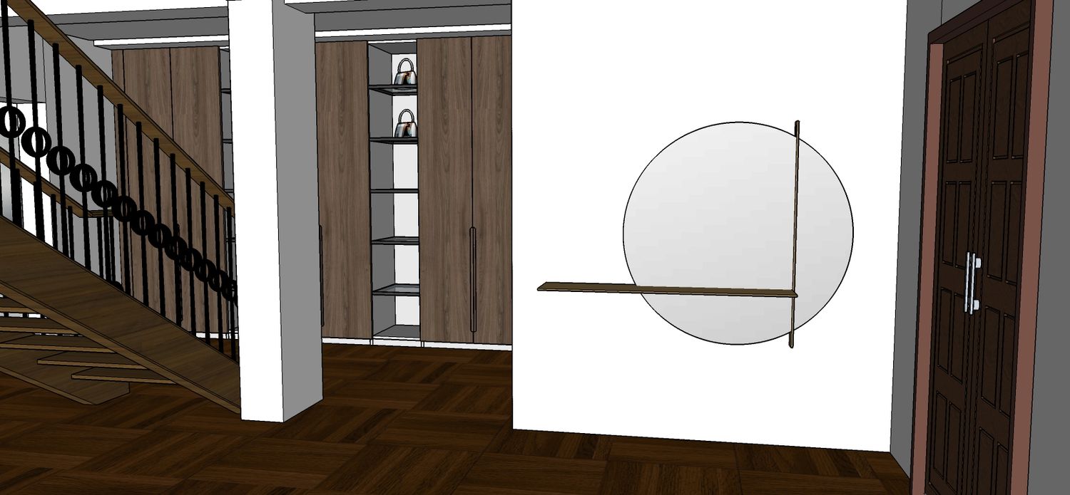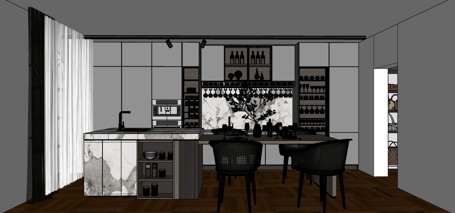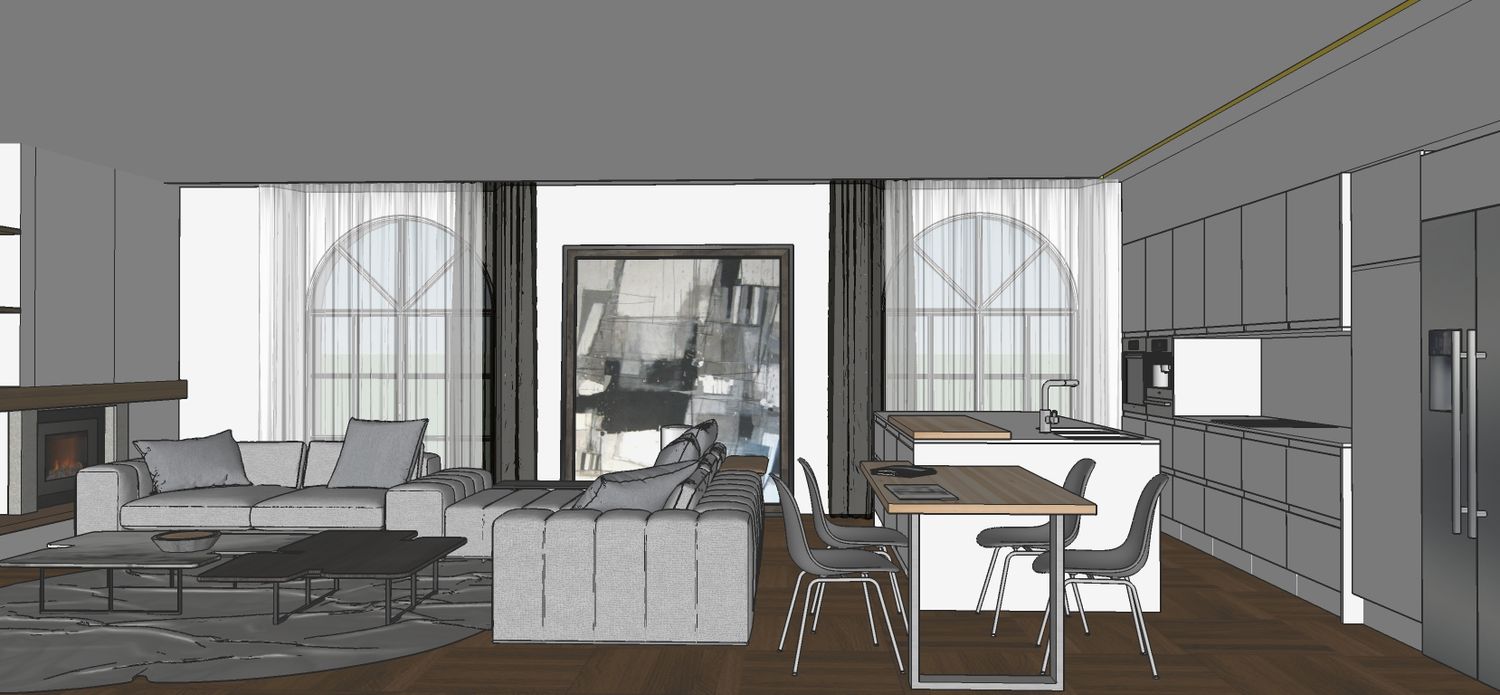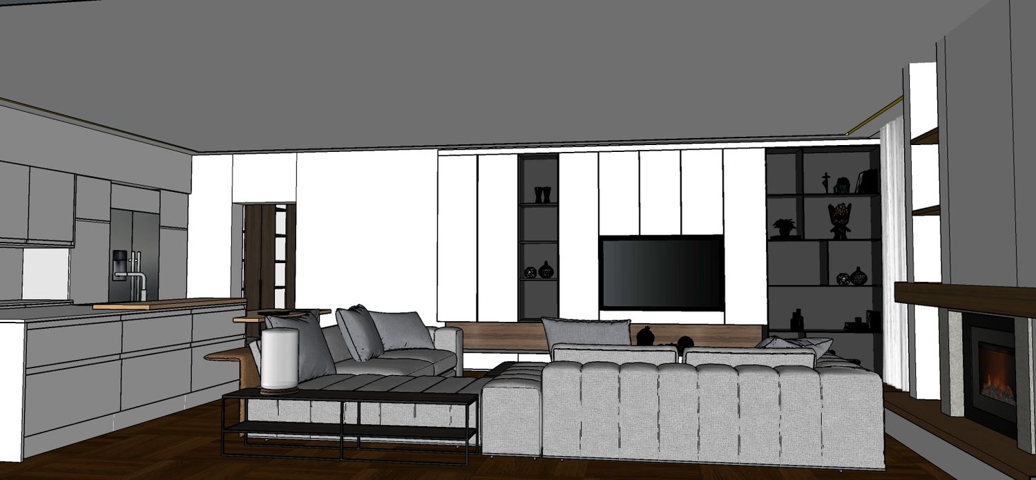 1. Creazione di un'area separata/dedicata con bagno finestrato, lavanderia e ripostiglio, occupando il locale a sinistra dell'ingresso; mantenimento dell'area ingresso/scala, con l'inserimento di una cappottiera con panca e di un elemento specchiera con eventuale mensola o tavolino console svuota tasche; creazione di un'area guardaroba/ripostiglio aggiuntivo nello spazio a destra dell'ingresso, mantenendolo aperto verso la scala. All'interno del salotto viene creato l'ambiente principale, con cucina a vista, dotata di isola e tavolo pranzo integrato, parete attrezzata per tv e libreria, divani, camino.