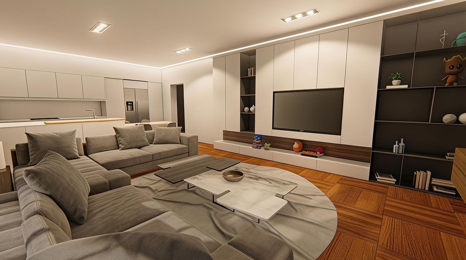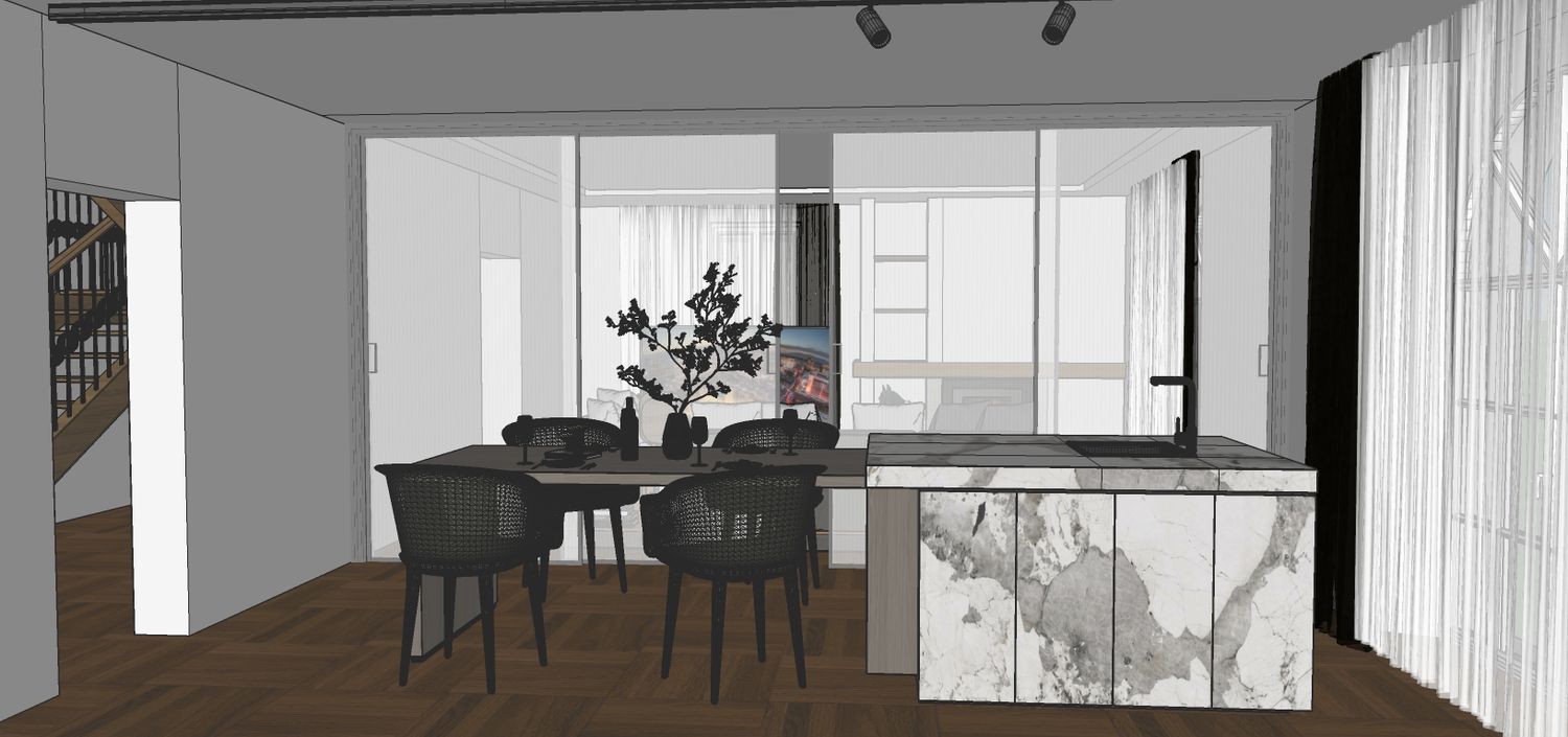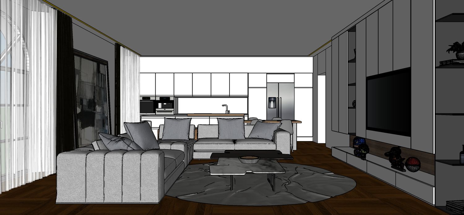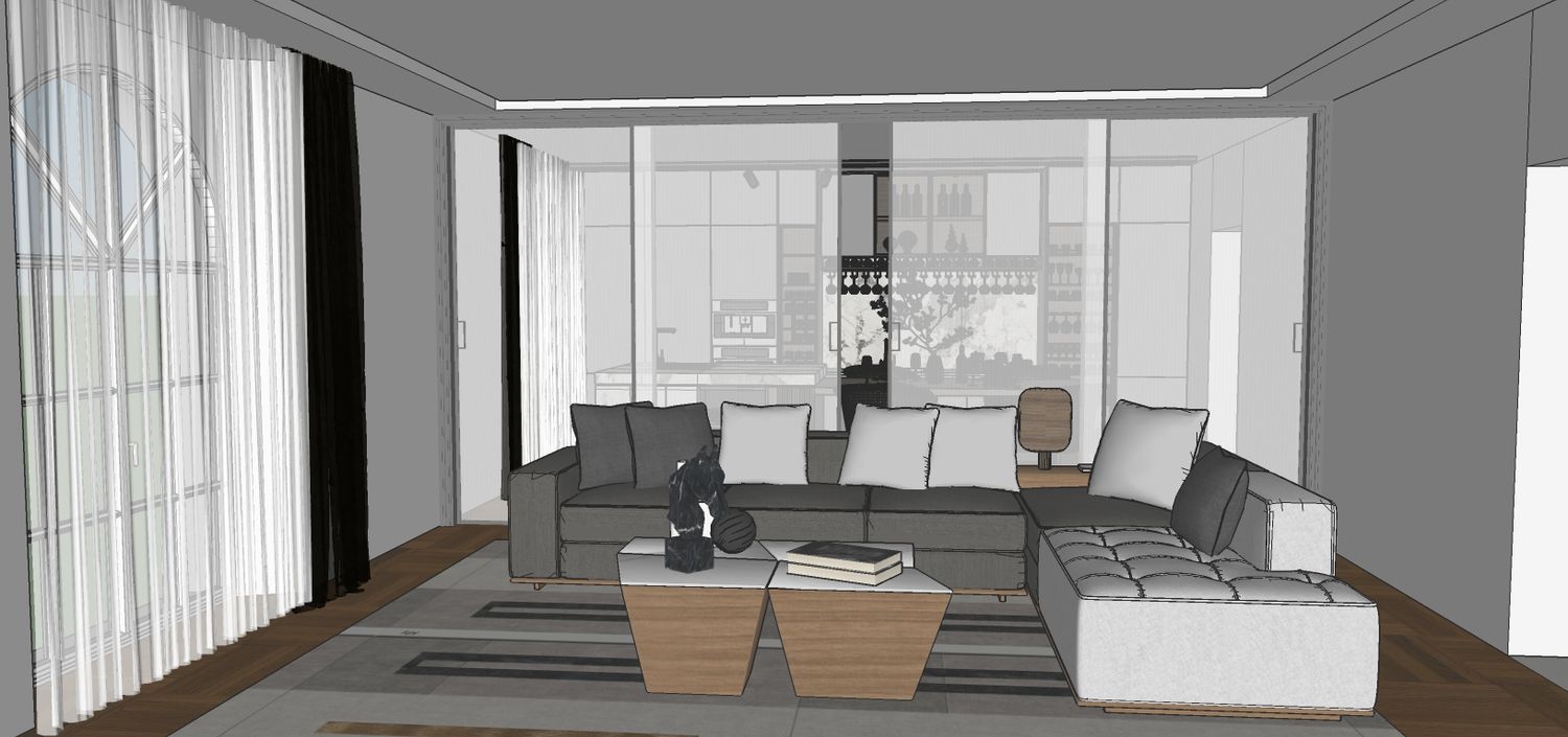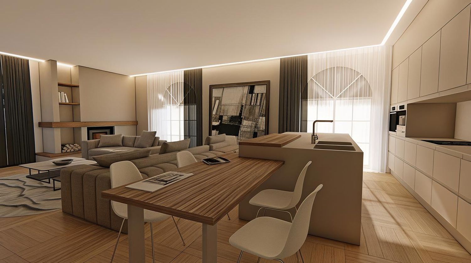 1. Creazione di un'area separata/dedicata con bagno finestrato, lavanderia e ripostiglio, occupando il locale a sinistra dell'ingresso; mantenimento dell'area ingresso/scala, con l'inserimento di una cappottiera con panca e di un elemento specchiera con eventuale mensola o tavolino console svuota tasche; creazione di un'area guardaroba/ripostiglio aggiuntivo nello spazio a destra dell'ingresso, mantenendolo aperto verso la scala. All'interno del salotto viene creato l'ambiente principale, con cucina a vista, dotata di isola e tavolo pranzo integrato, parete attrezzata per tv e libreria, divani, camino.