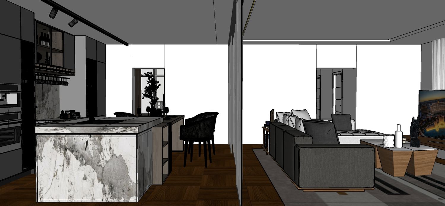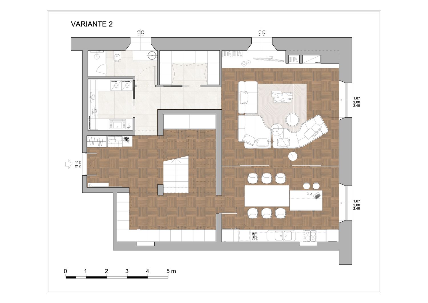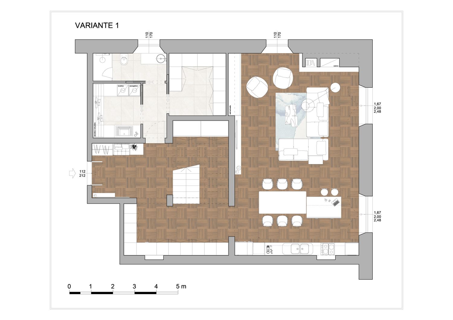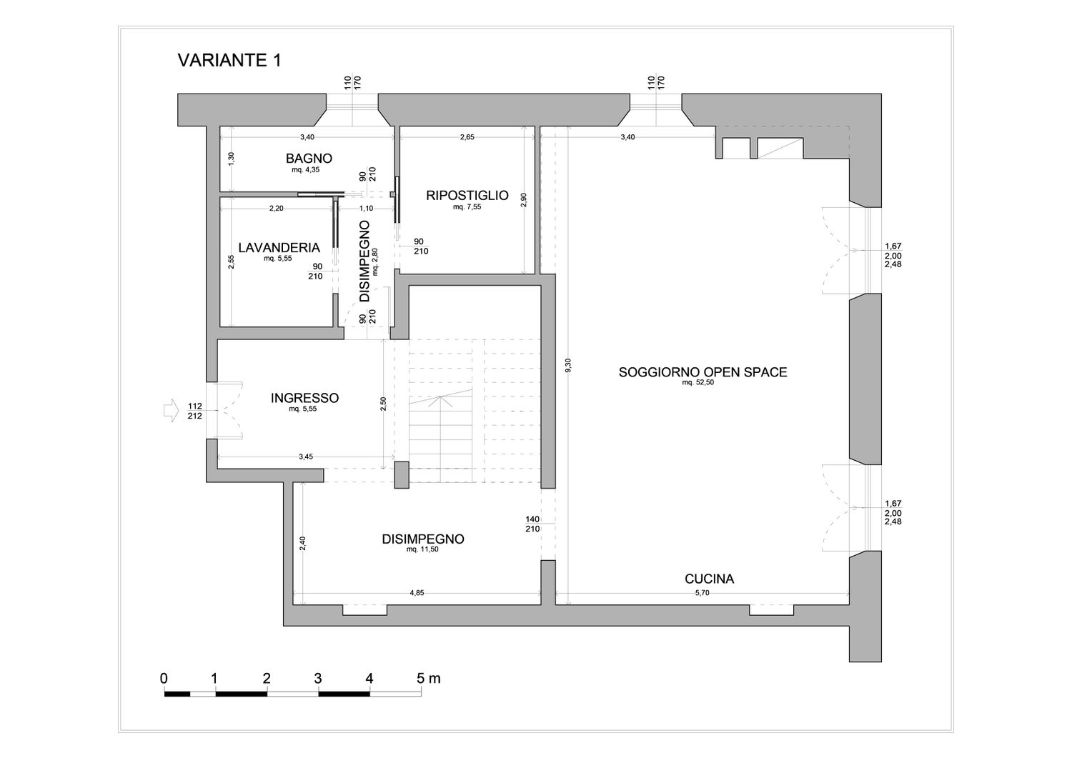 Il nostro progetto include due proposte distributive per l'ambiente zona giorno/servizi, ferme restando le murature principali esistenti (in cui sono previsti alcuni interventi con cerchiatura, per la modifica dei varchi, ma non spostamenti) e ferma restando al struttura e la posizione della scala. Nello specifico: