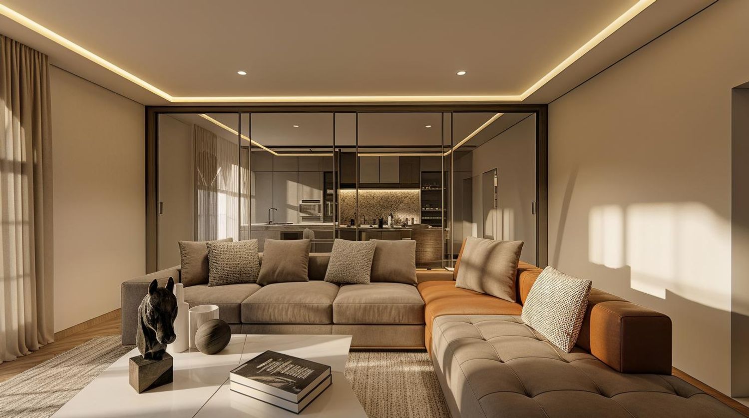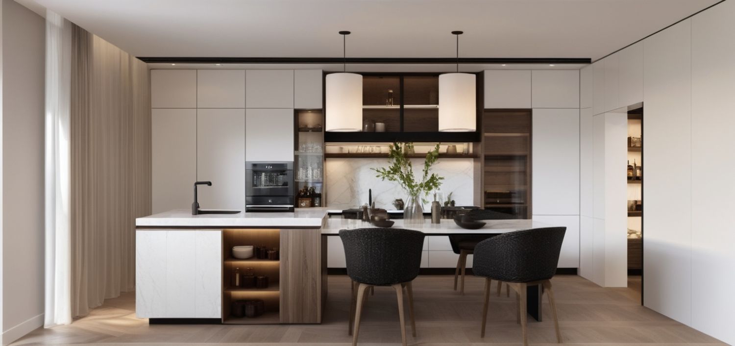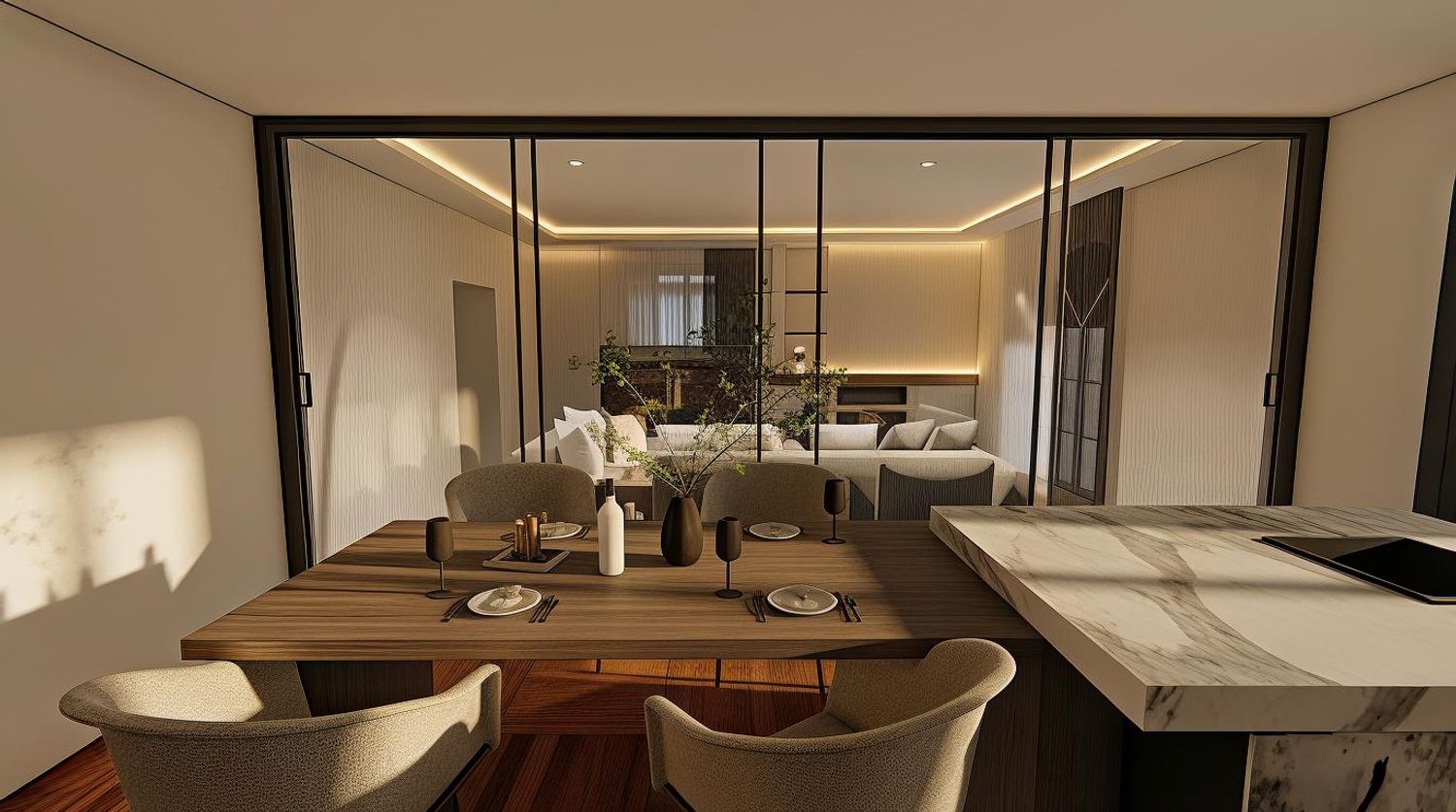 2. In questa variante, cucina e soggiorno occupano ancora il locale principale, ma sono separabili tramite una parete vetrata dotata di ante scorrevoli; è creato un accesso circolare dall'area bagno/servizi, che rende indipendenti i due spazi giorno in caso di necessità (es. chiusura della cucina per prevenire odori); l'area guardaroba è separata dall'area cucina tramite una porta, il ripostiglio e la zona soggiorno hanno una configurazione leggermente diversa, ed è creato un piccolo disimpegno nell'area servizi.