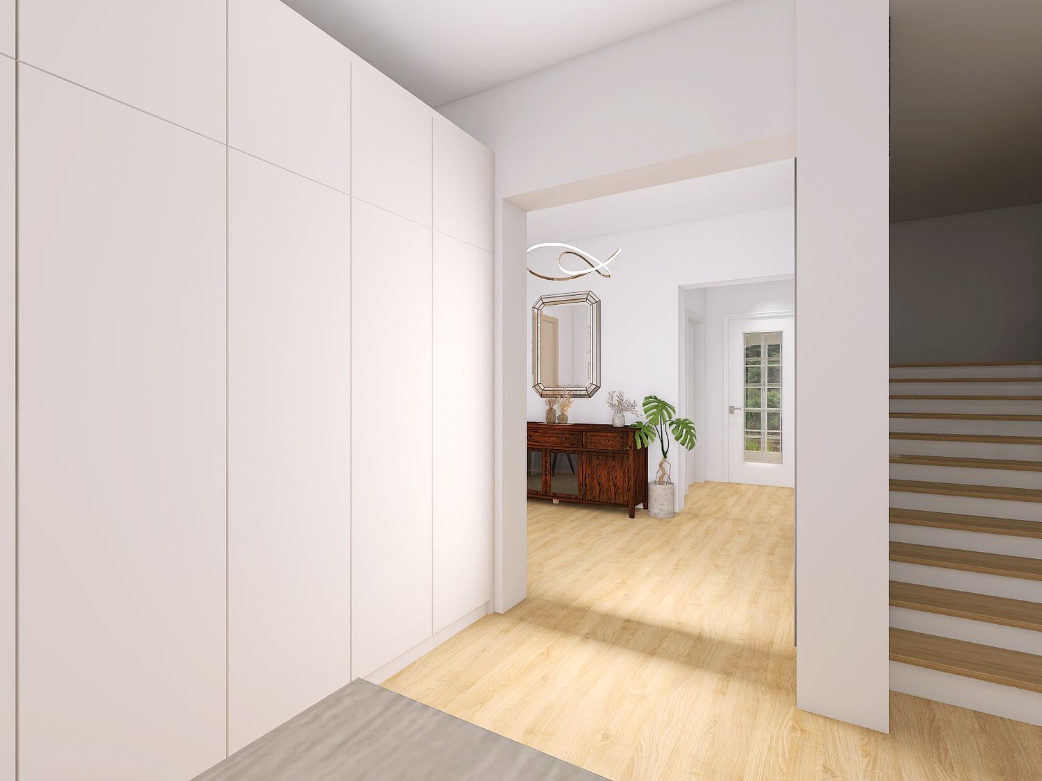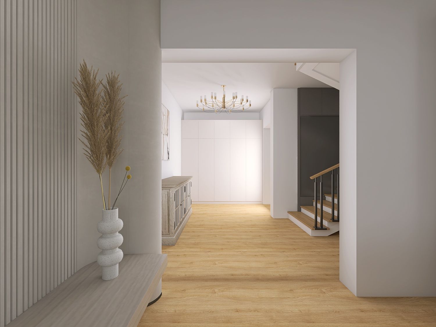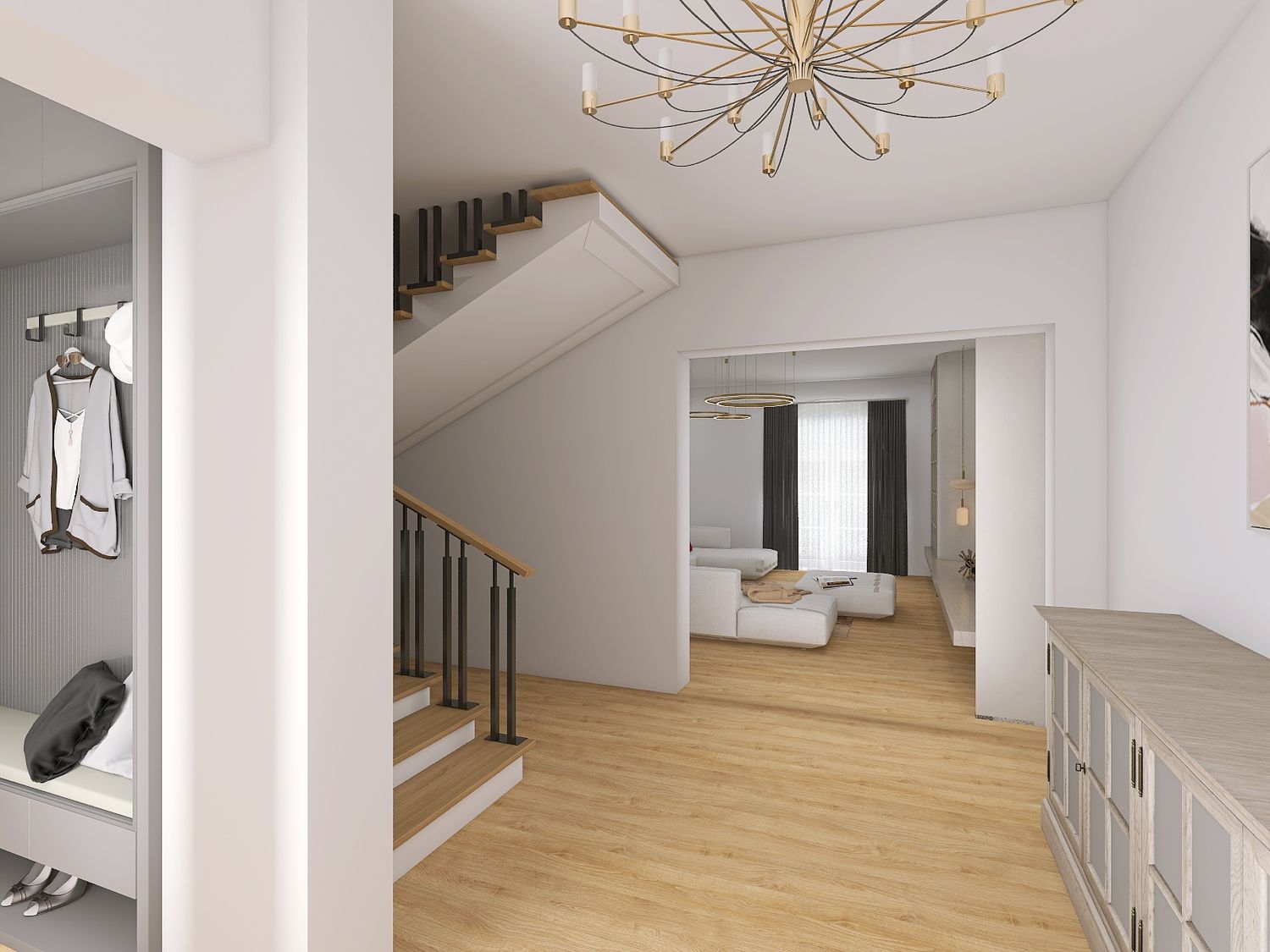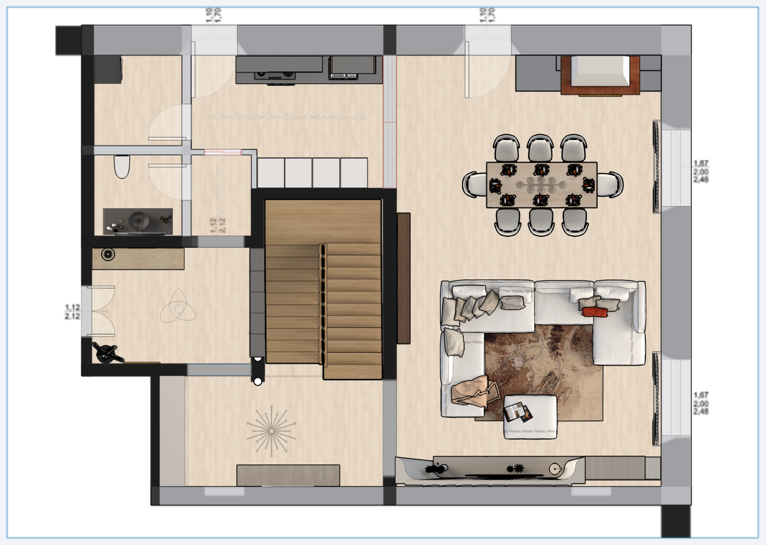 nel mio progetto ho cercato di sfruttare ogni cm e di creare un'ingresso attrezzato con un'armadiatura che si inserisce davanti la scala e crea una divisoria, un disimpegno infondo le scale con armadi riempitivi nascosti, dando comunque carattere a questa zona di passaggio, le scale restano integre senza nessuna modifica, una grande sala con zona tv e zona pranzo, una cucina con delle vetrate scorrevoli che fanno si che possa essere annessa alla zona giorno ma divisa se necessario, dalla cucina si può accedere ad una lavanderia, e tramite un disimpegno ad un bagno di servizio che si può raggiungere anche dall'ingresso, creando cosi un flusso di fruizione e passaggio che gira tutto intorno alla scala sia in senso orario che antiorario. gli arredi sono esempi ma l'idea è integrare antichi pezzi d'arredo a pezzi nuovi, consiglio di inserire per ogni pezzo antico uno nuovo per mantenere una percentuale 50% 50% che da carattere alla casa e la rende unica.
