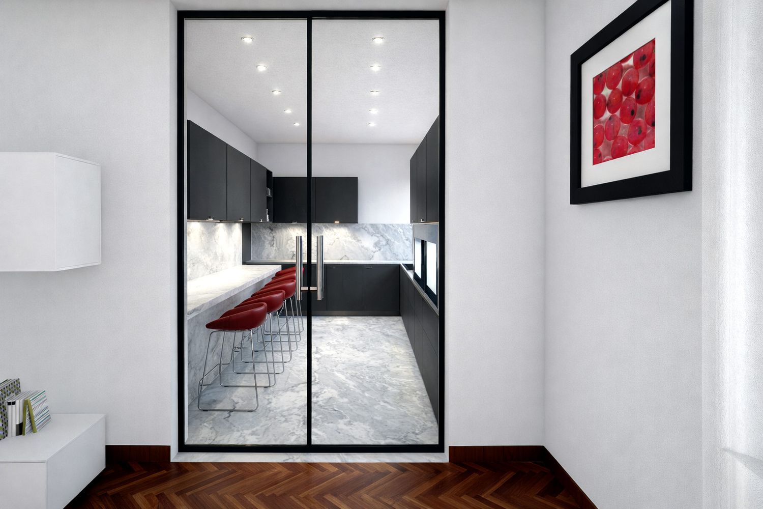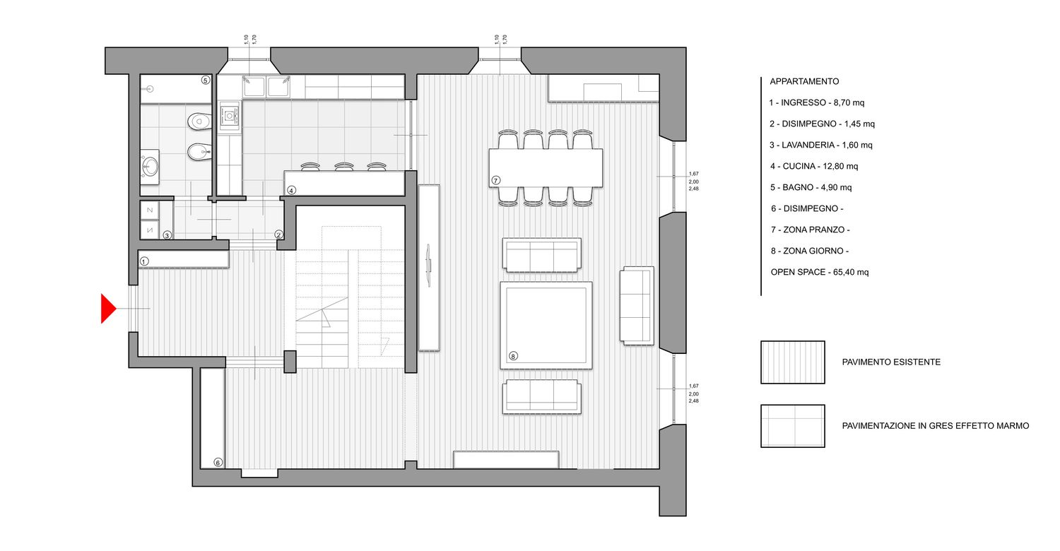 Per poter soddisfare la vostra richiesta, al fine di demolire gran parte del parquet presente nell’open space, ho ritenuto di dover inserire il bagno, la lavanderia e la cucina nella zona da voi proposta, inserendo tra la zona living ed il vano cucina una porta vetrata scorrevole.