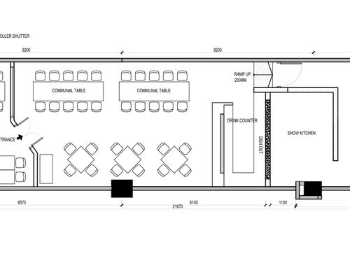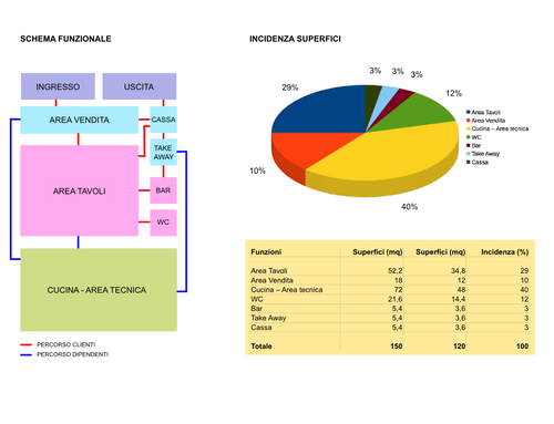 We will search for a place that is about 100-120sqm with about 40 seats for a total of 160 mels served per day. 40% of the space will be dedicated to kitchen and technical locals. There should be enough space for the take-away service.