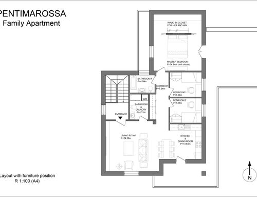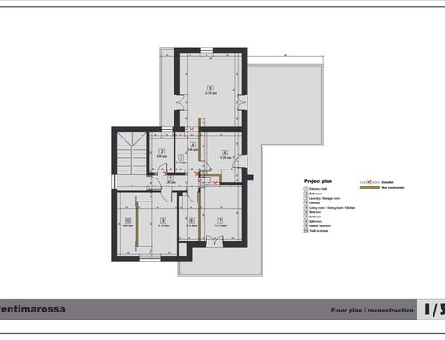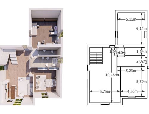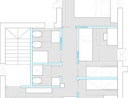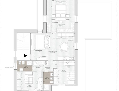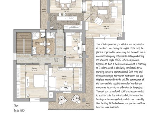 Dear designers, WE JUST NEED THE RESTYLING OF THE UPPER FLOOR. We'd like to have light porcelain floor with wooden effect, white doors, 2 bathrooms, 1 master bedroom, 2 beds for out kids, walk-in-closet, spacious kitchen. We'd like to have false ceilings to protect the house from the summer heat. We'd appreciate if you could insert one light stone wall somewhere. Our pieces of furniture are all dark-coloured but we will change them in the future with light-coloured furniture. We are expecially concerned with the north side of the house where the height is only 160 cm. Thank you