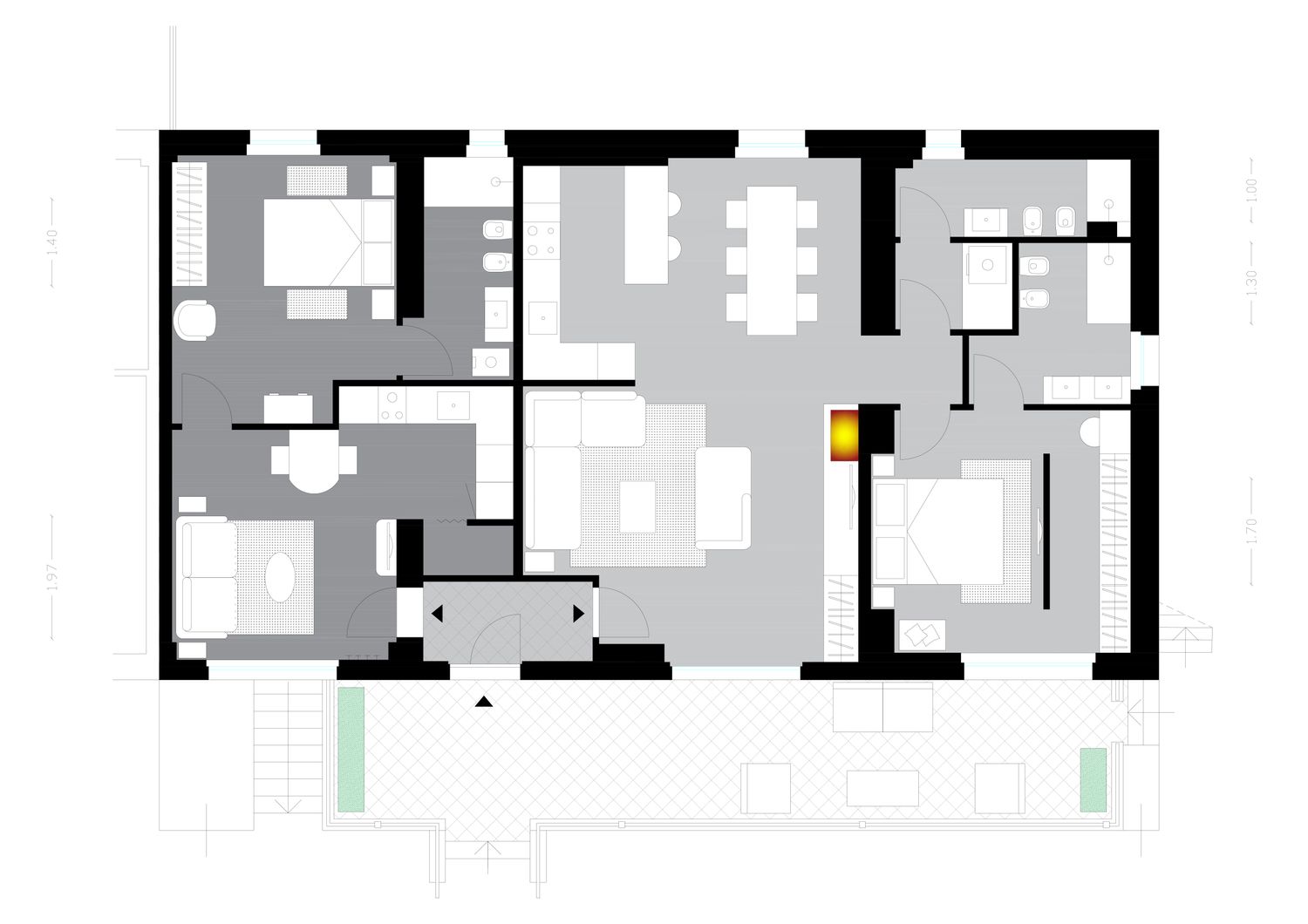 Ciao. Il mio progetto si basa su tre punti fermi, sfruttare la posizione degli scarichi esistenti sia per bagni che cucine, dare a voi un' ambiente comodo e in grado di ospitare molti amici (tavolo con possibiltà di allunghe), e infine, ma non meno importante, dare al suo papà un comodo piccolo bilocale dove possa anche lui ricevere un amico o lei a pranzo e vedere comodamente una partita al divano.