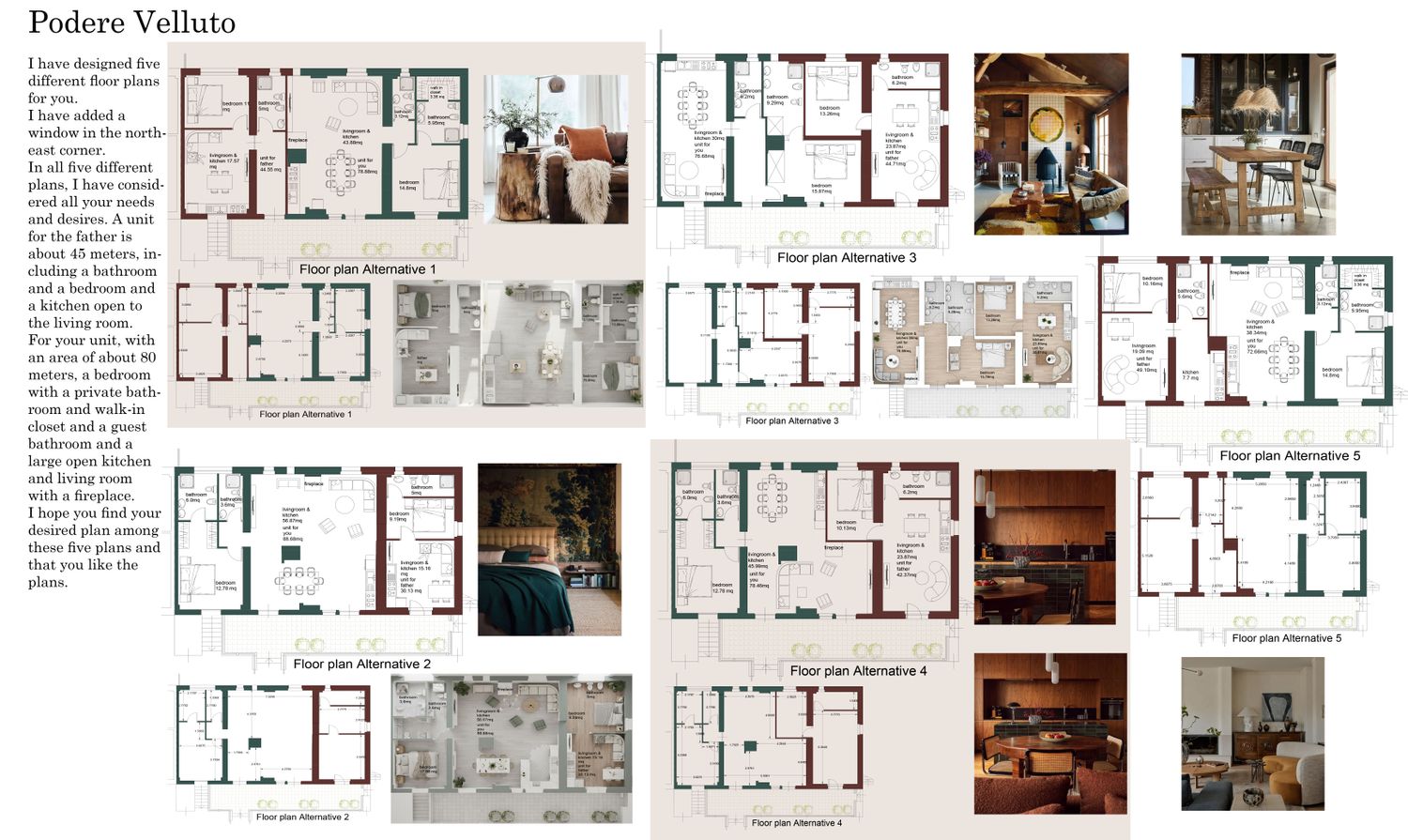 In all five different plans, I have considered all your needs and desires. A unit for the father is about 45 meters, including a bathroom and a bedroom and a kitchen open to the living room.