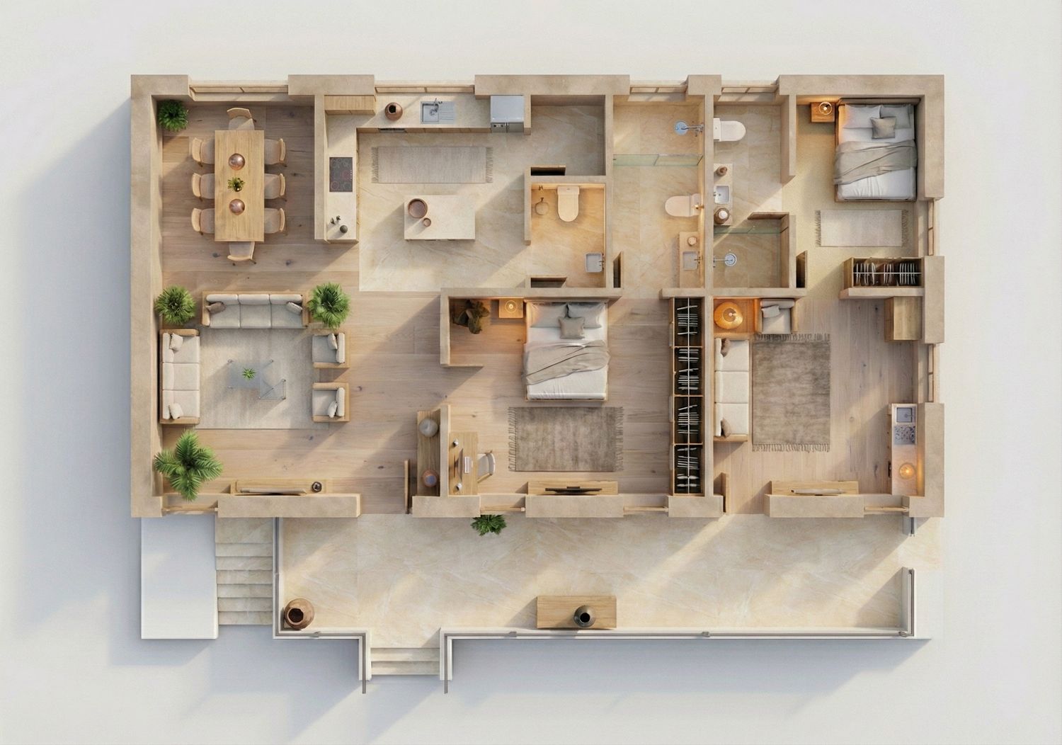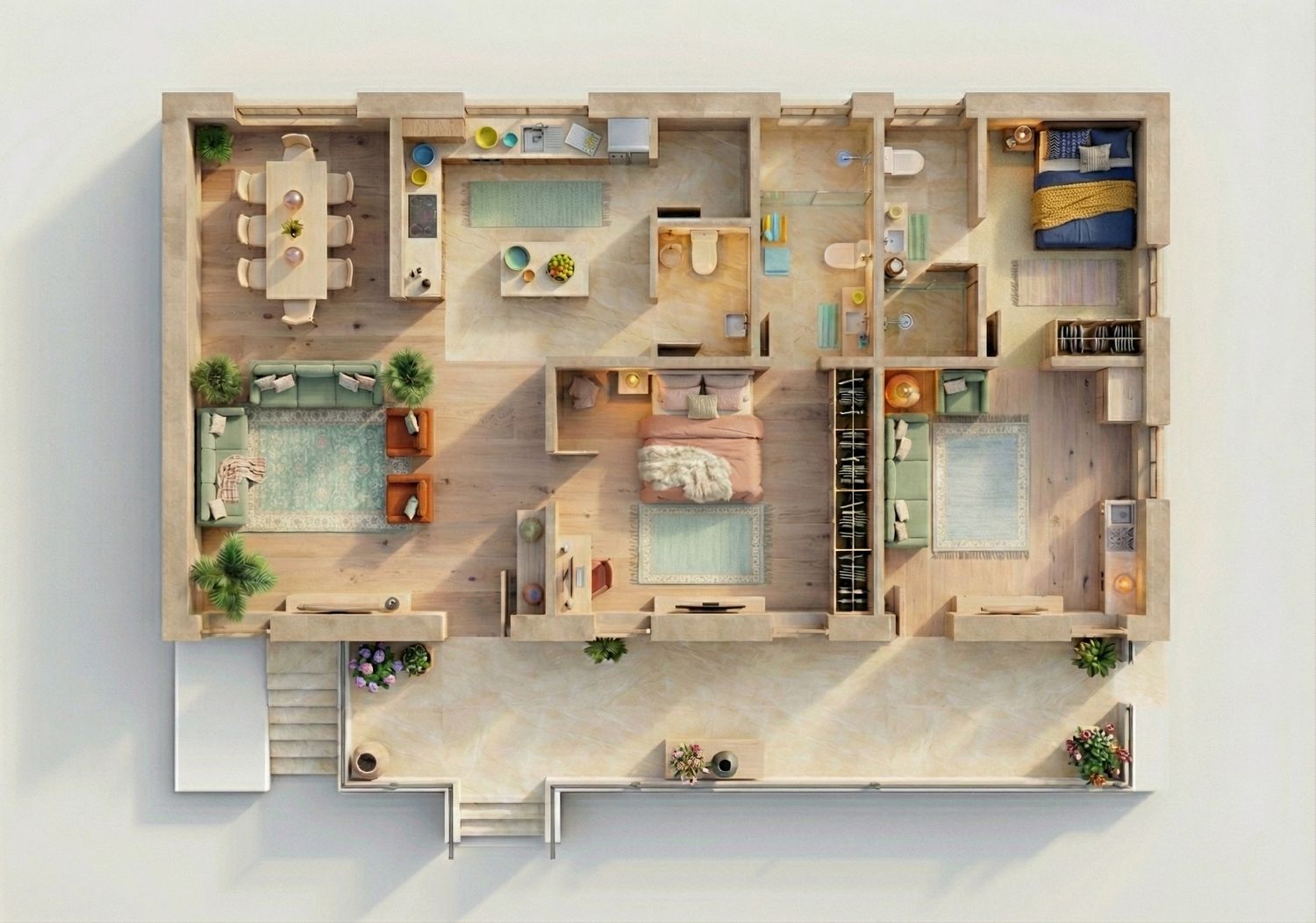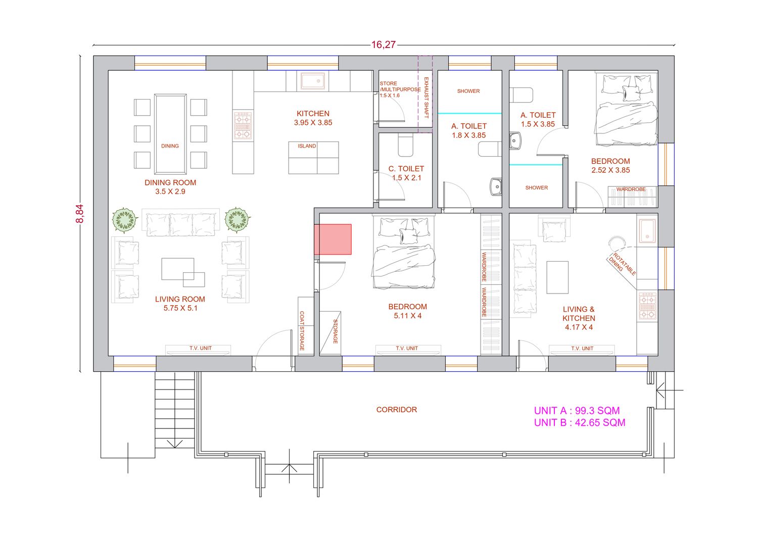 This renovation design focuses on a strategic subdivision that maximizes the functional potential of the existing footprint to create two independent, self-contained living environments. The flow is governed by a long external corridor that acts as a primary arterial spine, providing separate private entries to each unit and ensuring a clear transition from the exterior to the interior living zones. To optimize light and ventilation, the layout places major living and sleeping areas along the perimeter walls, utilizing large window openings to invite natural light deep into the plan while an internal exhaust shaft is positioned to serve the central "wet zones," ensuring consistent air quality in the kitchens and bathrooms. The workability of the design is highlighted by the high-efficiency kitchen layouts and the inclusion of a rotatable dining feature in the smaller unit, which allows the space to adapt dynamically to the occupant's needs. From a feasibility standpoint, the plan successfully clusters plumbing and utility lines toward the center of the structure, which simplifies the renovation process by consolidating technical infrastructure while maintaining a spacious, open-concept feel in the primary residence.
