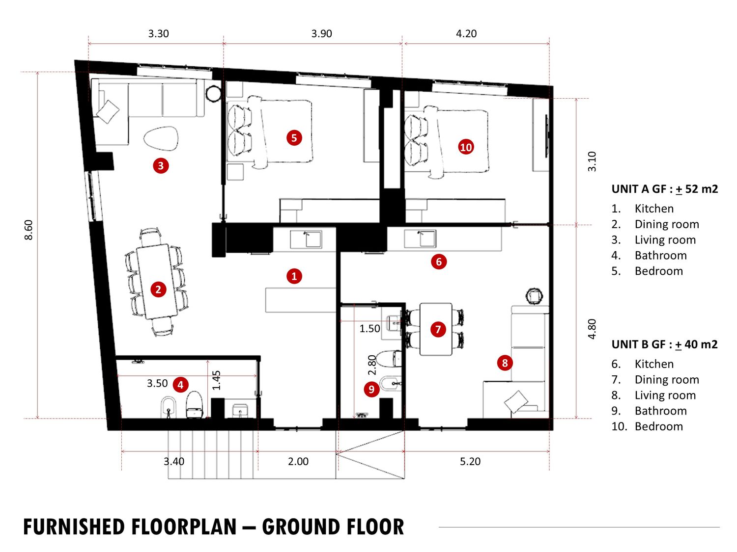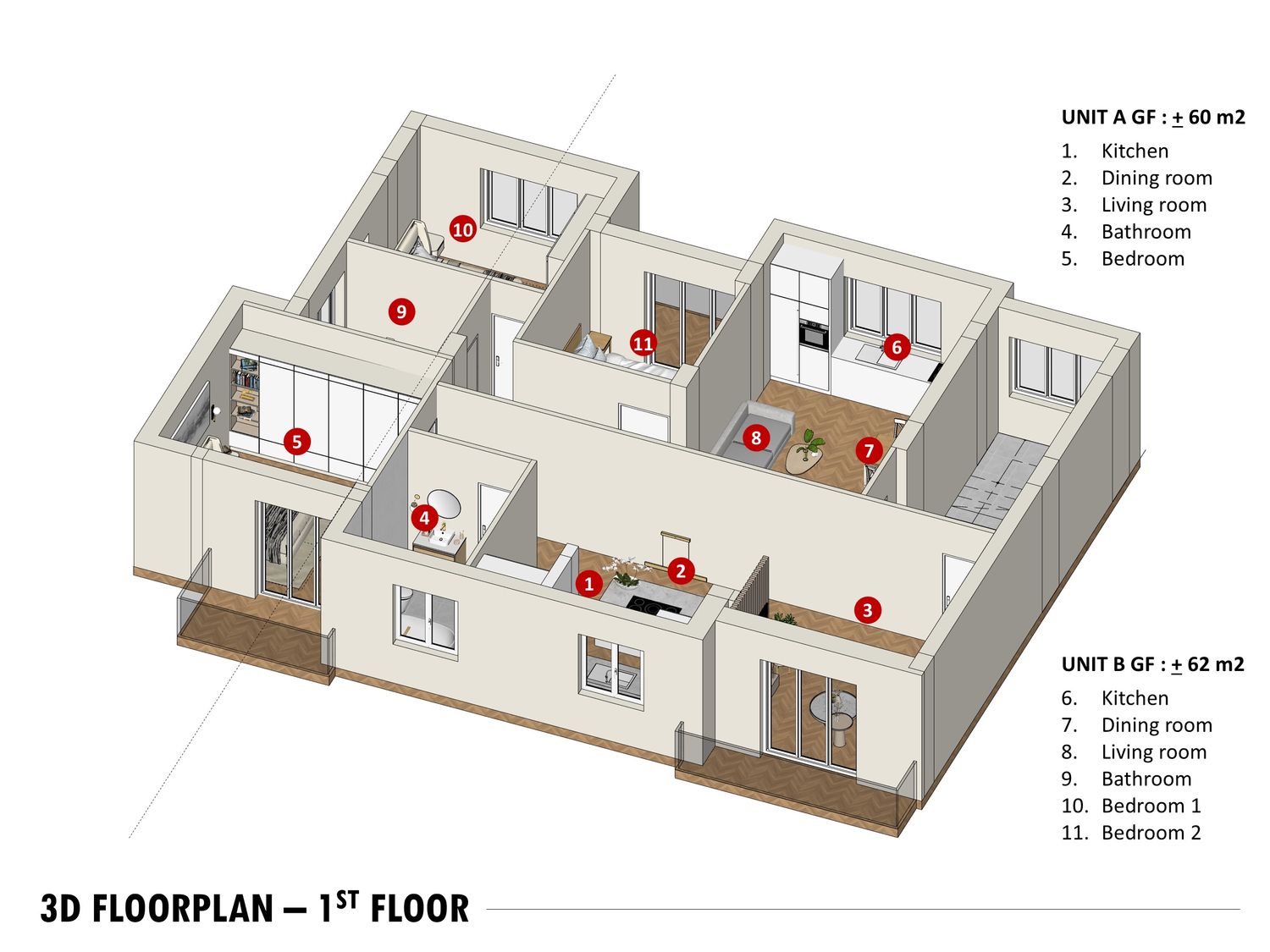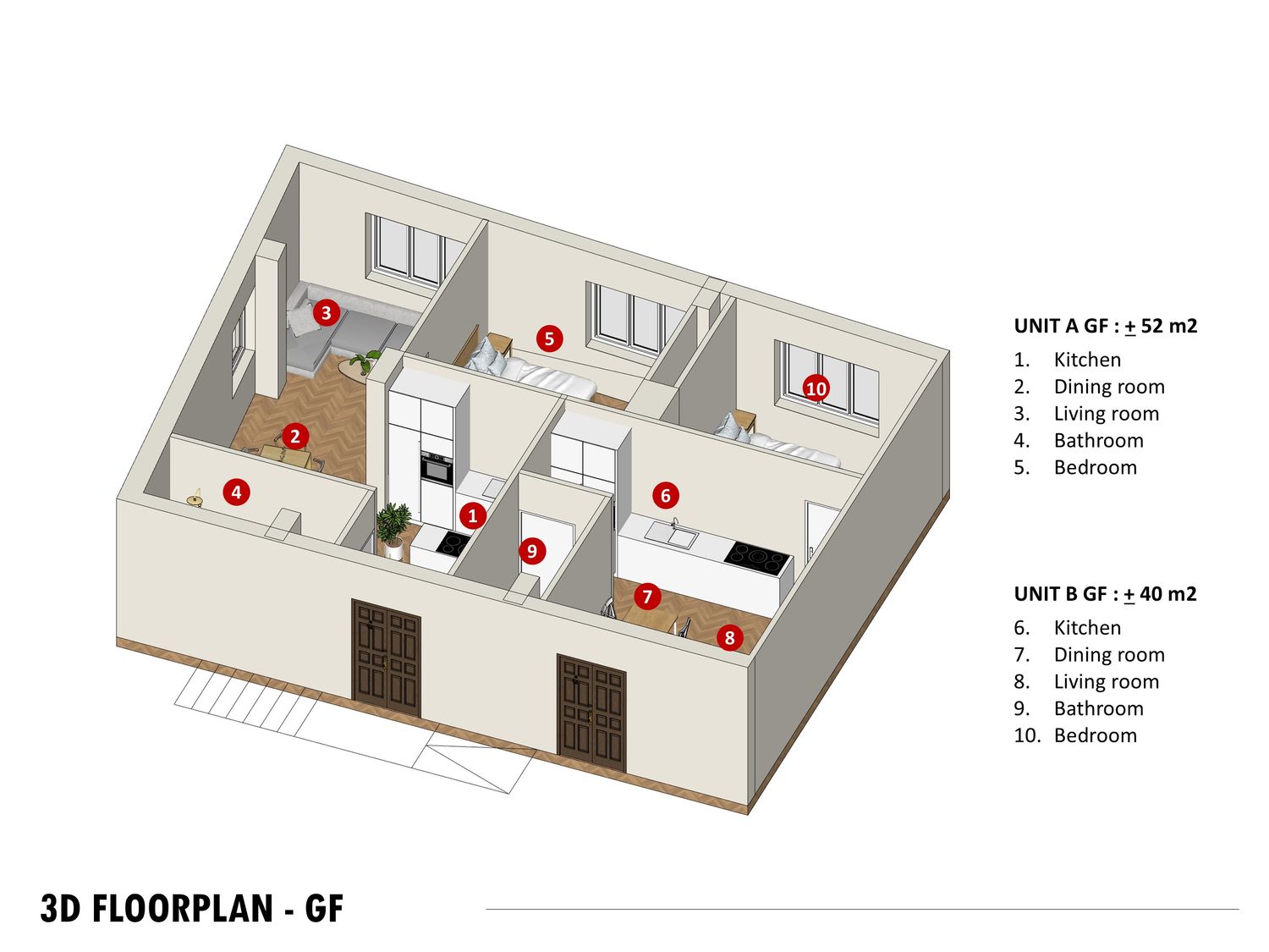 The proposed layout prioritizes maximum space efficiency across all six mini-apartments. To ensure optimal plumbing efficiency and minimize costs, the design strategy mandates that the positioning of the existing bathrooms must be preserved. The standard unit type will be a 1-Bedroom apartment, with the exception of Unit B on the First Floor (1F), which will be designed as a 2-Bedroom apartment to maximize the floor's potential living space. This approach guarantees functional yet cost-effective housing solutions across all levels.