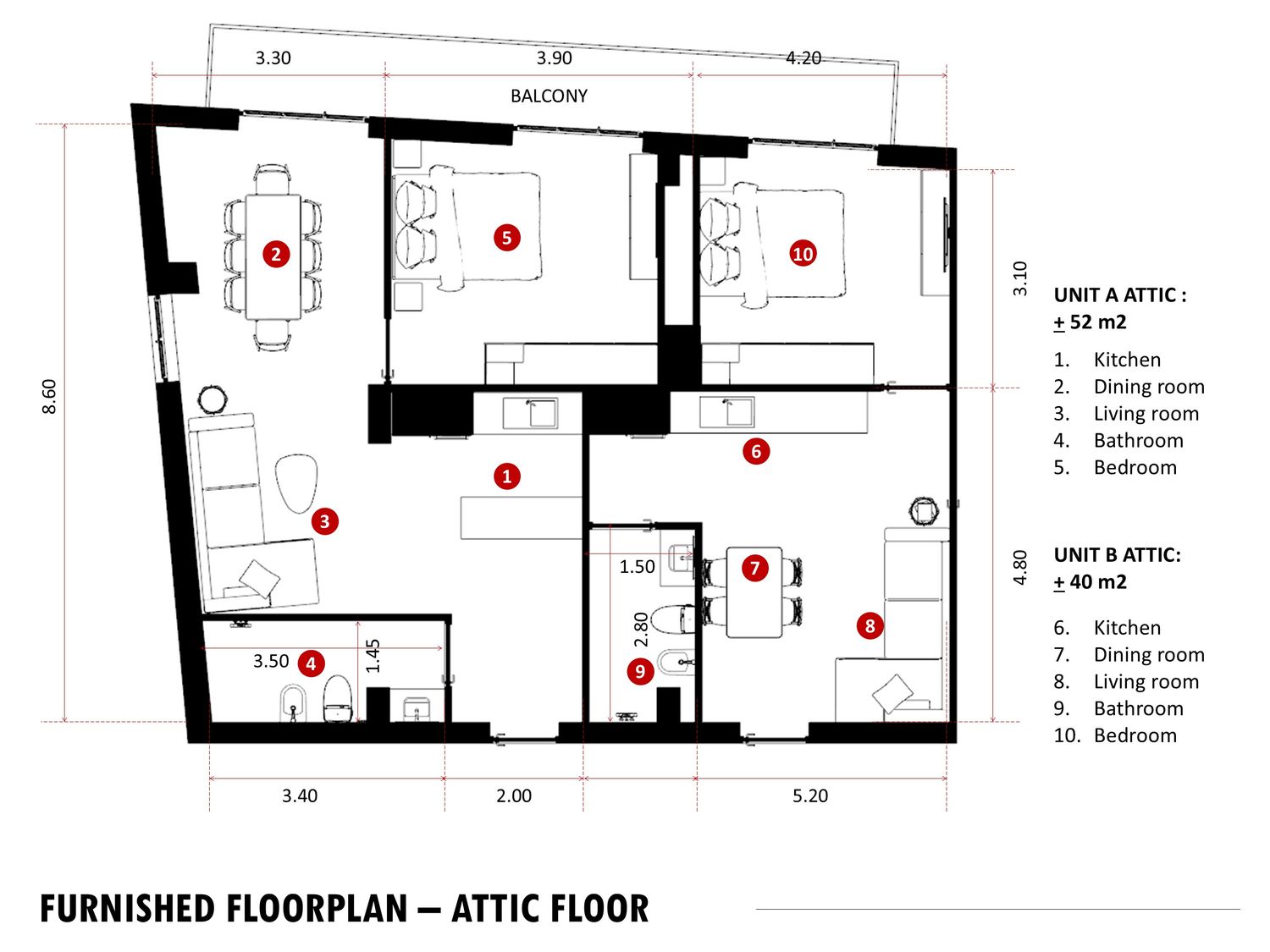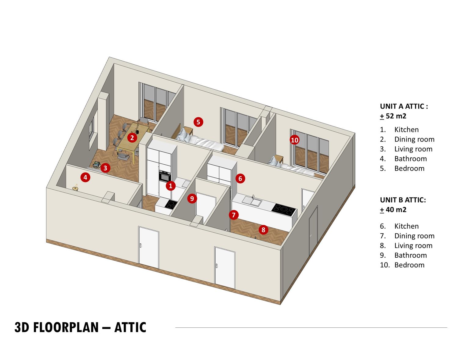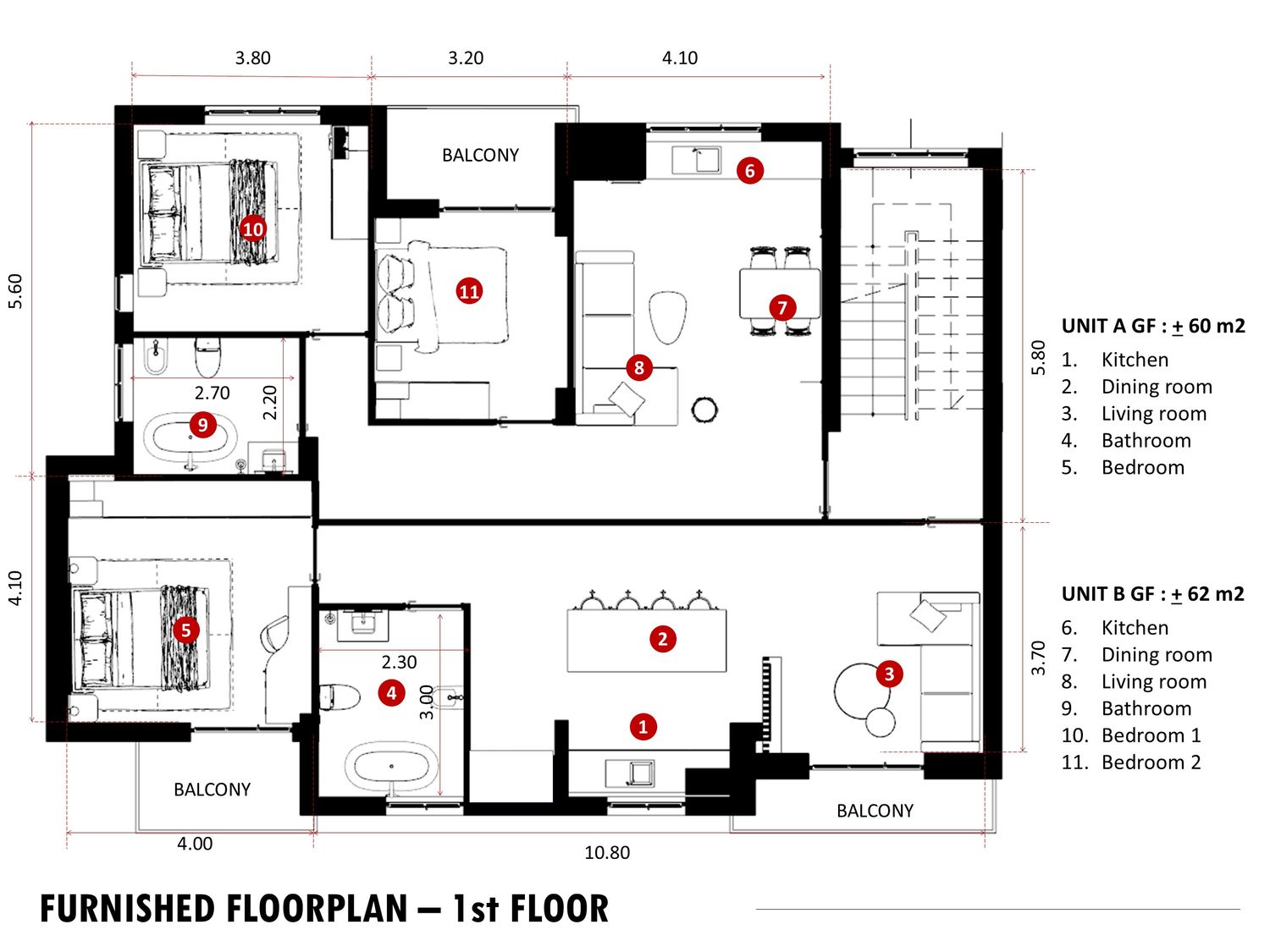 The proposed layout prioritizes maximum space efficiency across all six mini-apartments. To ensure optimal plumbing efficiency and minimize costs, the design strategy mandates that the positioning of the existing bathrooms must be preserved. The standard unit type will be a 1-Bedroom apartment, with the exception of Unit B on the First Floor (1F), which will be designed as a 2-Bedroom apartment to maximize the floor's potential living space. This approach guarantees functional yet cost-effective housing solutions across all levels.