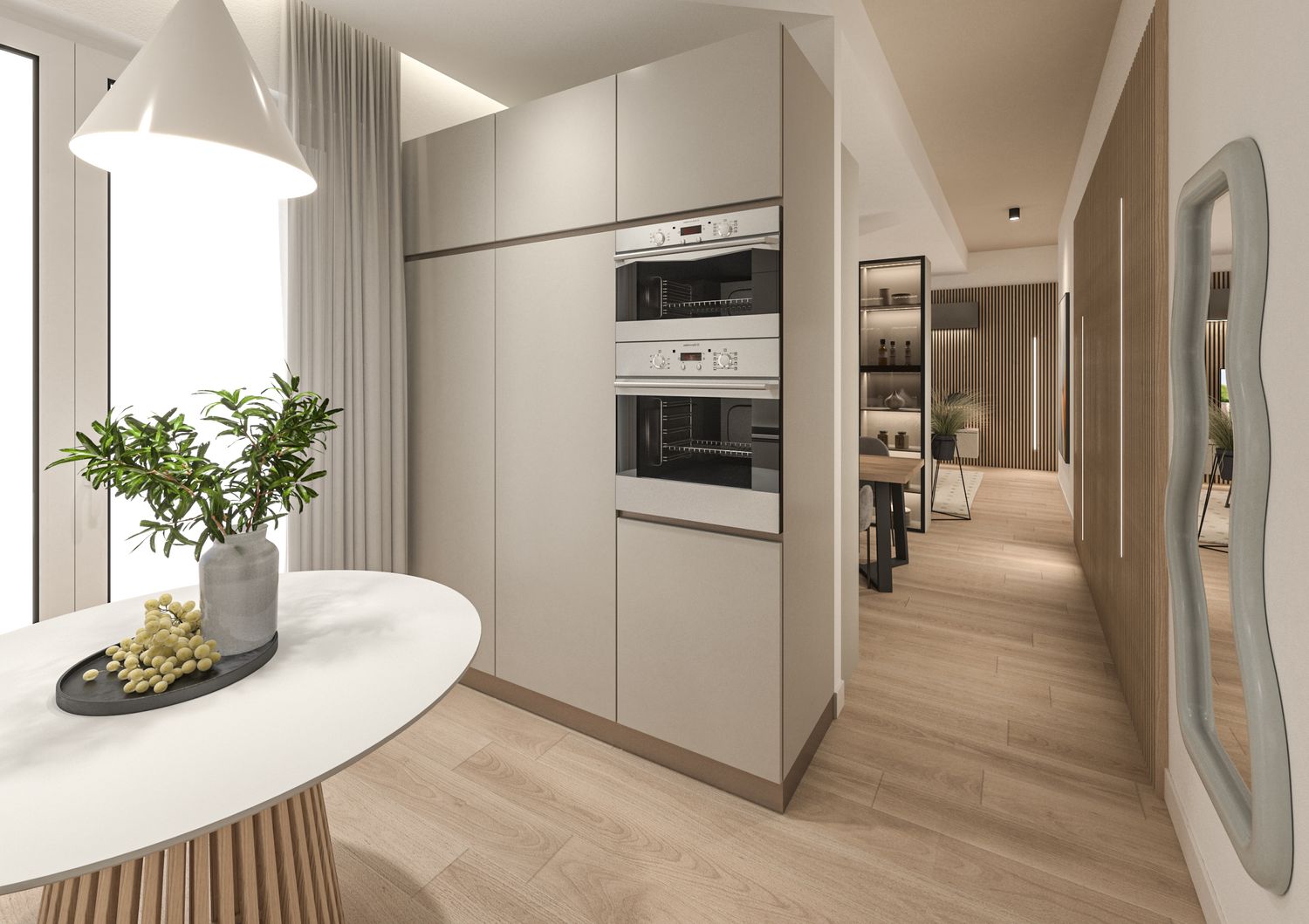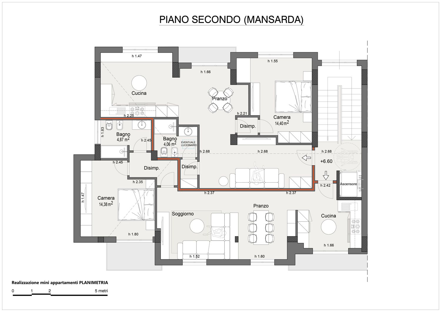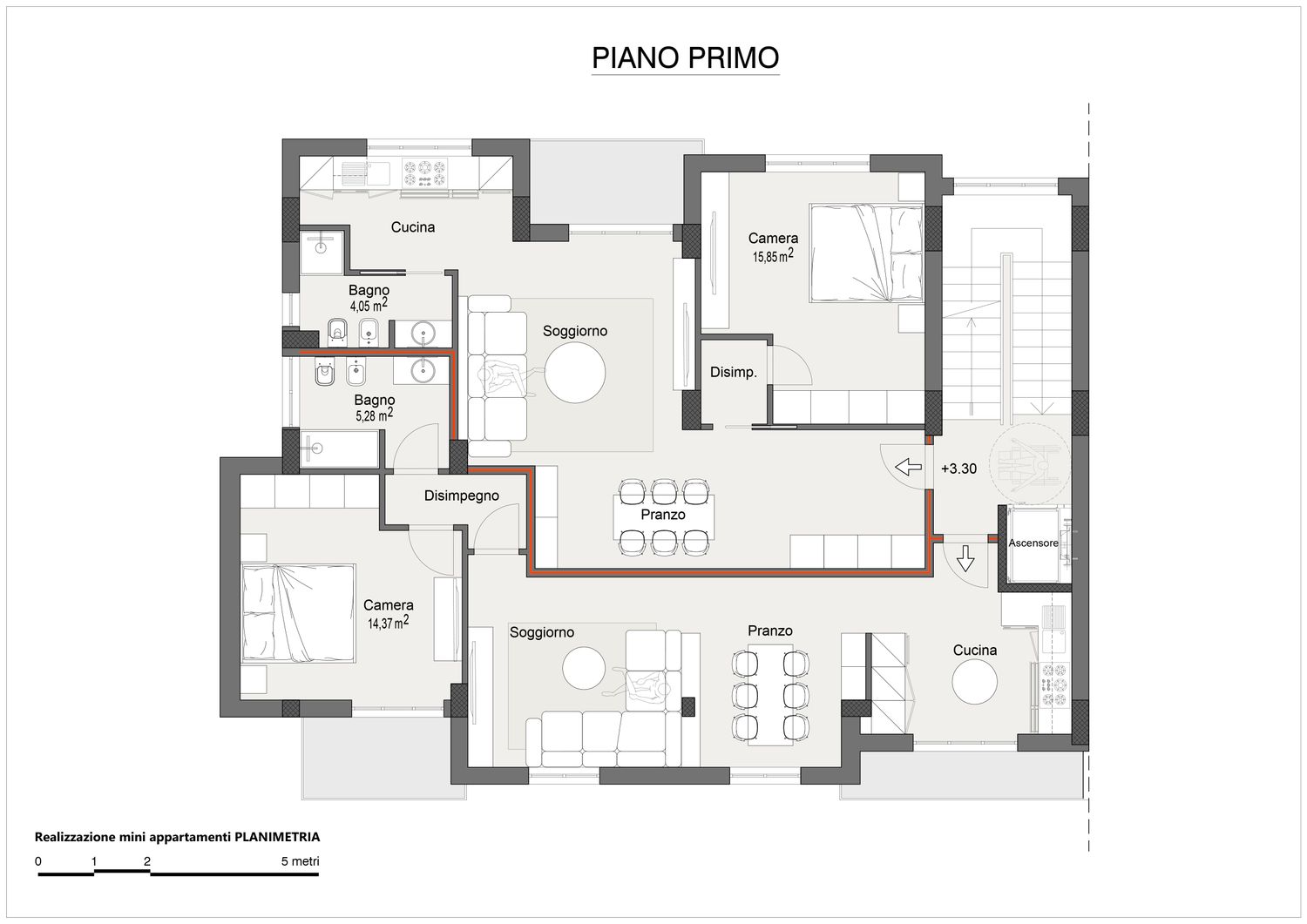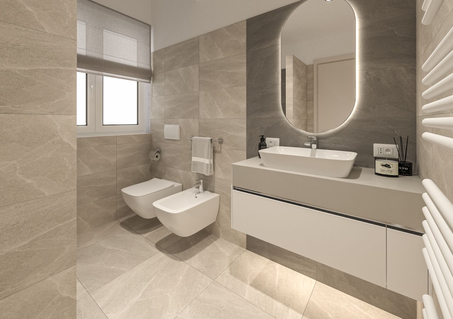 Il progetto mira alla riconversione di una porzione di bifamiliare in sei mini-appartamenti indipendenti e alla riorganizzazione del seminterrato. L'obiettivo primario è massimizzare la funzionalità e il comfort abitativo, con un'attenzione scrupolosa all'ottimizzazione dei costi e all'efficienza impiantistica. Per superare i requisiti standard, sono state implementate due soluzioni ad alto valore aggiunto: inserimento di un mini-ascensore a servizio di tutti i livelli per l'abbattimento completo delle barriere architettoniche e l'applicazione di un isolamento acustico performante nelle pareti divisorie, garantendo privacy e serenità in ogni unità. Il design interno, come mostrato nei render HD dell'appartamento tipo al Piano Primo, è contemporaneo e accogliente, basato su linee pulite, colori chiari e materiali durevoli. Il gres porcellanato effetto legno unisce calore e praticità, mentre l'uso strategico di pannelli Akupanel migliora l'acustica interna. Il risultato è la creazione di sei unità abitative moderne e funzionali, che fondono design ottimizzato, accessibilità verticale e comfort acustico superiore, nel pieno rispetto delle normative e del budget.