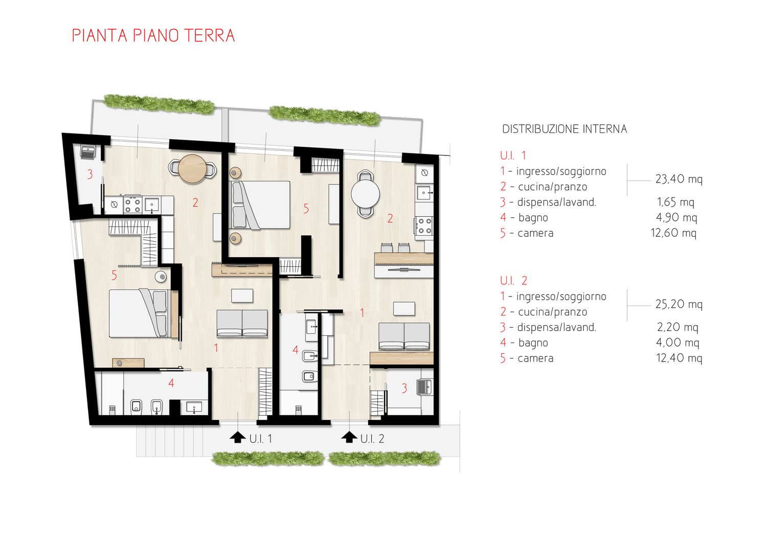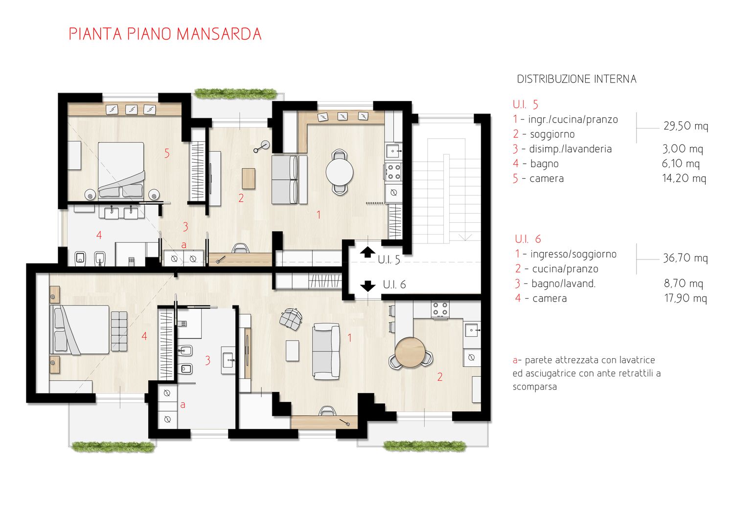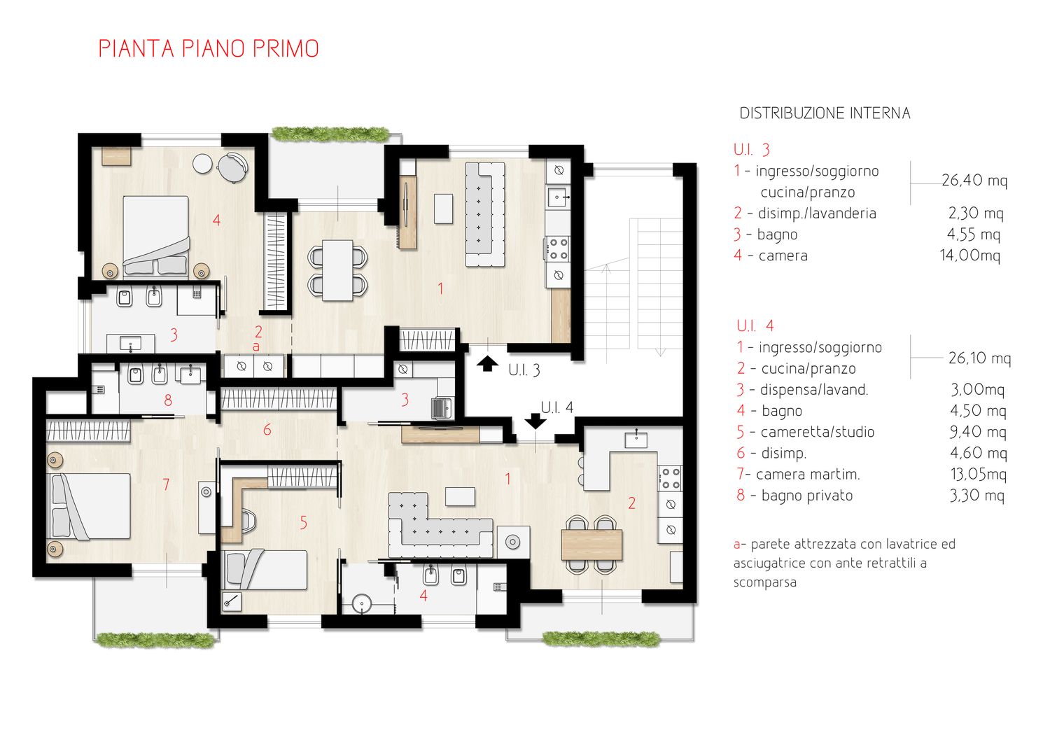 Come da vostre richieste sono stati inseriti sei mini appartamenti ottimizzando gli spazi e rendendoli fruibili. Gli appartamenti si compongono di ingresso con mobile guardaroba filomuro, zona living con cucina, pranzo e divano con mobile tv; ripostiglio e/o lavanderia; camera e bagno; inoltre visto che al piano primo ci sono maggiori spazi, in un appartamento è stata ricavata una seconda camera con possibilità di essere aperta sul living grazie ad un ampia pannellatura scorrevole e un secondo bagno. Lo stile è lineare con arredi semplici e dalle linee pulite che ben si integrano negli ambienti.