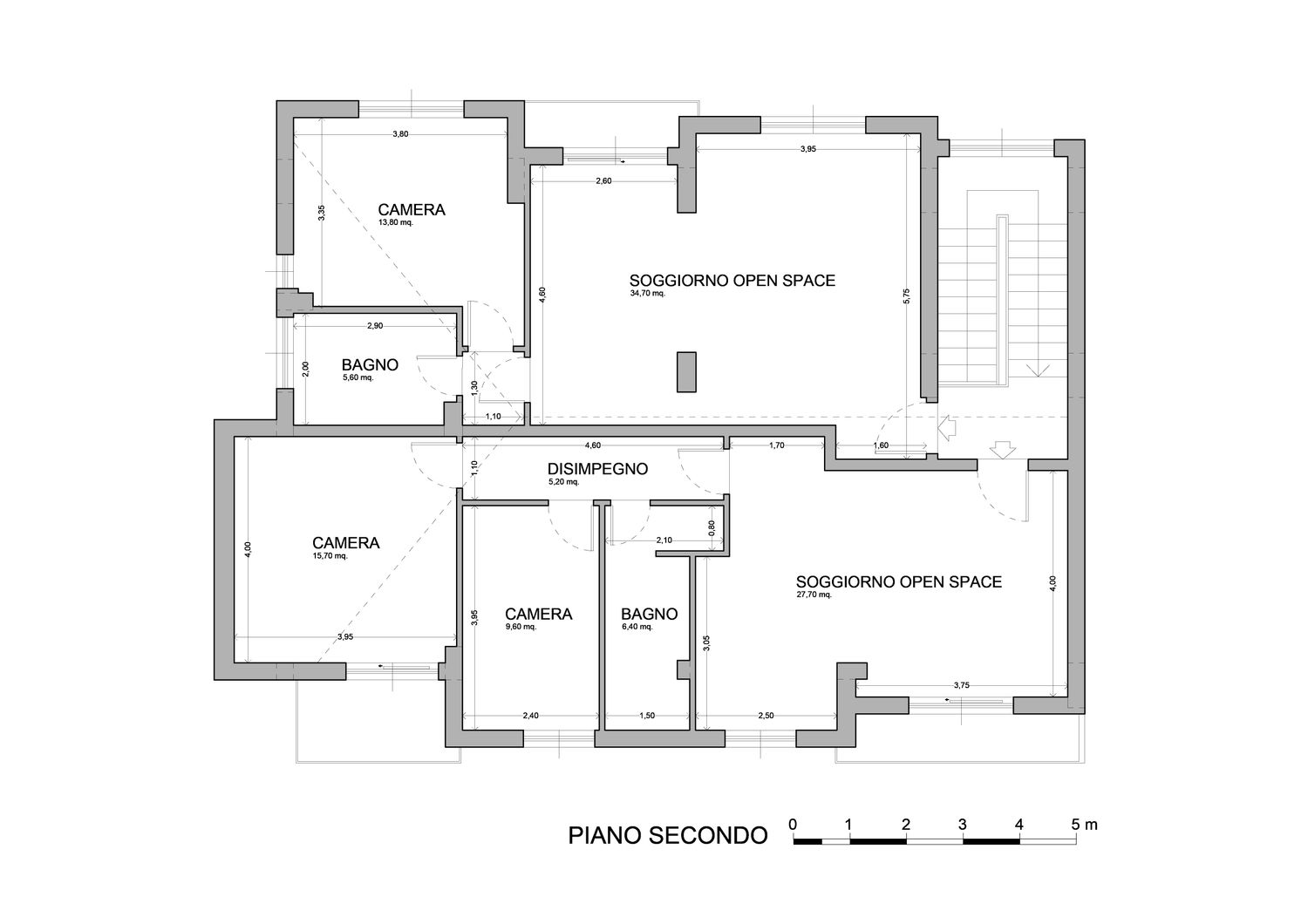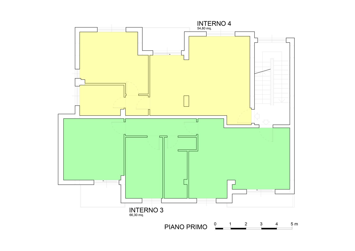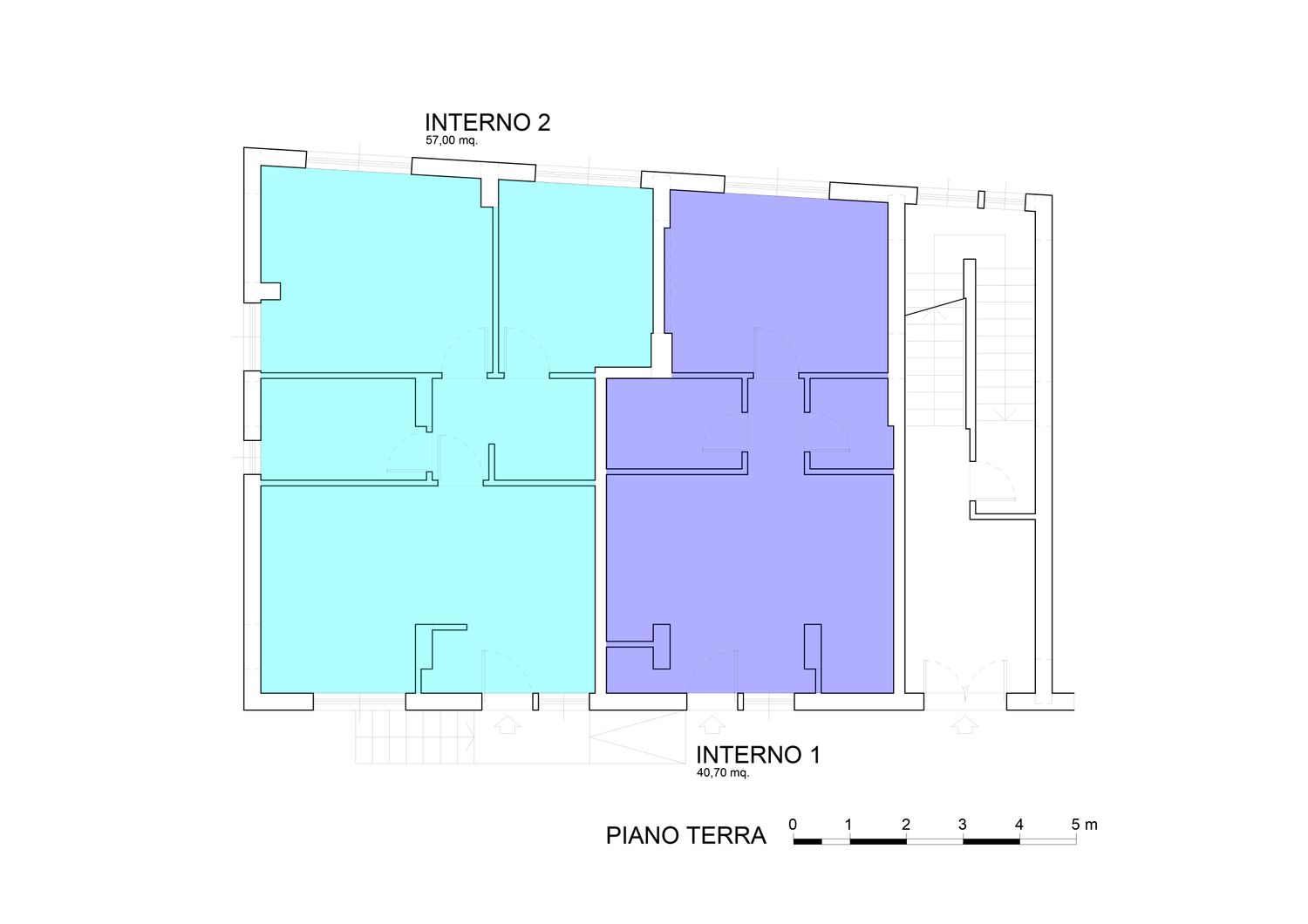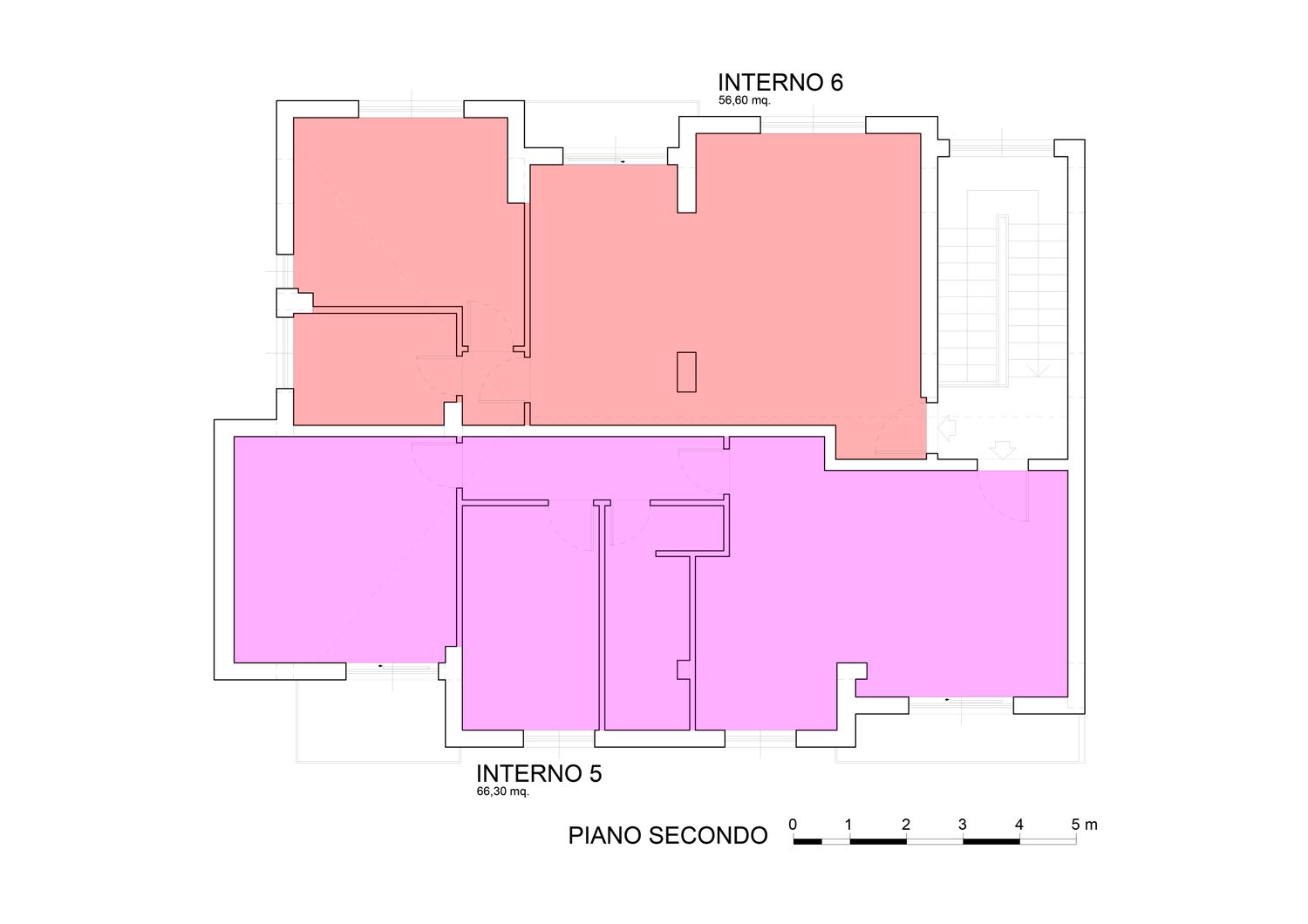 Proposta di frazionamento dell'edificio in n°6 unità immobiliari residenziali, di dimensioni comprese fra i 40 e i 66 mq. circa, distribuite nei tre piani: terra, primo e secondo.