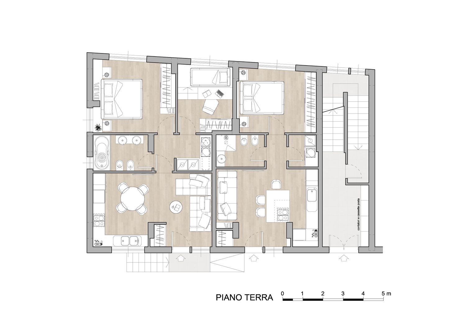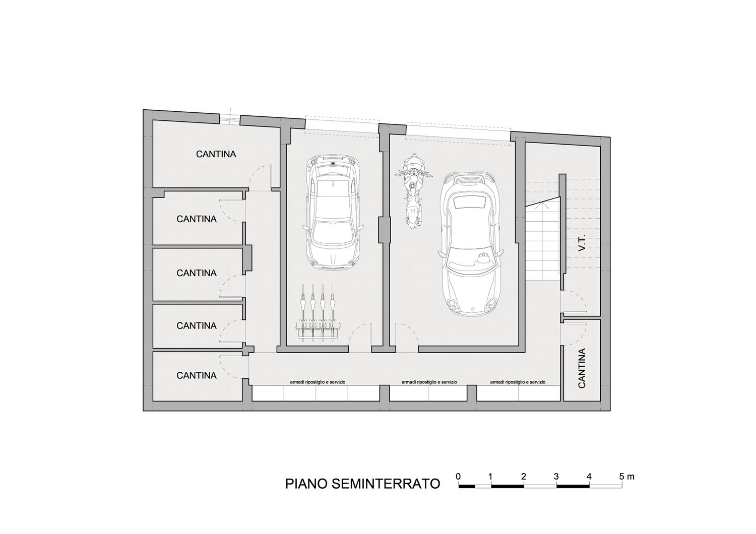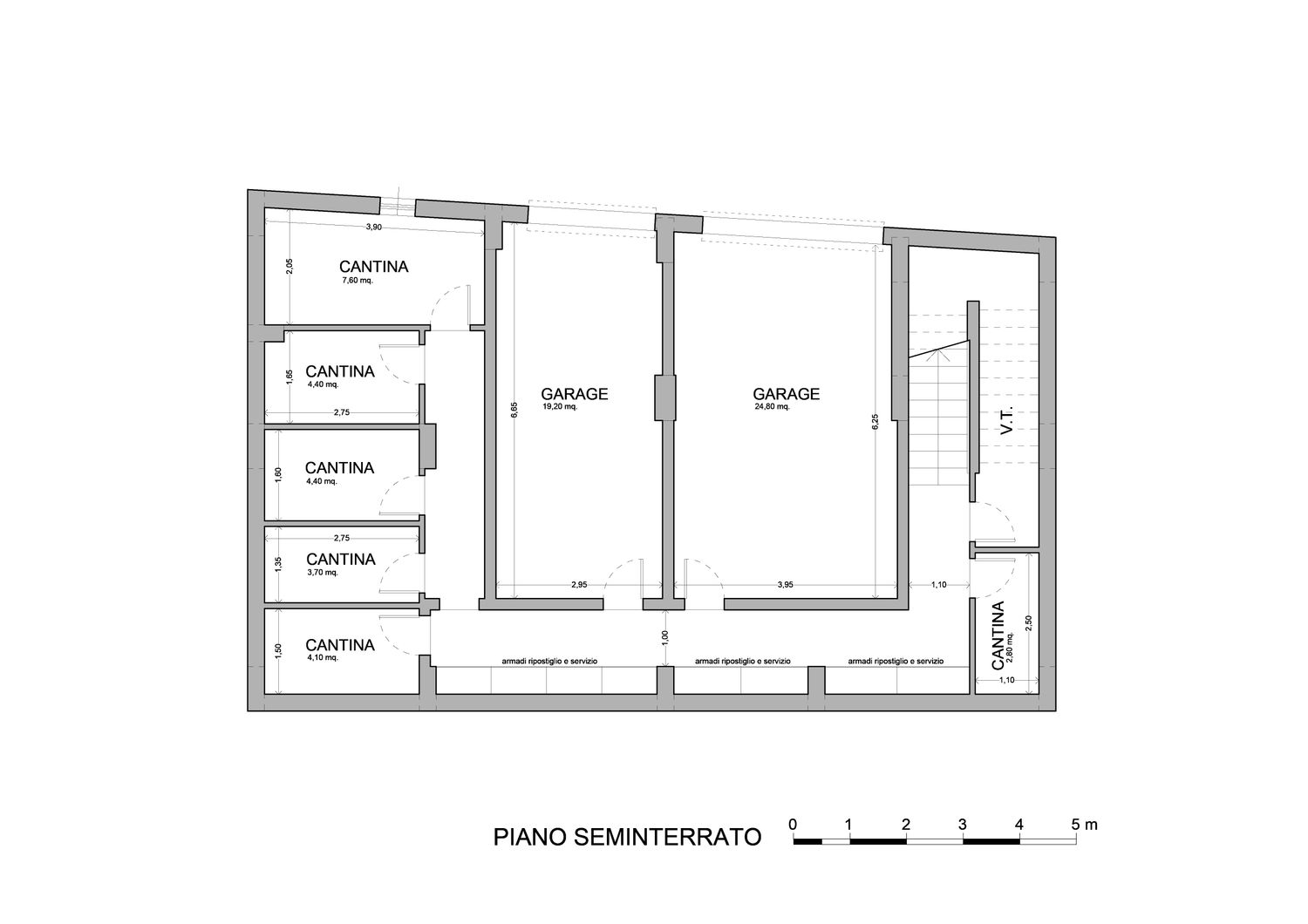 Al piano interrato, abbiamo realizzato due garage più 6 cantine, in modo da poterne attribuire una per ogni unità abitativa.
