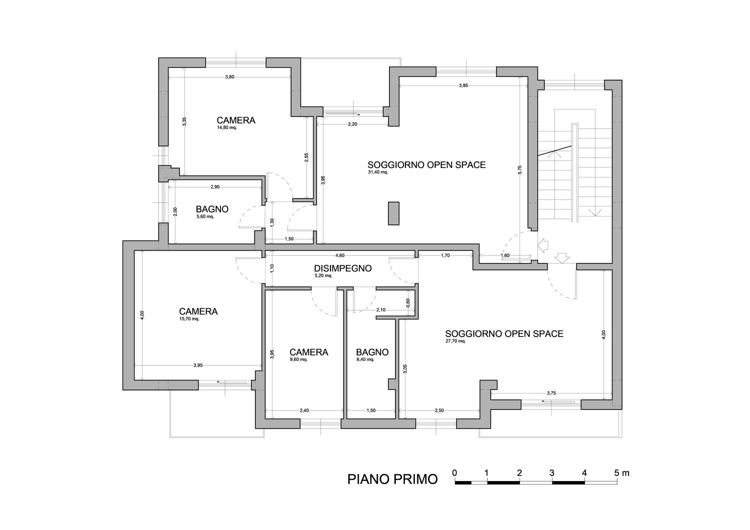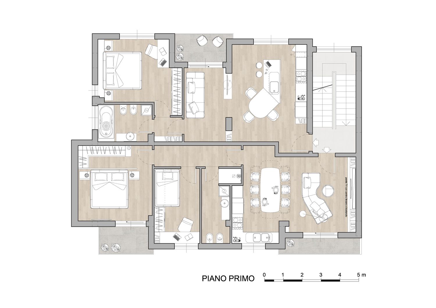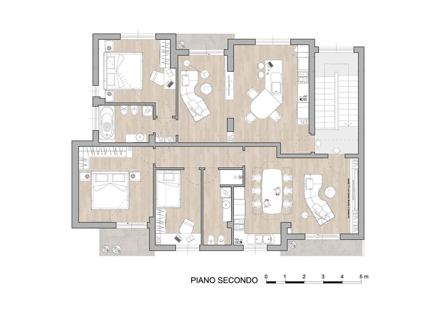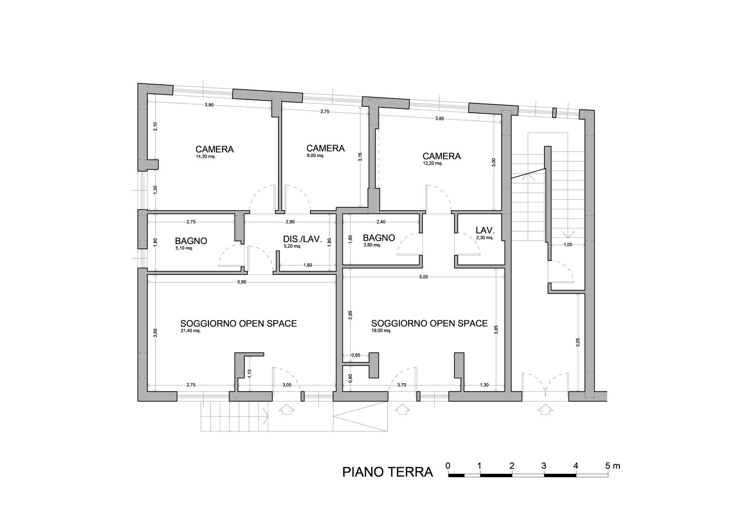 Al piano interrato, abbiamo realizzato due garage più 6 cantine, in modo da poterne attribuire una per ogni unità abitativa.