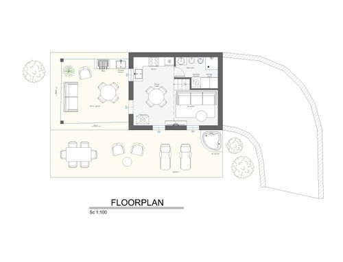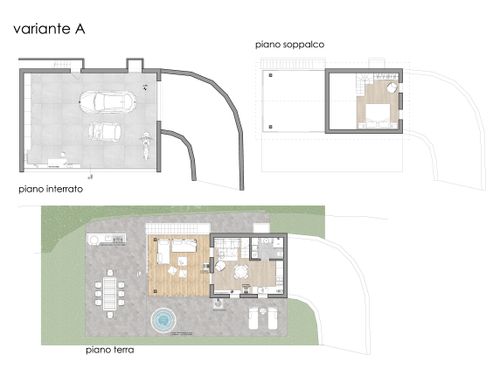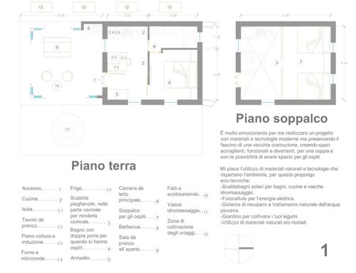 Sfruttare al massimo gli spazzi per creare una mini casetta indipendente anche dal punto di vista energetico (stufa pellet),- pannelli fotovoltaici sul tetto, con zona notte soppalcata, zona giorno, cucina, bagno, giardino di inverno (riscaldato con stufa a legna - cucina economica). L'obiettivo è renderla abitabile per 2 persone + piccolo divano letto. Pratico - romantico