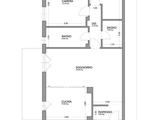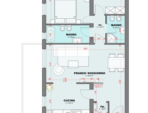 Mi marido y yo acabamos de comprar (solo de forma preliminar) una casa en Grosseto por mudarnos de ciudad. Ya estamos en contacto con quien nos vendió la casa para hacer una reforma de bajo impacto (recuperar el parquet de la zona de dormir, cambiar el suelo del salón, renovar los baños). Lo que nos interesa es entender cómo organizar los espacios. En cuanto a la cocina, dado su reducido tamaño, quizás preferimos separarla del salón; además, por una cuestión de presupuesto, no queremos perder el armario para hacer un pequeño lavadero. El salón es cómodo, con un pequeño armario, un televisor con una pared dedicada y un sofá delante. En cuanto a los baños, me gustaría tener uno con ventana, bañera, mueble con lavabo sobre encimera, bidé e inodoro. A mi marido le gustaría un hidromasaje, pero a mí me gusta uno exento; no sé si se ajusta al presupuesto. El baño sin ventana tiene una ducha grande, lavabo, bidé e inodoro. La habitación doble tiene mesitas de noche colgantes y un armario grande, y si es posible, también una cómoda pequeña. Por ahora, nos gustaría tener libre la habitación más pequeña, pero si es necesario, puede acomodar a dos personas y, por lo tanto, también un armario. En esta habitación pequeña, queremos un televisor en la habitación doble, pero no lo queremos.