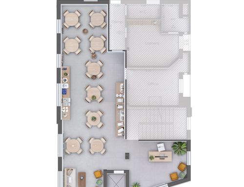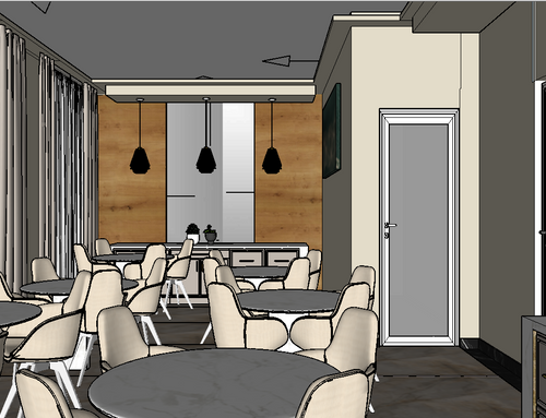 * Buffet area: an equipped counter will be installed along one wall, designed to offer a varied buffet with a display of croissants, cold cuts, juices, cereals and other products. The design will be elegant and practical, with display cases and easy-to-clean surfaces, it will be for 50 people.