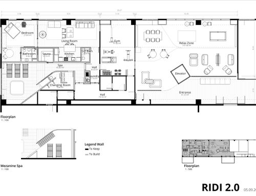 create a spa area, with whirlpool sauna knaip path relaxation area and massages, all on the left side of the floor, between the hall and the apartment. as shown in the photos, the water systems must be positioned close to the existing ones.
