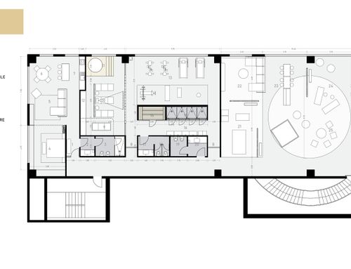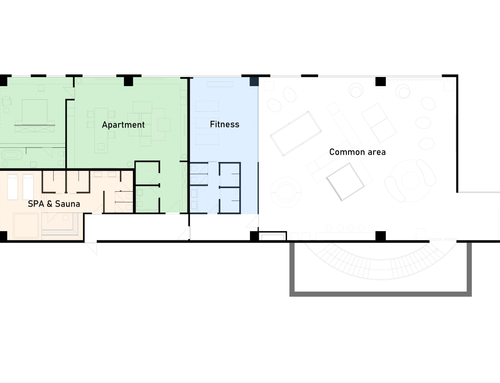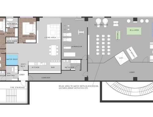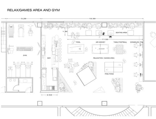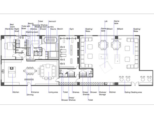 l'idea è quella che nella hall vorremmo realizzare una area "giochi" con biliardo tavoli da gioco e un area relaz, nel altra parte vorremmo realizzare una piccola palestra e un appartamento personale  con una piccola spa, una cucina, una camera da letto, un bagno e un salottino, possibilmente fare ambienti spaziosi.