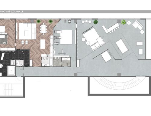 Salve, mi piacerebbe uno stile moderno e minimal, si tratta del ultimo piano (piano Direzionale) di una palazzina uffici di un azienda, dove un 1/3 è adibita ad uffici il resto e comoposto da una hall e una zona per adesso vuota.