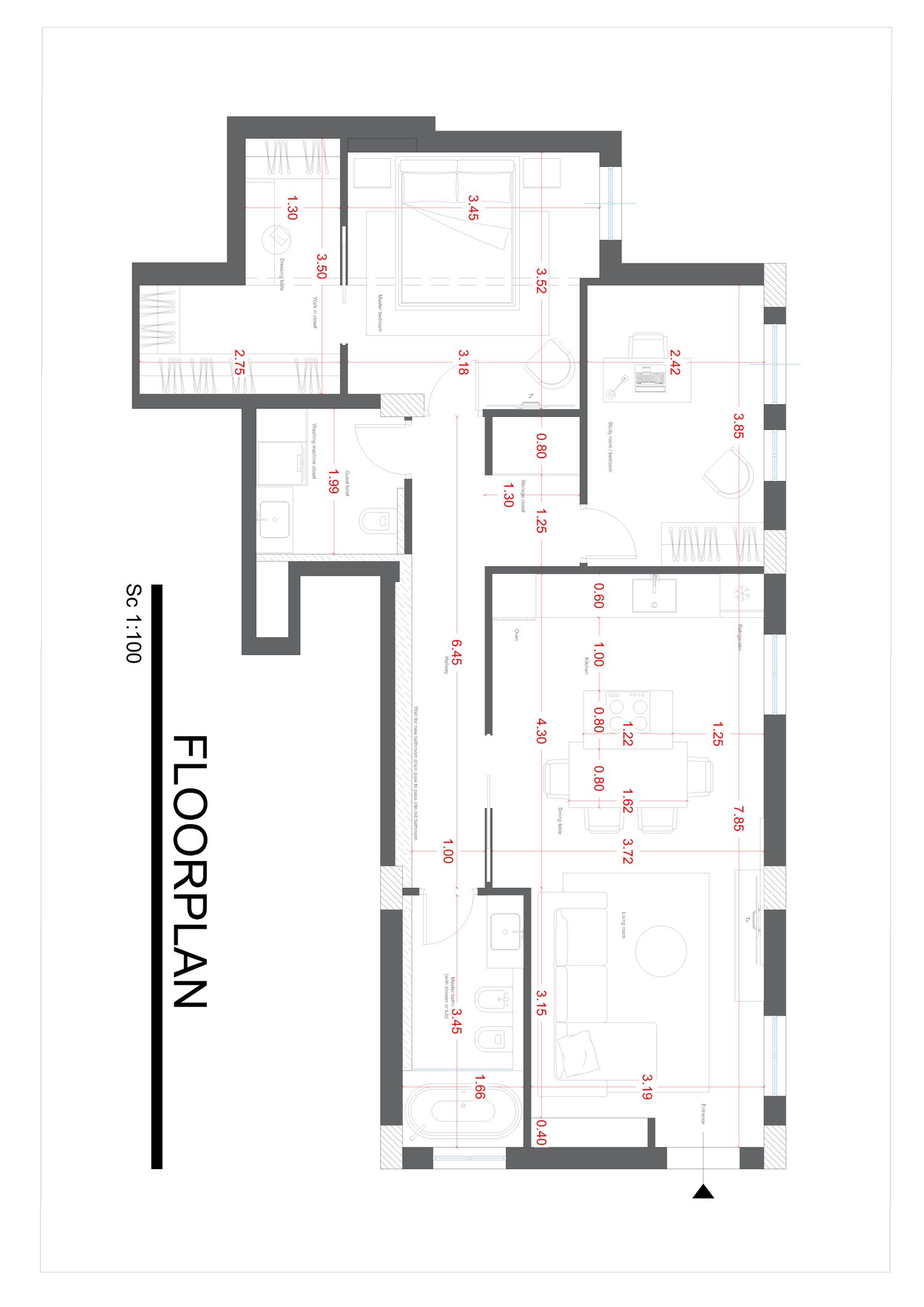 The main challenge and goal for the design was to create a large and open living/dining area, maintain the current bathroom location, and make optimal use of the sleeping area considering the dimensions and irregular walls of that area.