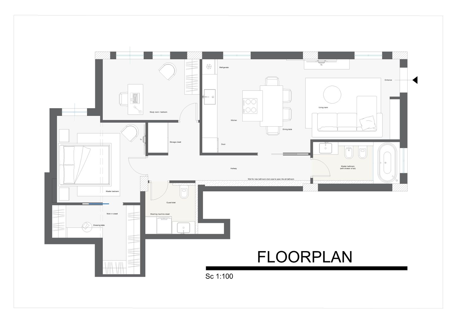 The bathroom was kept in its current location, the guest bathroom (new bathroom) was connected to the main bathroom by a false wall so that the sewage and clean water pipes could be transferred to the current bathroom through it.