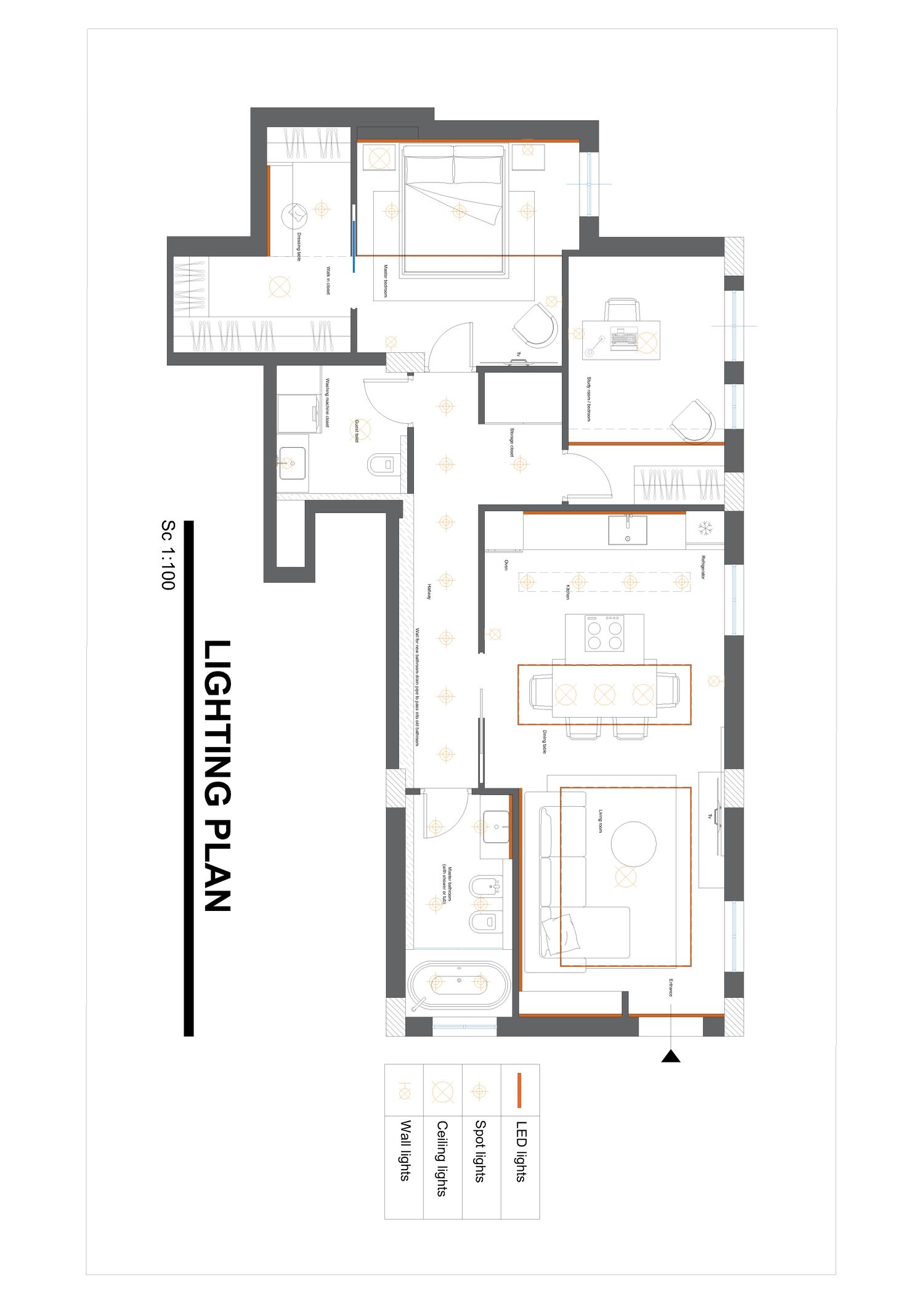 The apartment's lighting is done with an emphasis on linear and hidden lights to create a relaxing environment.