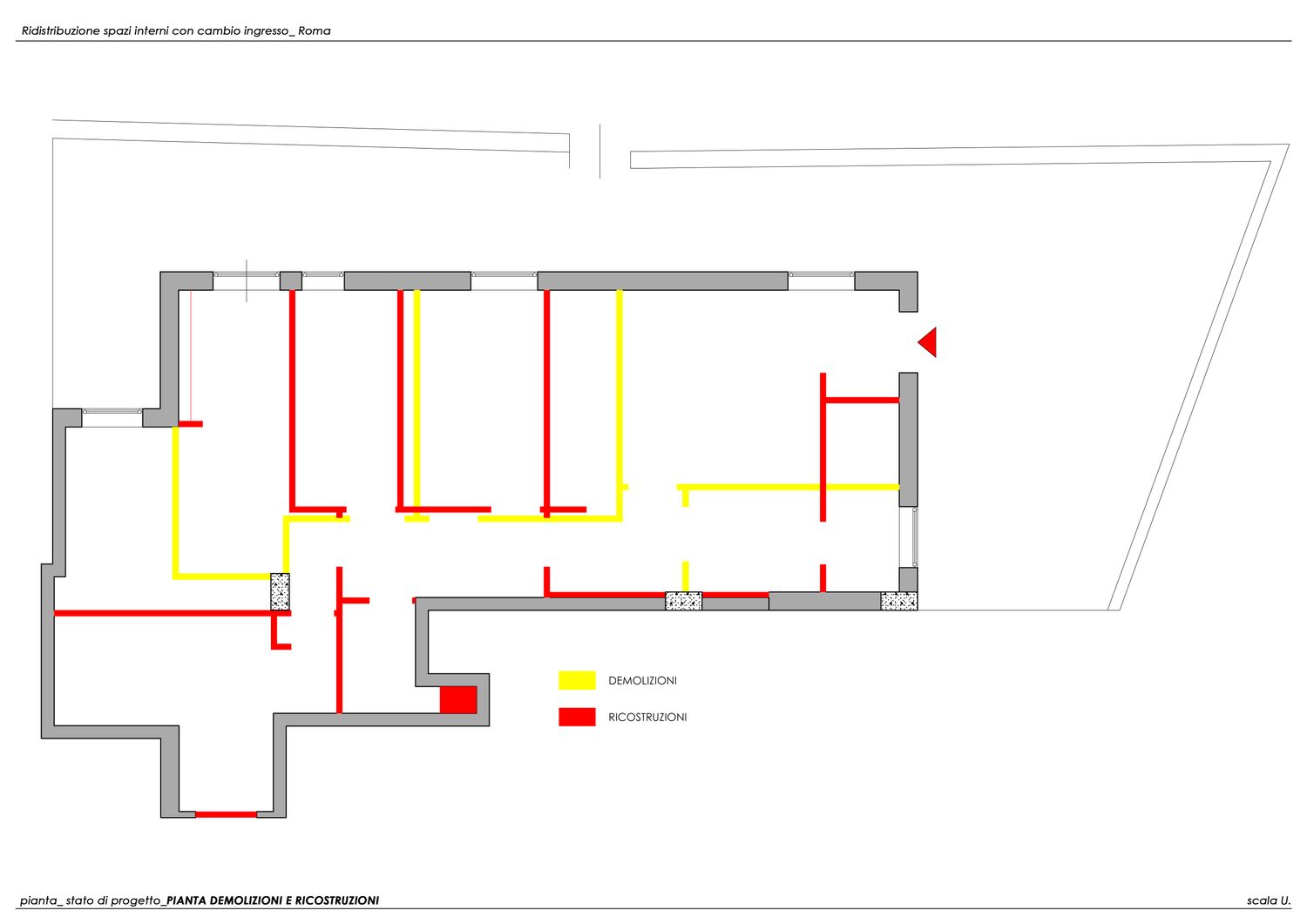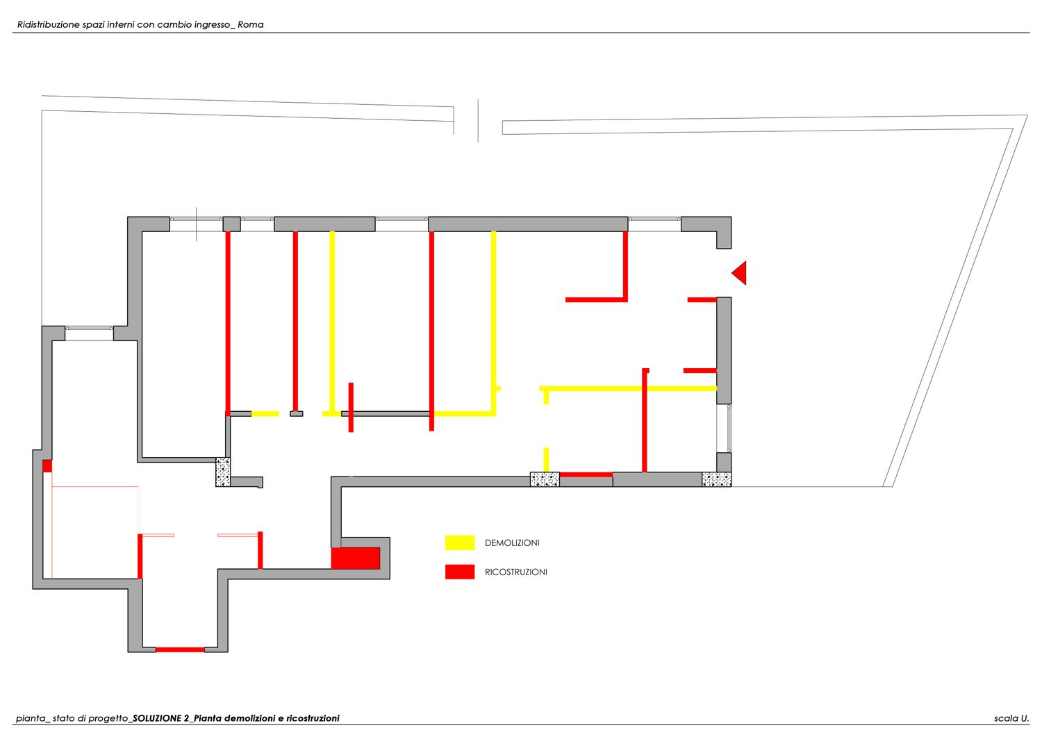 Per rispondere a questa richiesta è stata prevista la chiusura dell’ingresso attuale e la creazione di un nuovo accesso tramite la portafinestra situata nella stanza adiacente all’attuale bagno.