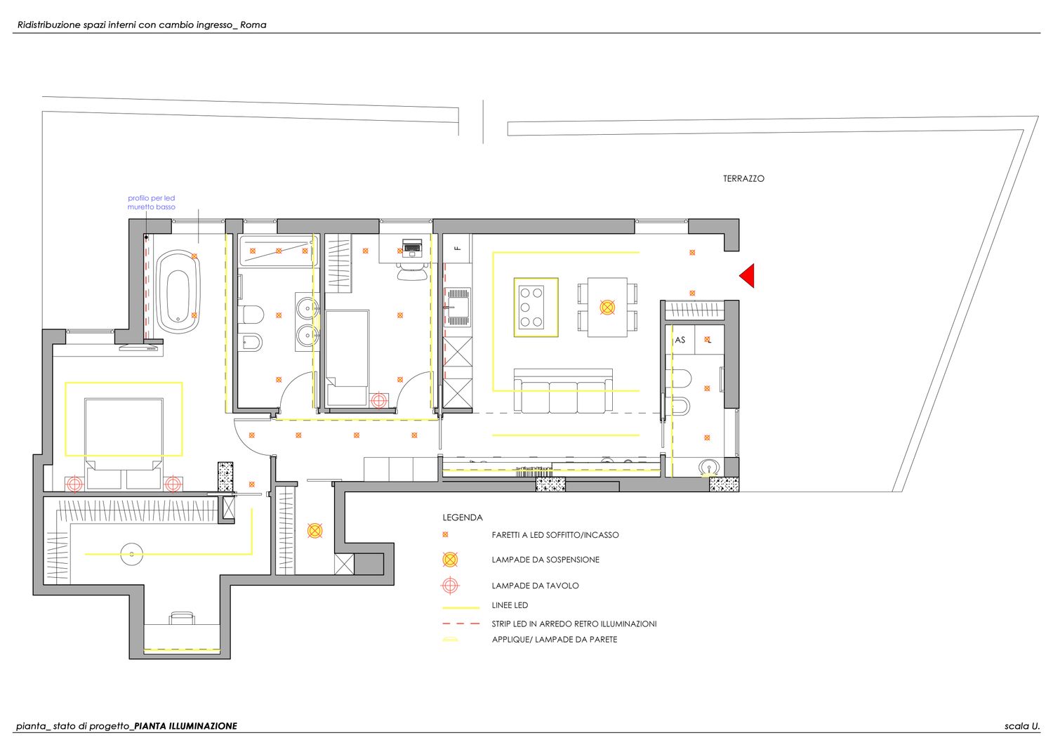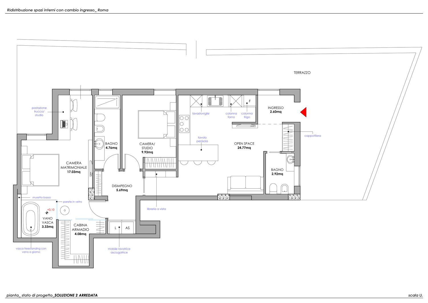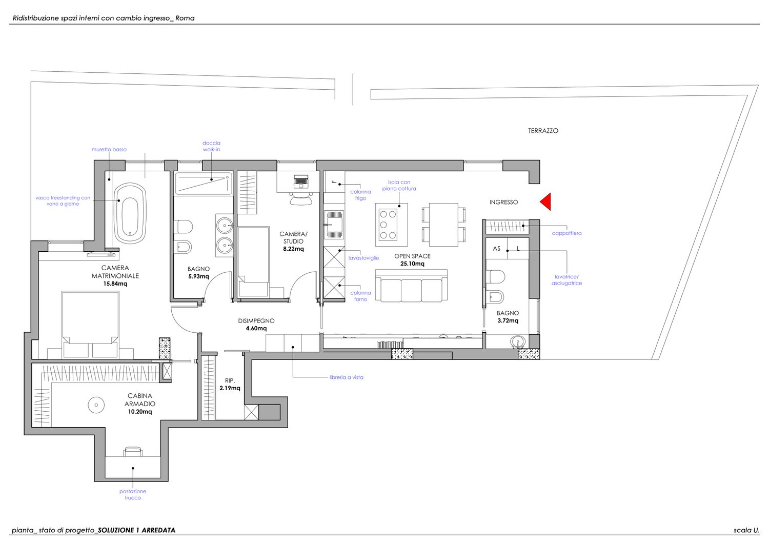 Il progetto nasce dalla sua esigenza di valorizzare la porzione più ampia del terrazzo, destinandola alla zona giorno con un ampio open space anziché alla zona notte.