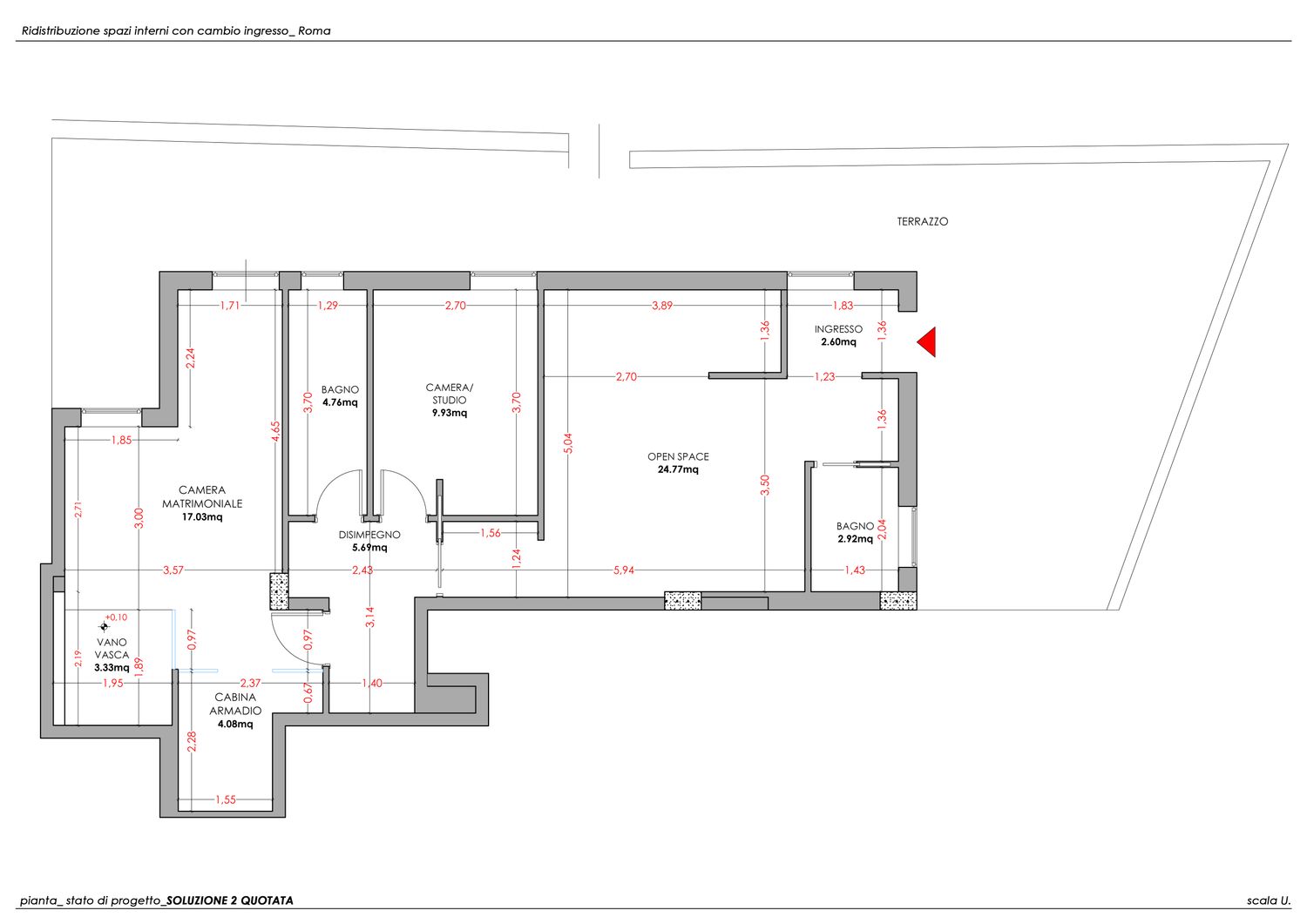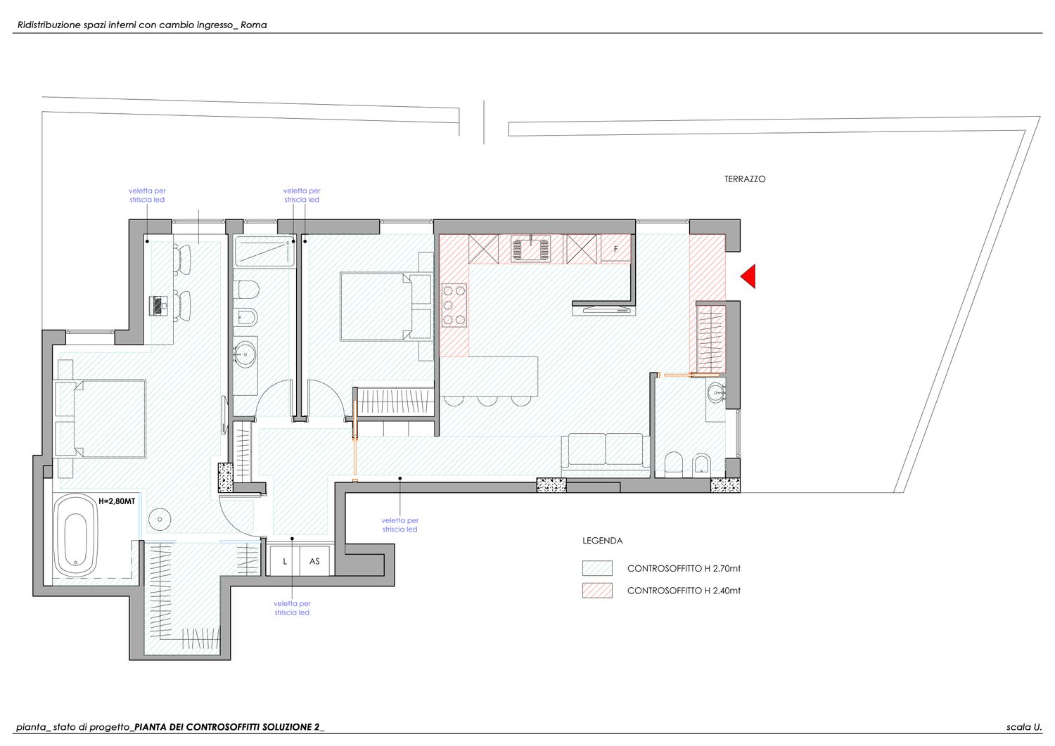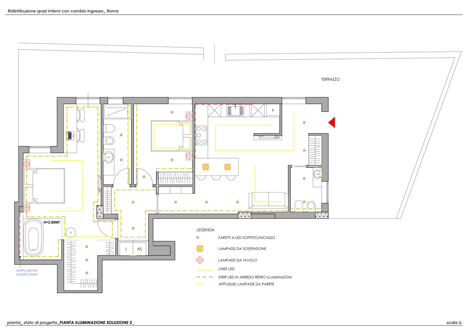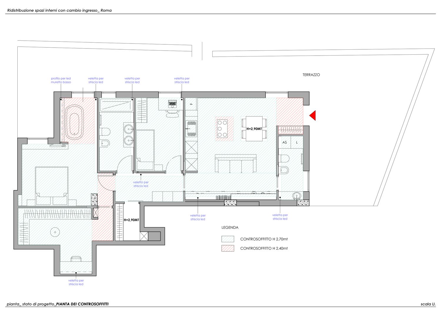 Il progetto nasce dalla sua esigenza di valorizzare la porzione più ampia del terrazzo, destinandola alla zona giorno con un ampio open space anziché alla zona notte.