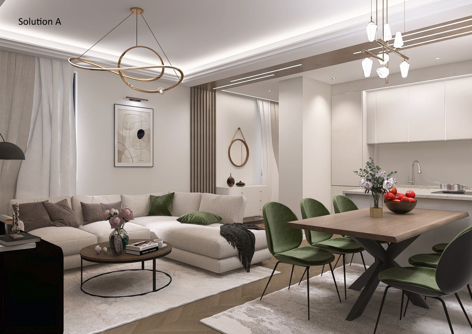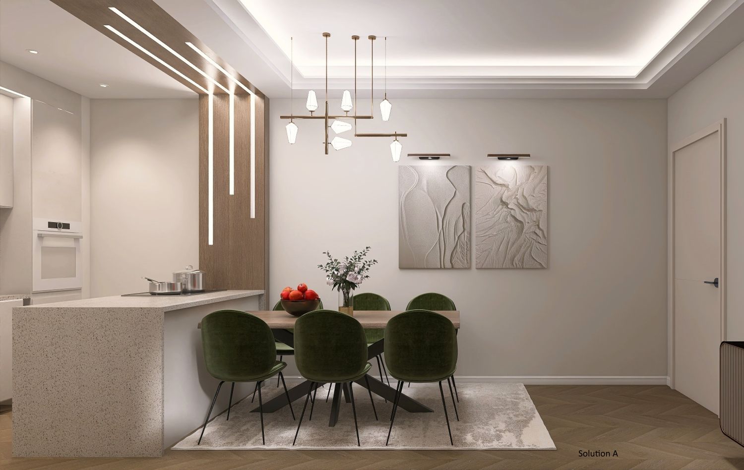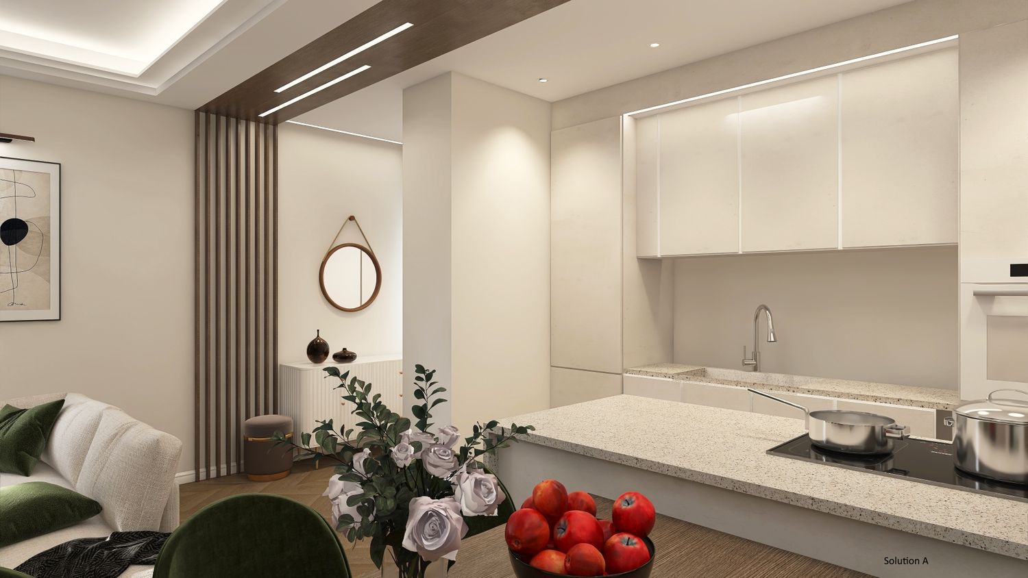 Overall, Solution A presents a complete rethinking of the apartment’s flow, turning structural challenges into opportunities and creating a layout that feels contemporary and balanced.
