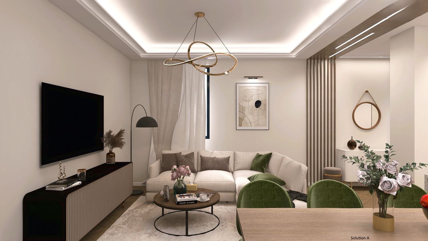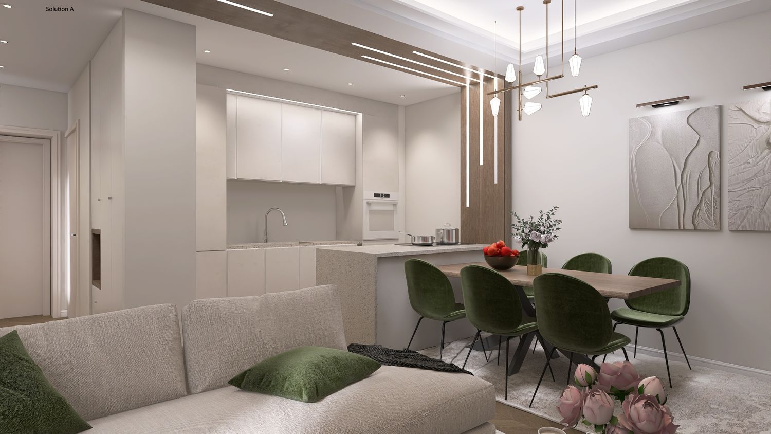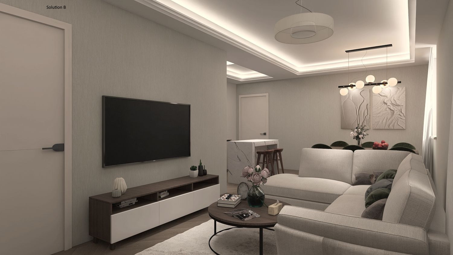 Overall, Solution A presents a complete rethinking of the apartment’s flow, turning structural challenges into opportunities and creating a layout that feels contemporary and balanced.