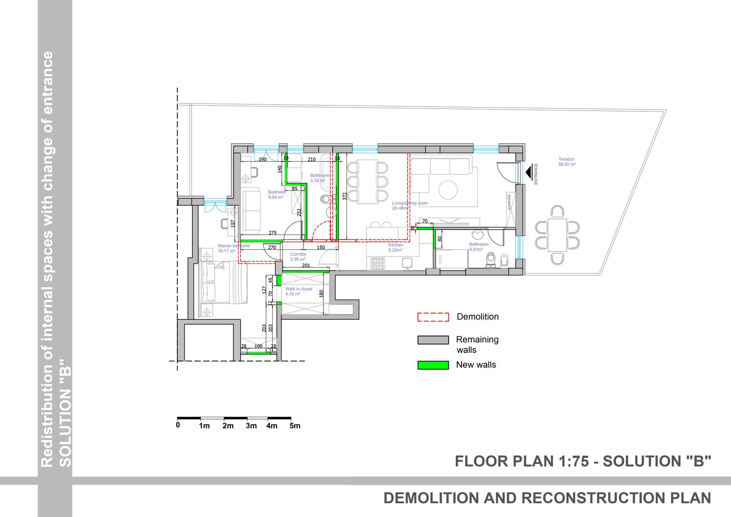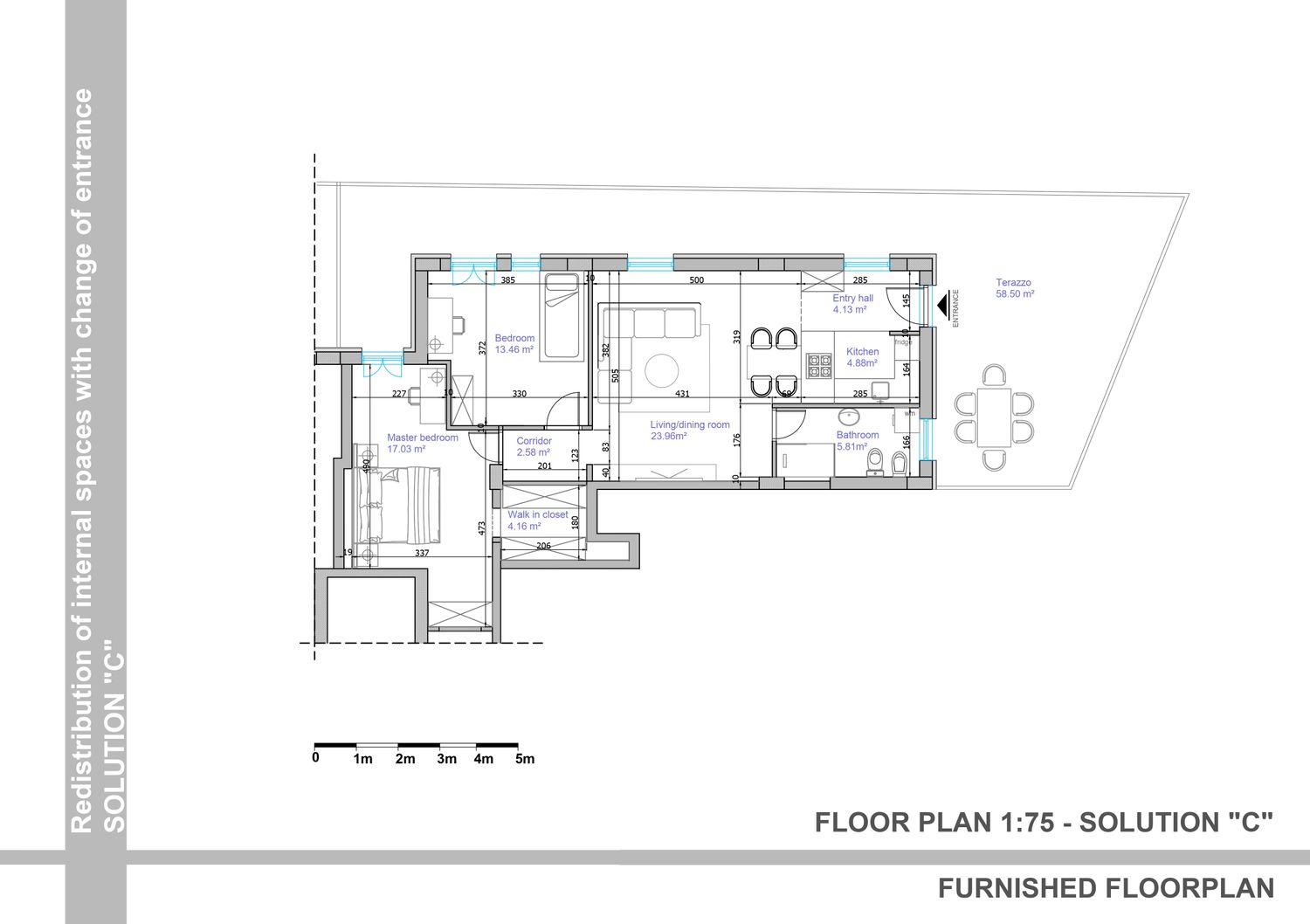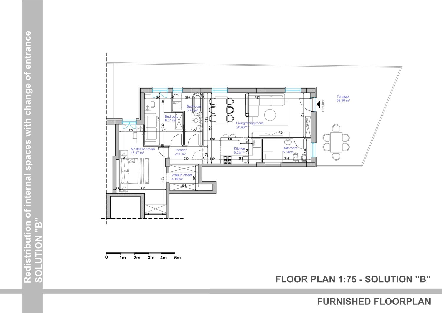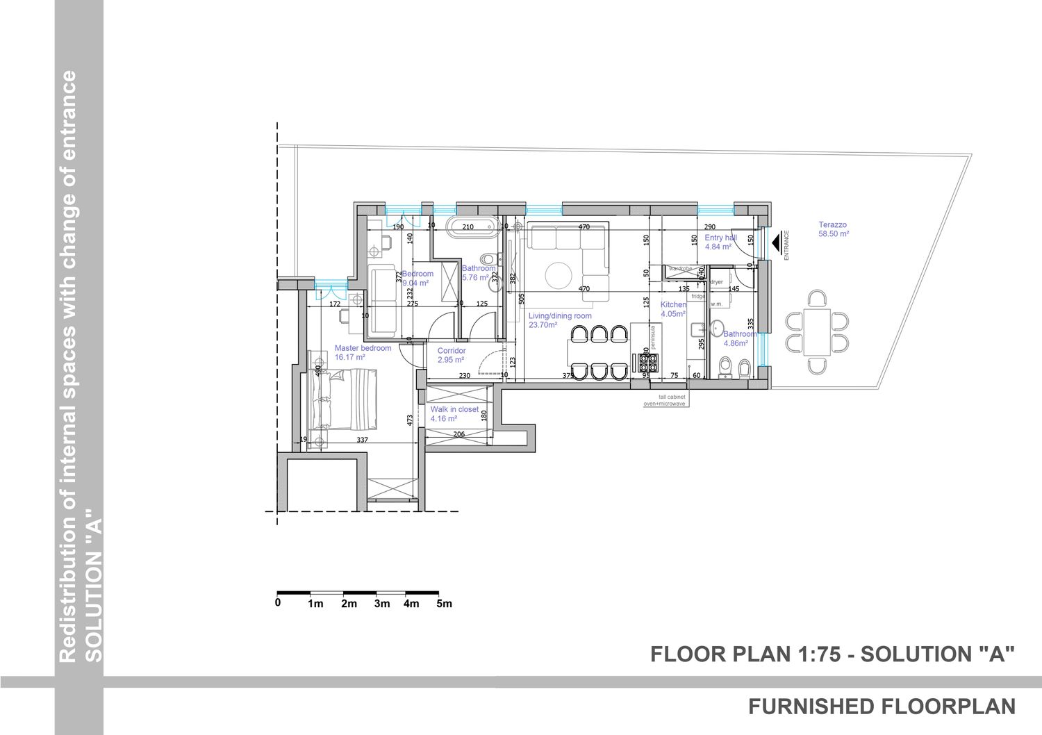 Solution A introduces a new entrance from the terrace, allowing the apartment to be reoriented naturally toward its new day zone. A compact yet efficient entry hall with a built-in wardrobe provides a defined threshold and much-needed storage. The existing bathroom is fully reconstructed, forming the backbone of the reorganized plumbing layout.