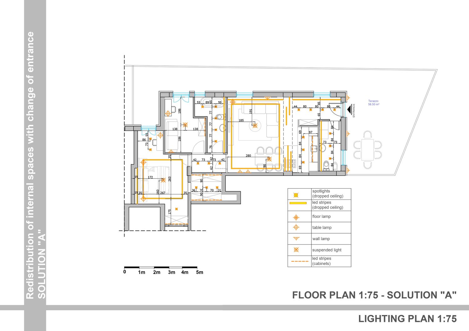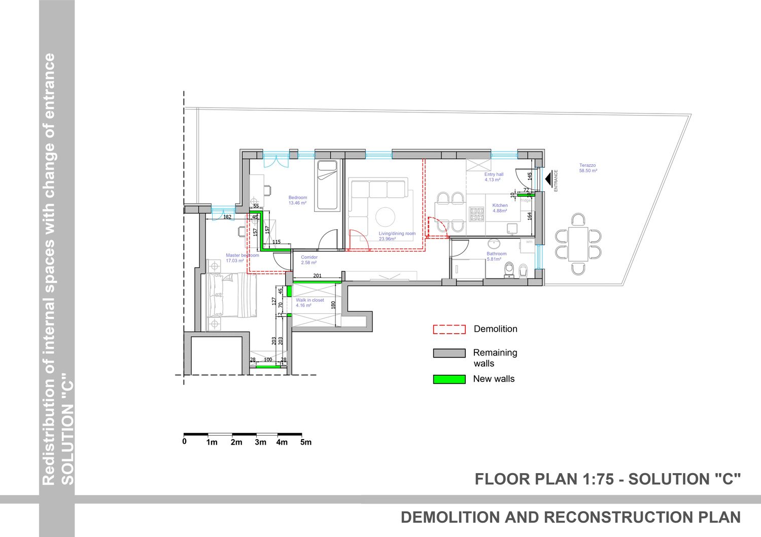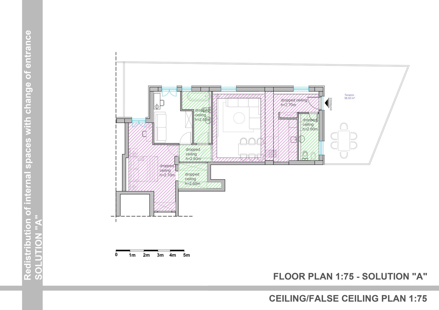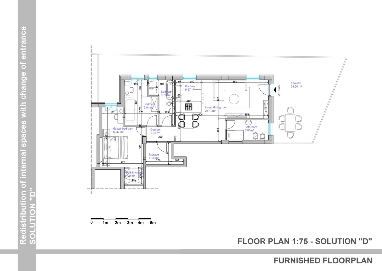 Solution A introduces a new entrance from the terrace, allowing the apartment to be reoriented naturally toward its new day zone. A compact yet efficient entry hall with a built-in wardrobe provides a defined threshold and much-needed storage. The existing bathroom is fully reconstructed, forming the backbone of the reorganized plumbing layout.