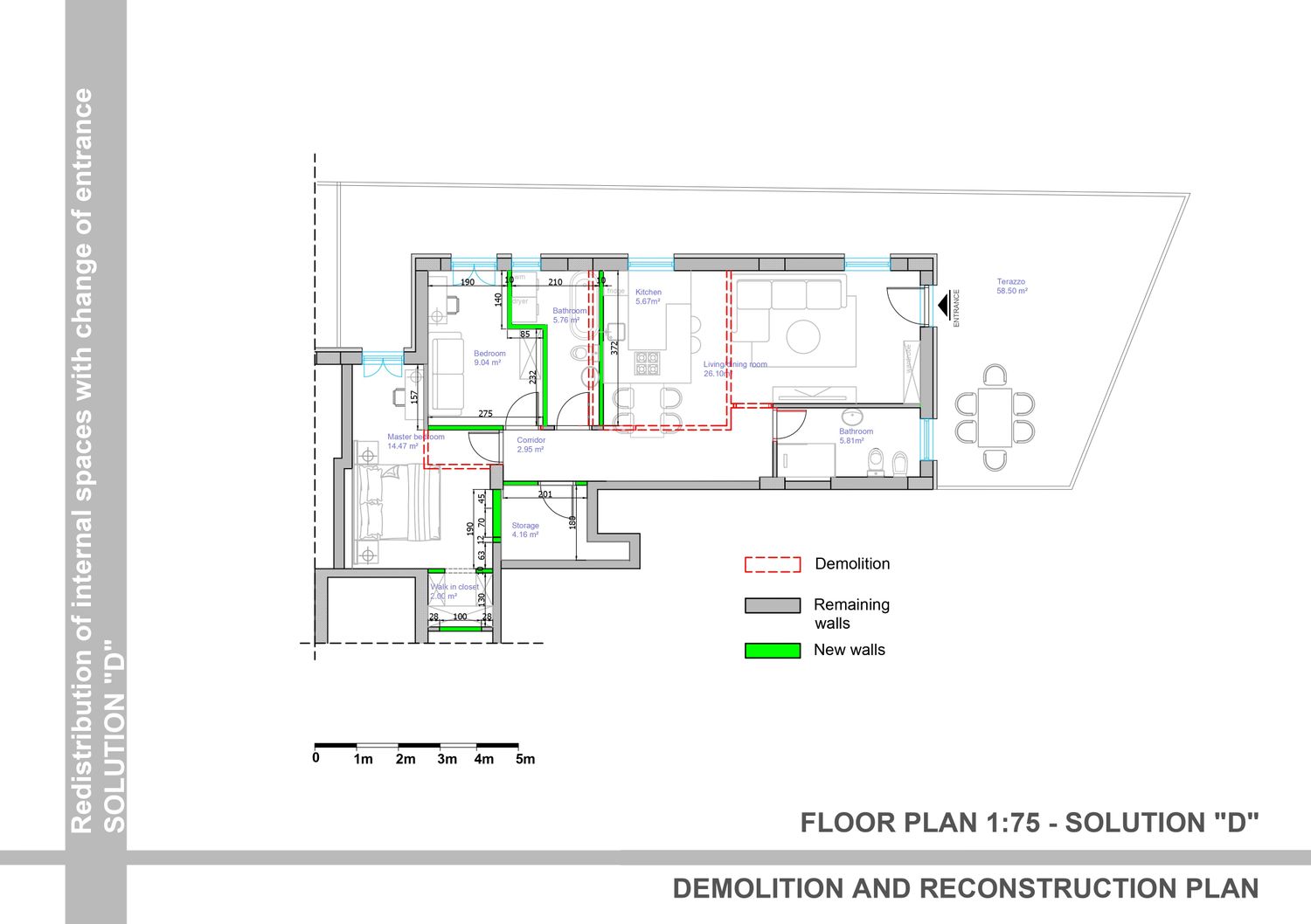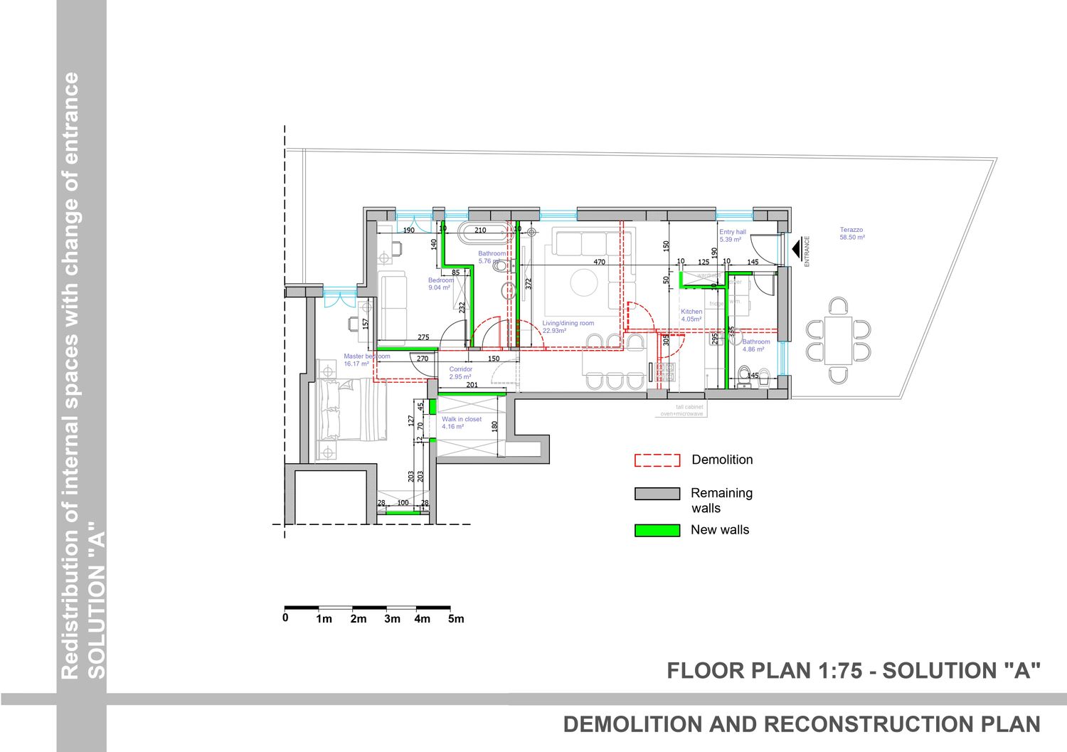 To support decision-making, a demolition and reconstruction plan accompanies every solution. These technical diagrams clearly present which elements are removed, altered, or newly built, allowing you to understand not only how the apartment will look but also what level of work each option requires. This transparent approach ensures that you can compare all four solutions—ranging from minimally invasive to fully transformative—and choose the one that best aligns with both your vision and practical considerations.