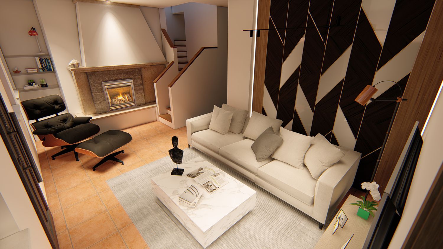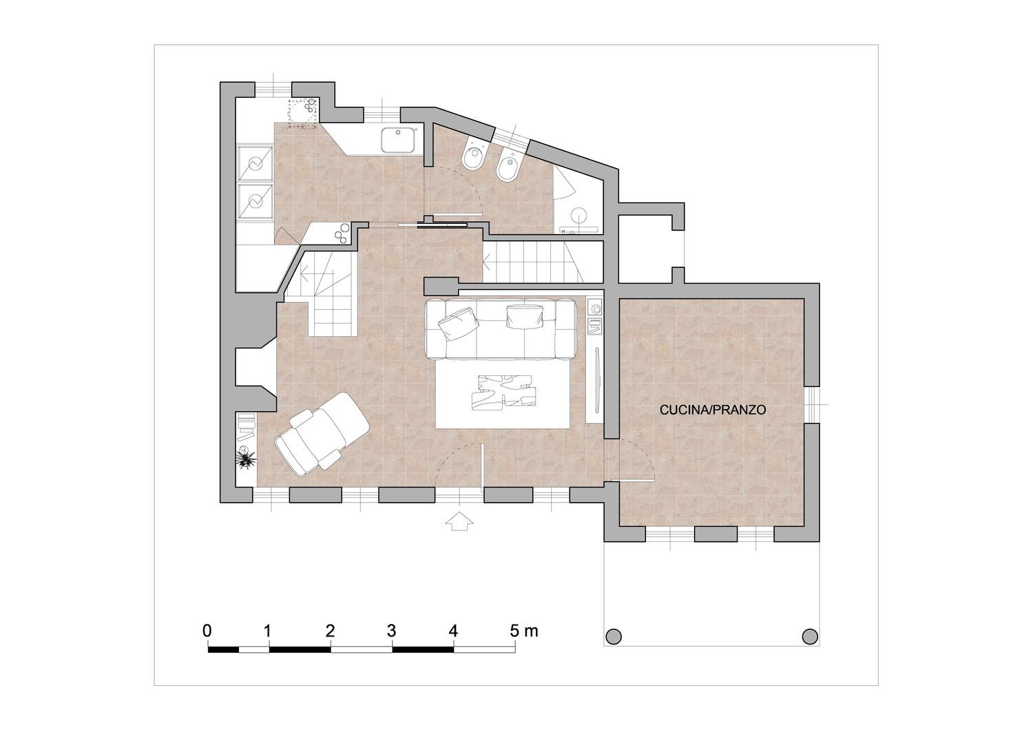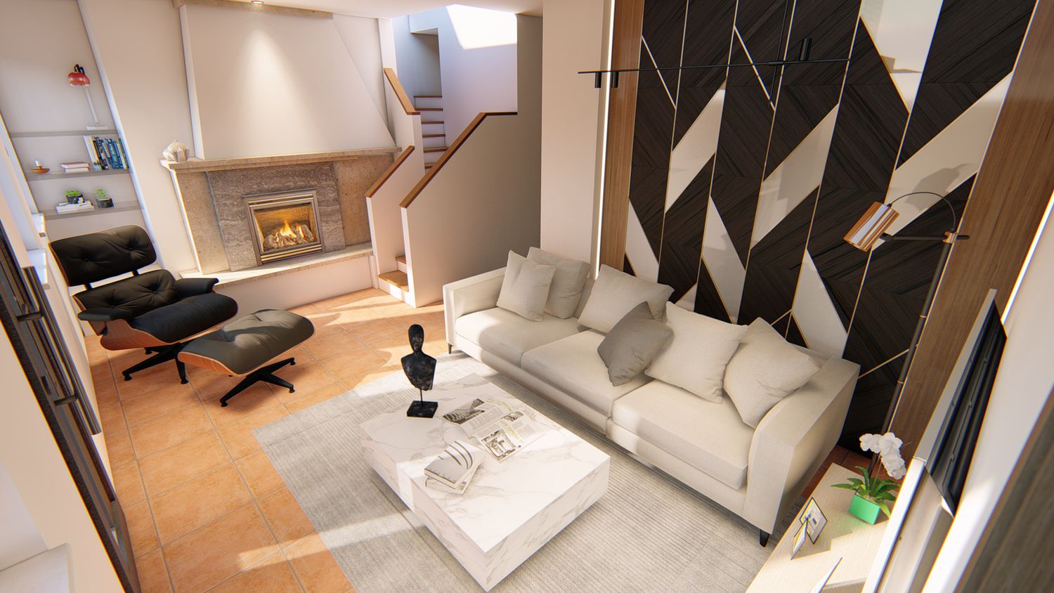 Anche il camino verrà rinnovato nei particolari di rivestimento, con un accostamento di top di travertino e granito verde-grigio, adatti a ravvivare il tono brunito e caldo del cotto di pavimento e top dei corrimano della scala, che saranno da conservare e valorizzare, per lasciare all'ambiente la propria atmosfera calda e famigliare.