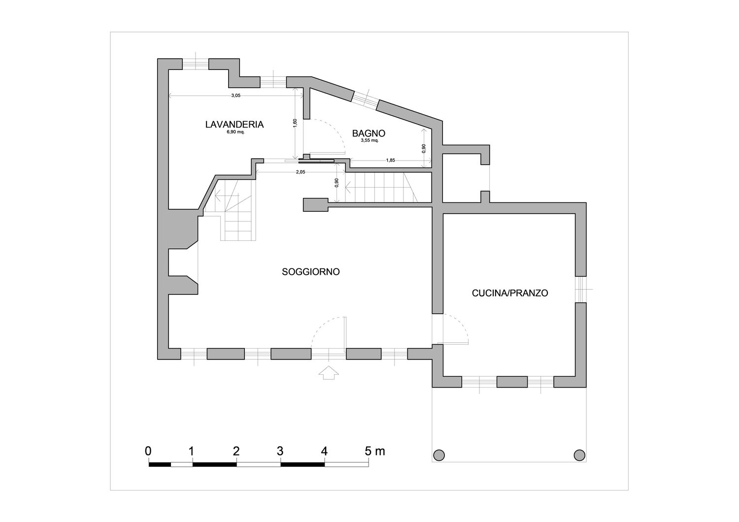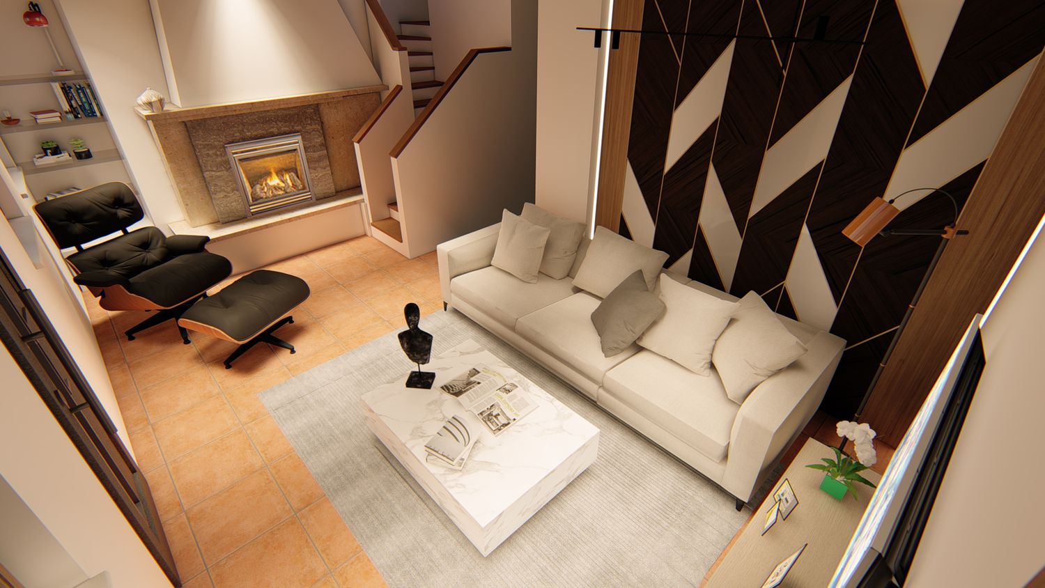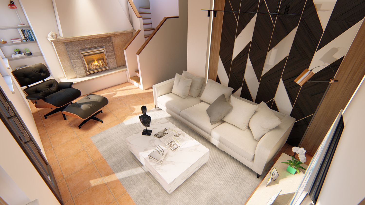 Anche il camino verrà rinnovato nei particolari di rivestimento, con un accostamento di top di travertino e granito verde-grigio, adatti a ravvivare il tono brunito e caldo del cotto di pavimento e top dei corrimano della scala, che saranno da conservare e valorizzare, per lasciare all'ambiente la propria atmosfera calda e famigliare.