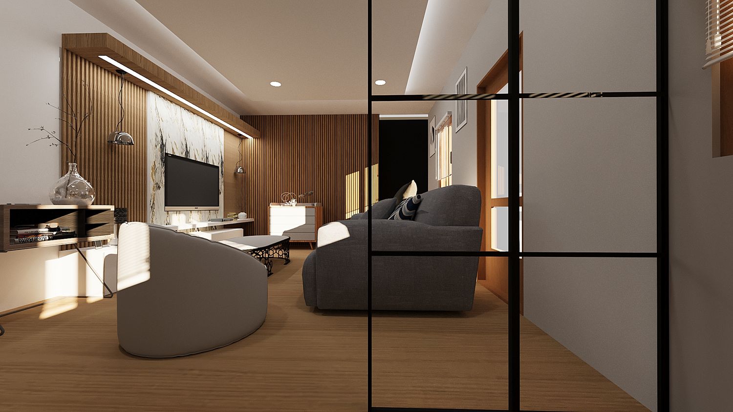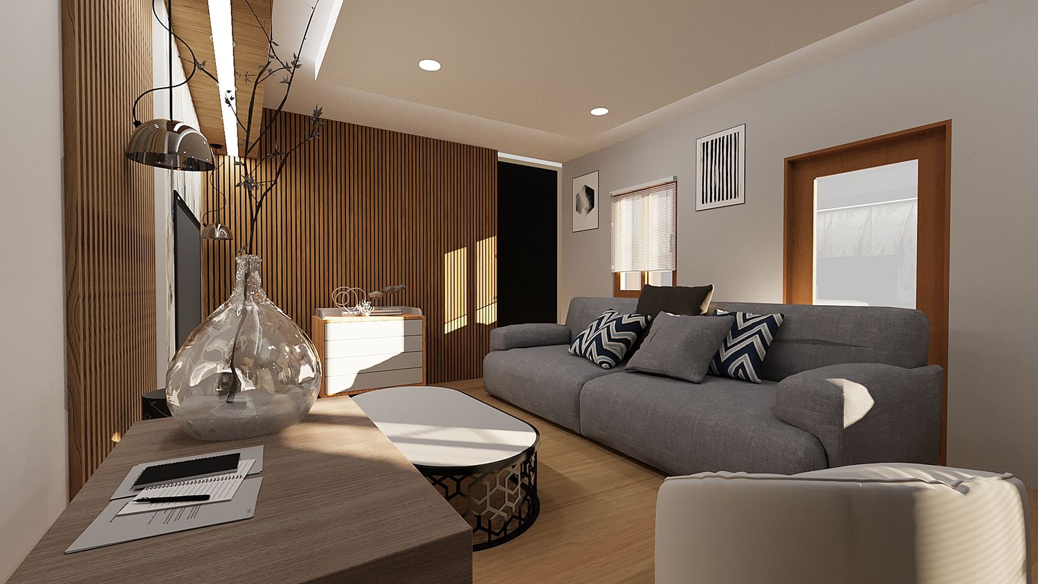 This 3D interior living room design adopts a modern concept that emphasizes comfort and functionality. Bright and neutral color tones are applied to create a spacious, clean, and welcoming atmosphere. The layout is carefully arranged to support daily activities while maintaining a visually balanced and harmonious space. Natural lighting is maximized to enhance the sense of openness, while modern furniture and simple design elements reinforce a contemporary aesthetic that feels warm and comfortable for its occupants.