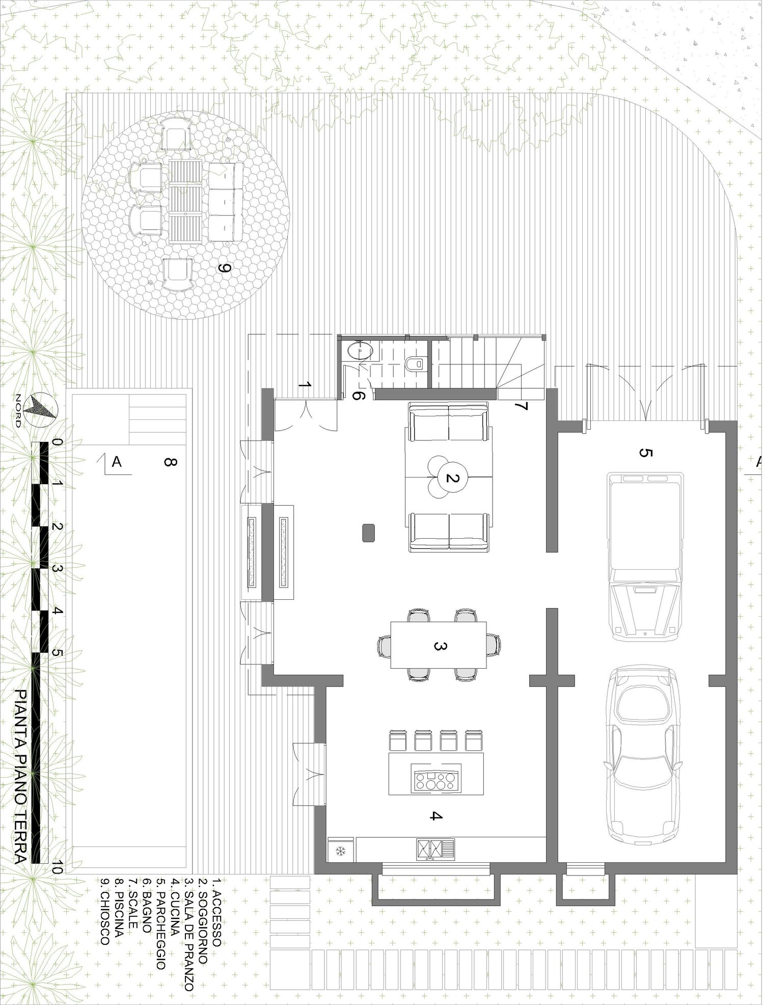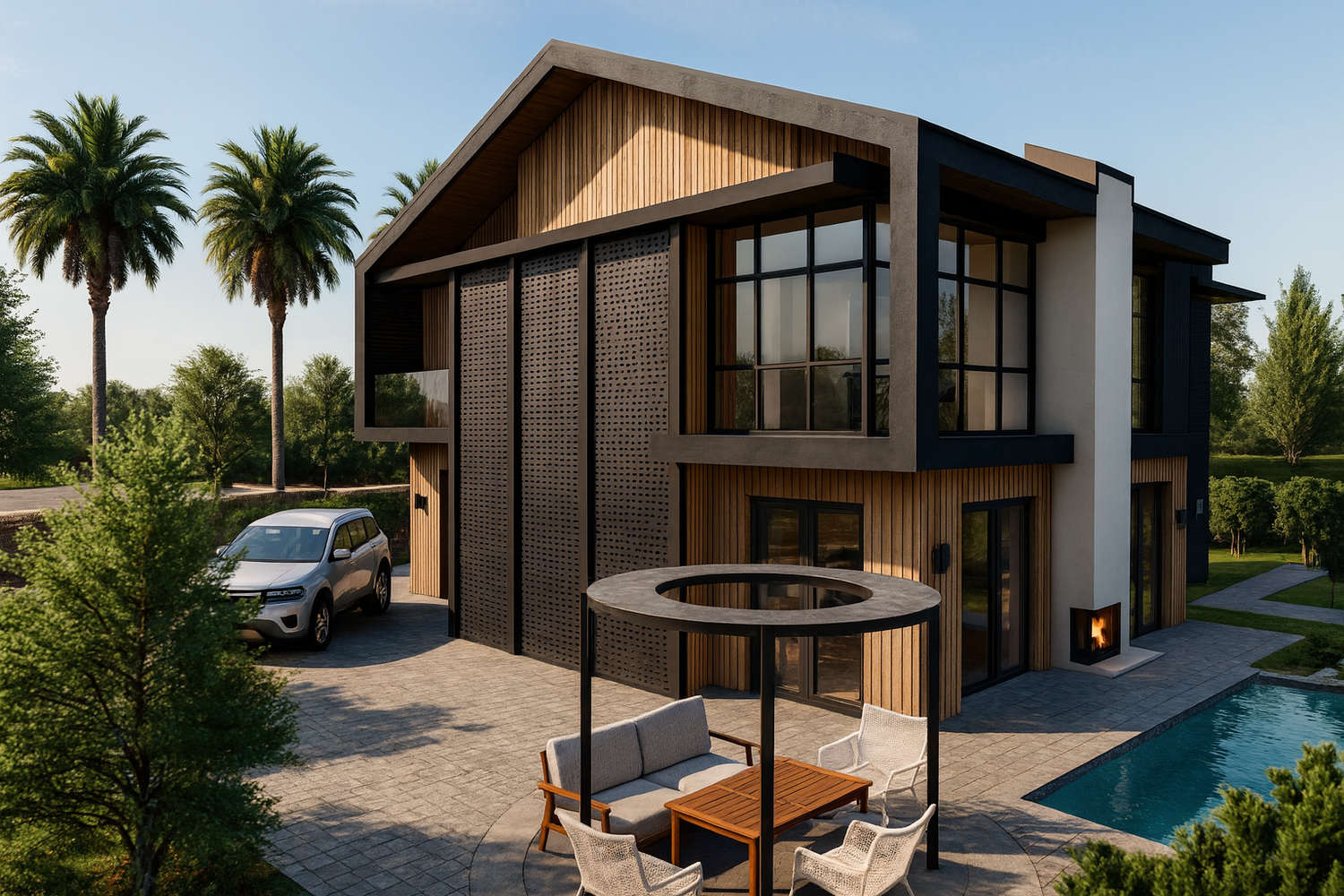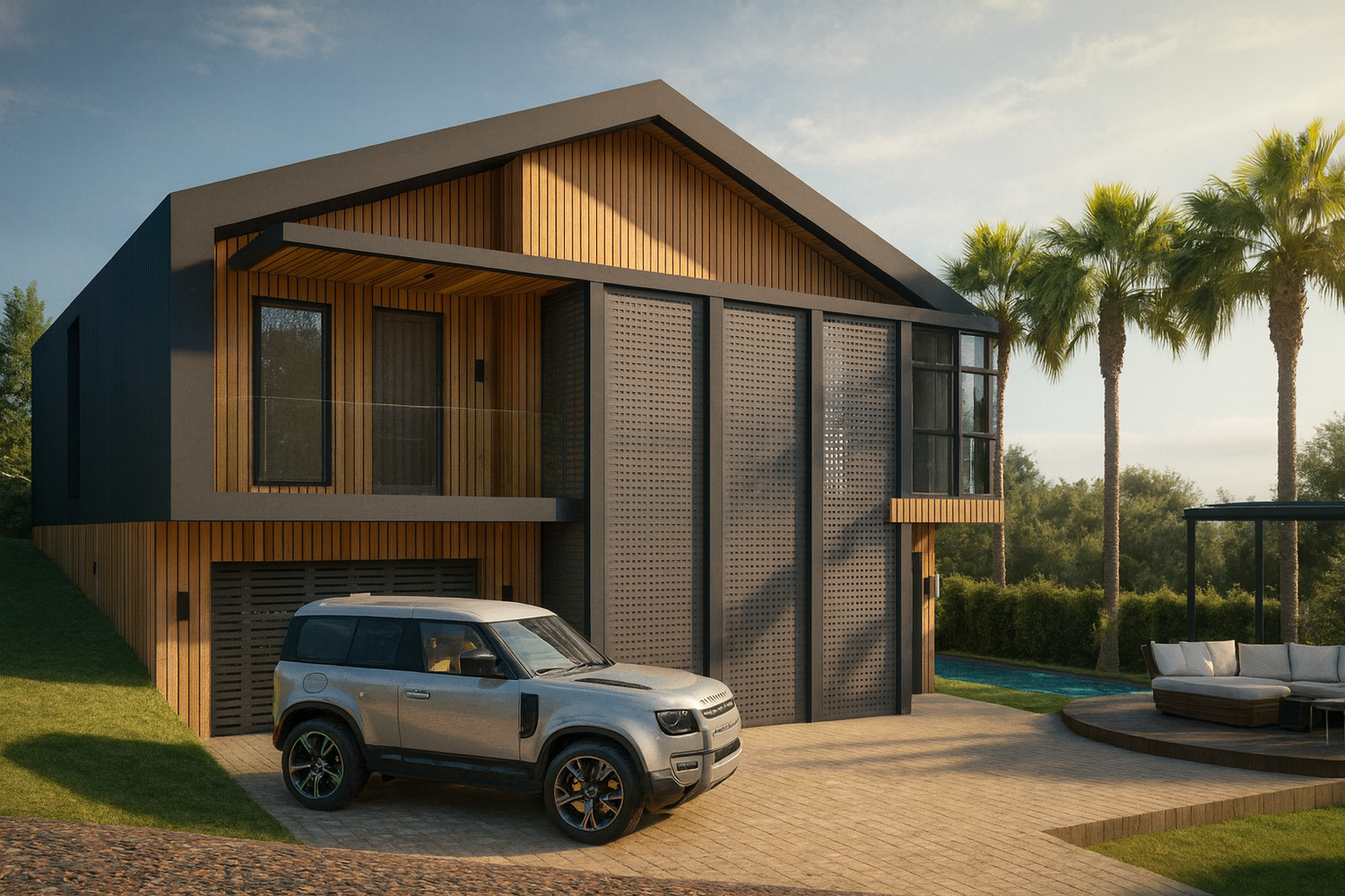 En el exterior, se propone crear una zona de relax con piscina, orientada al sur hacia el valle, teniendo en cuenta los desniveles del terreno circundante.