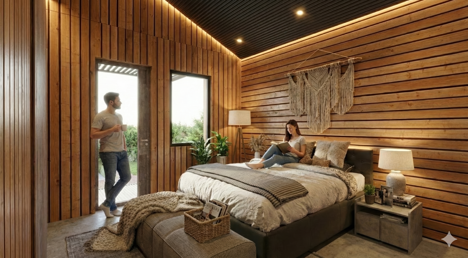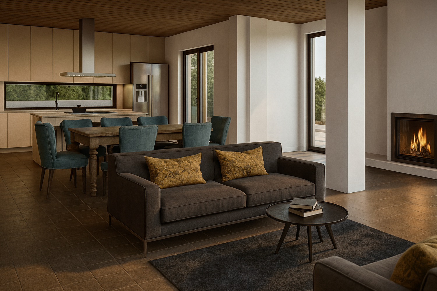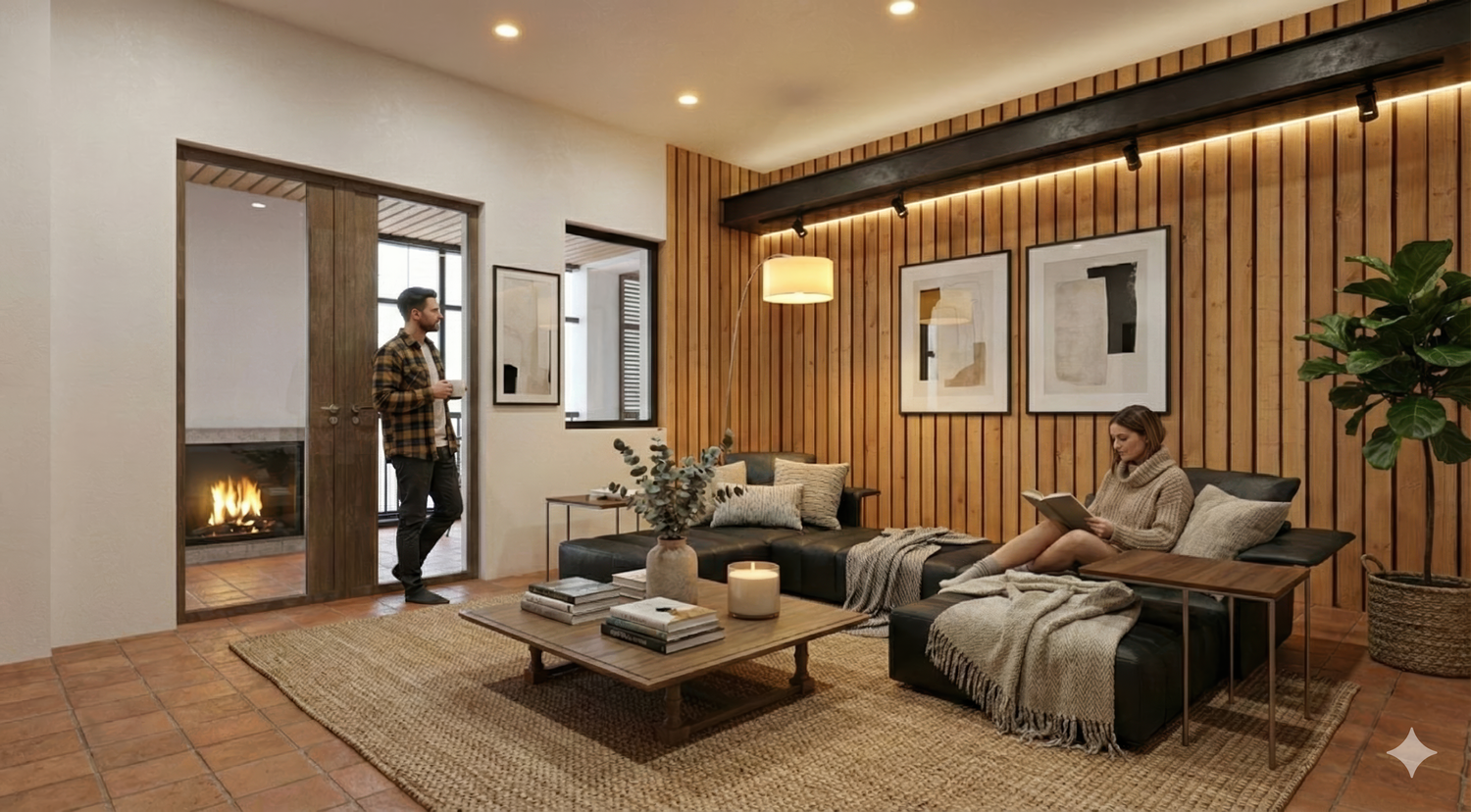 En el exterior, se propone crear una zona de relax con piscina, orientada al sur hacia el valle, teniendo en cuenta los desniveles del terreno circundante.