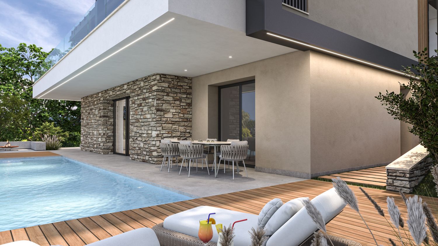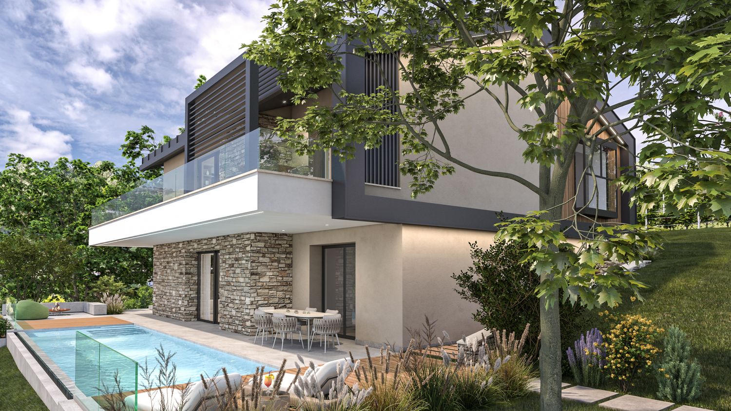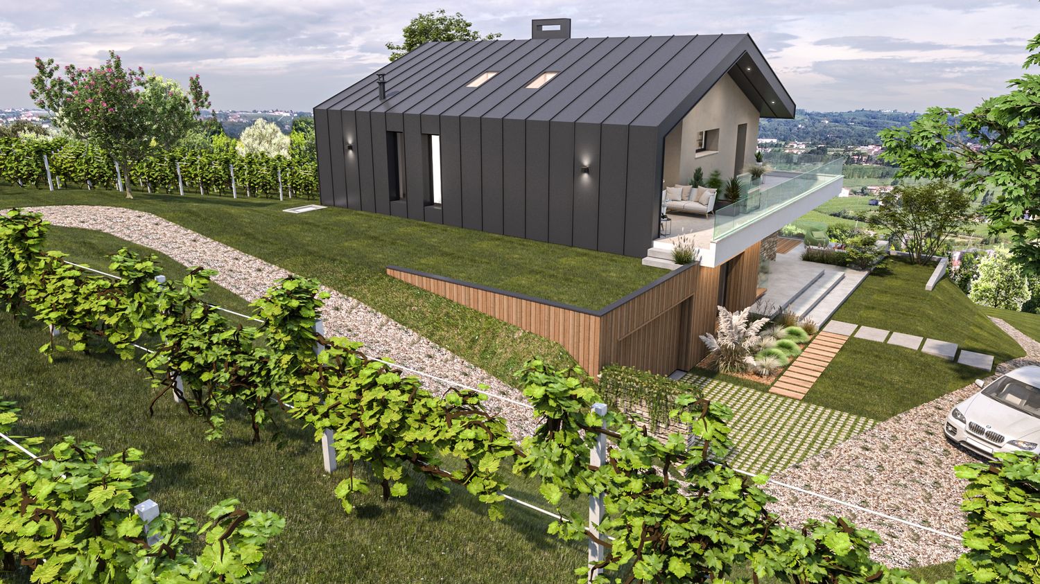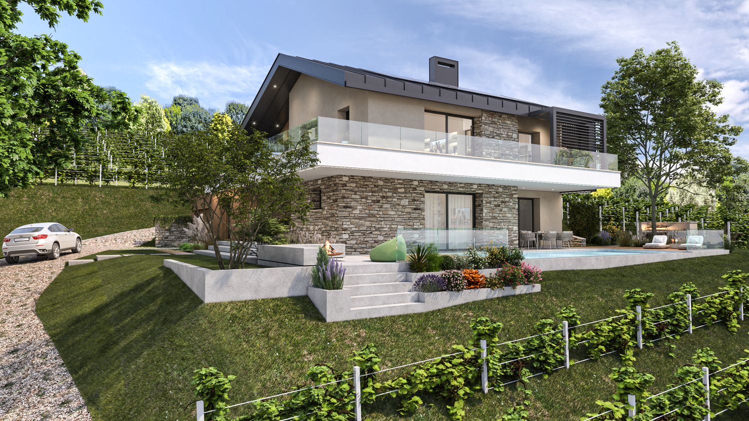 Gli spazi esterni sono progettati per integrarsi nel contesto collinare, attraverso l’uso di vegetazioni autoctone, materiali naturali e un’organizzazione morbida dei terrazzamenti. L’area relax a sud ospita una piscina rettangolare a sfioro visivo, studiata per dialogare con la linea dell’orizzonte e con i vigneti circostanti. L’involucro è progettato per garantire efficienza energetica, comfort termico e durabilità, con particolare attenzione alla ventilazione naturale e alla protezione solare mediante frangisole e sporgenze calibrate.